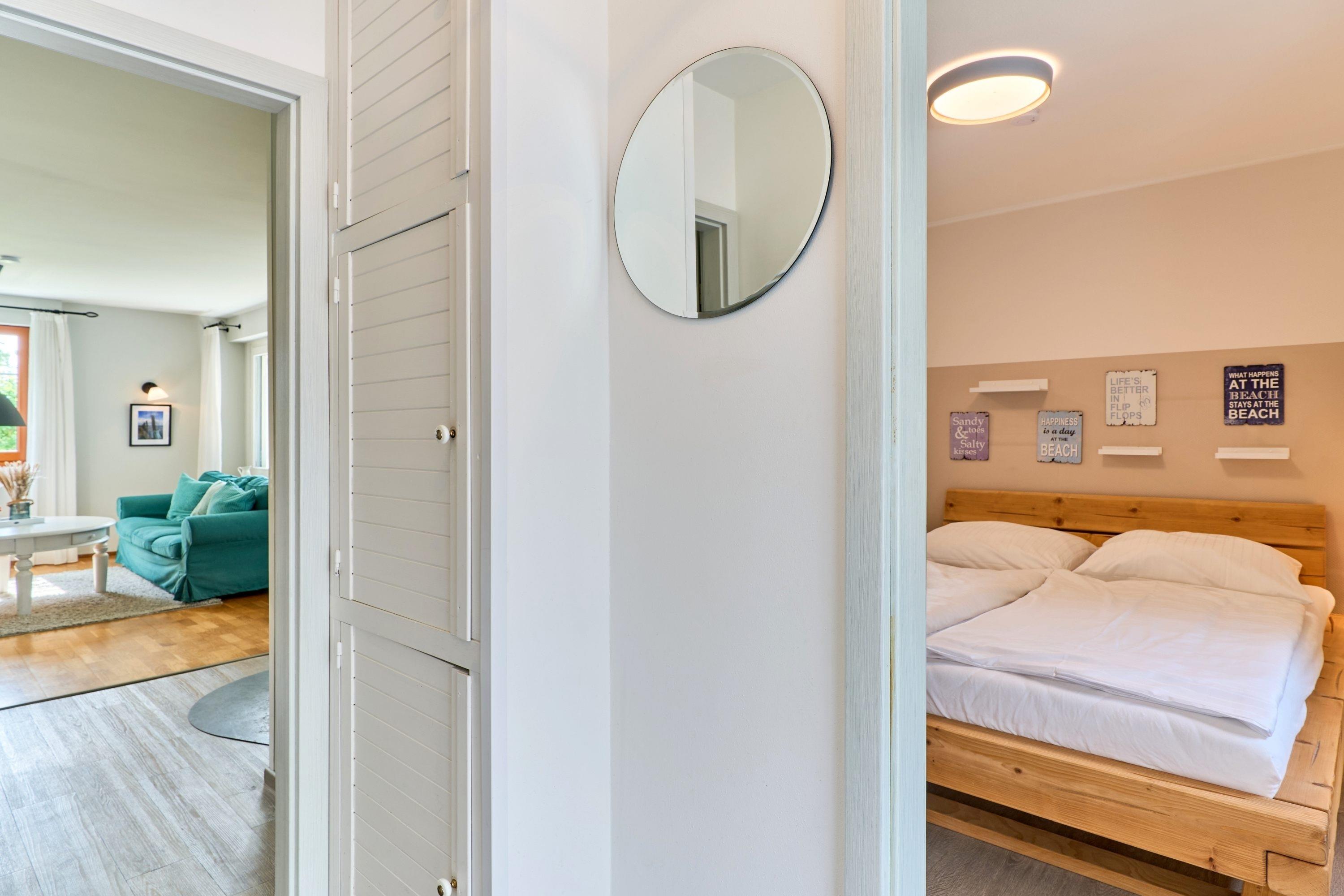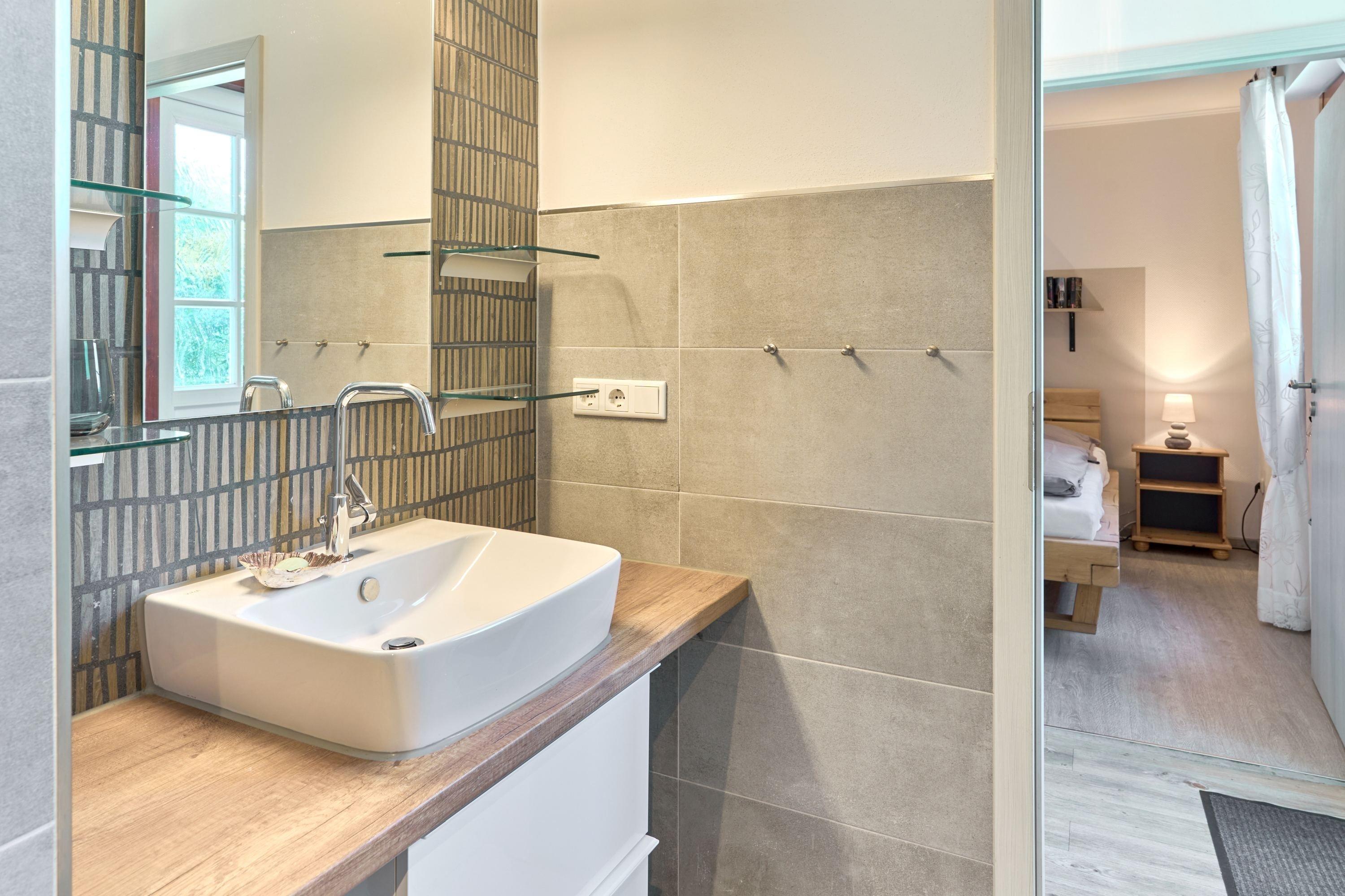 Über einen hellen Flur gelangt ihr ins moderne Bad mit ebenerdiger Dusche und in das Schlafzimmer mit komfortablem