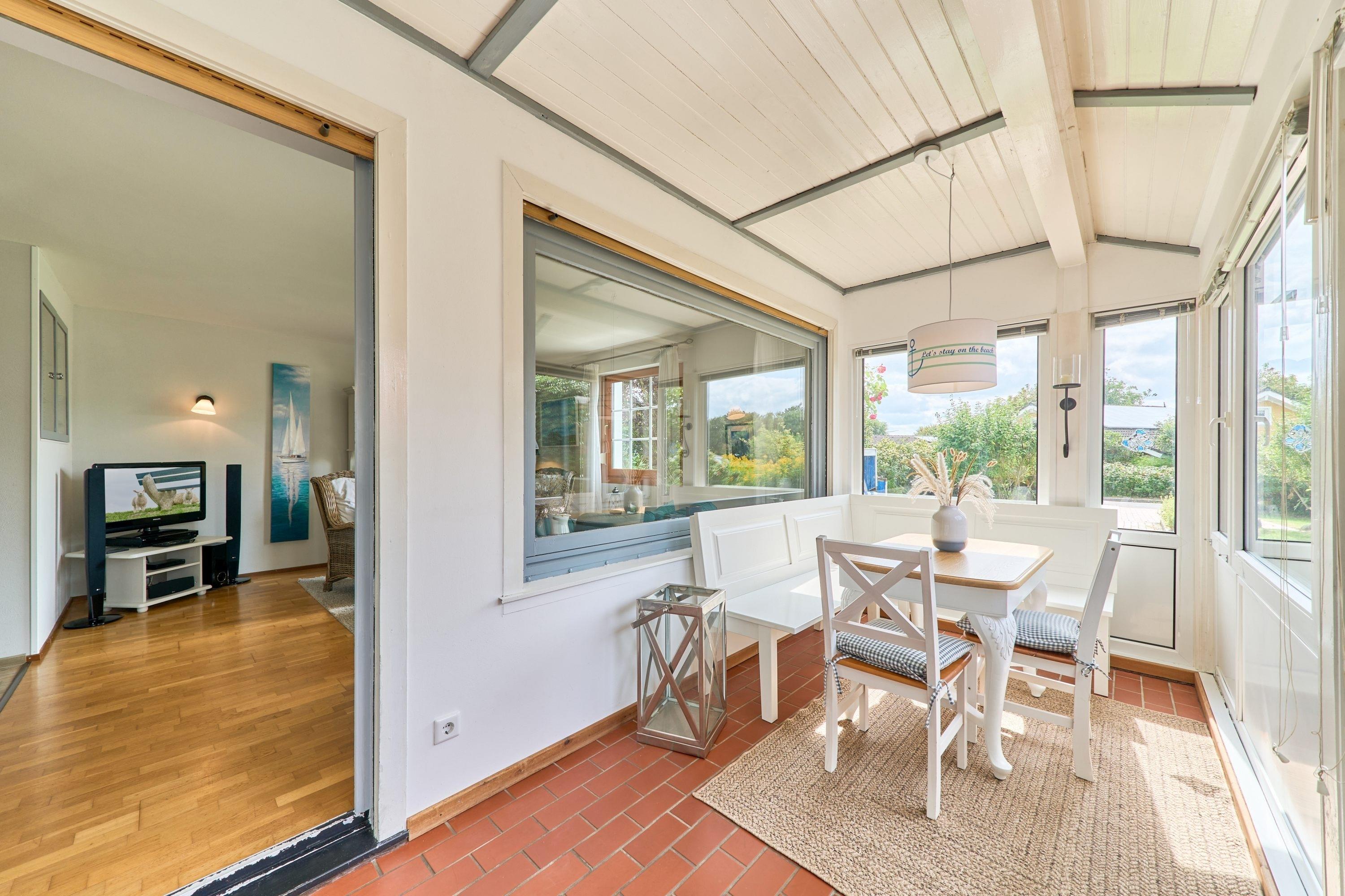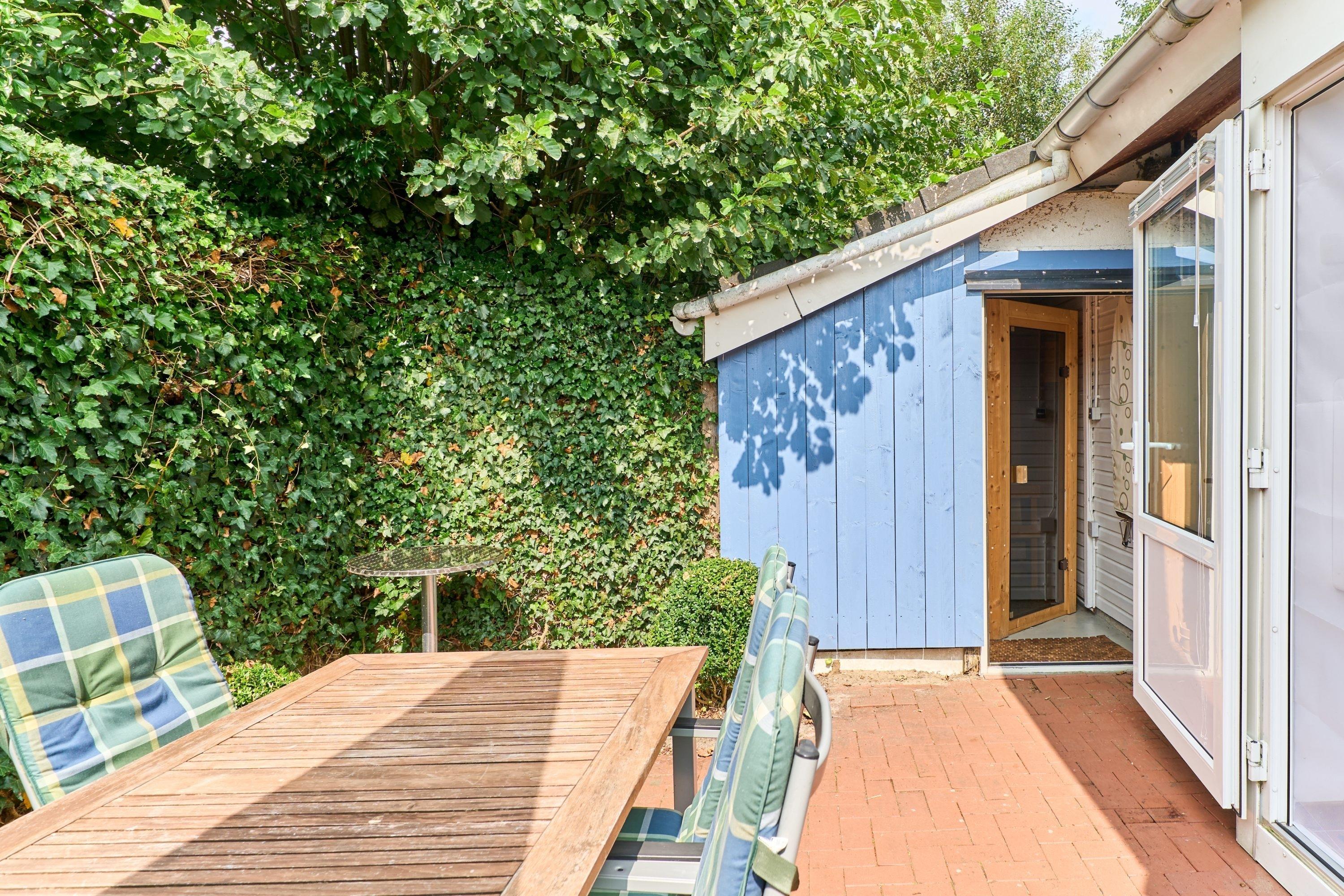 Vor dem Wintergarten liegt die nicht einsehbare Terrasse, von der ihr direkten Zugang zur hauseigenen Sauna habt. Und wenn