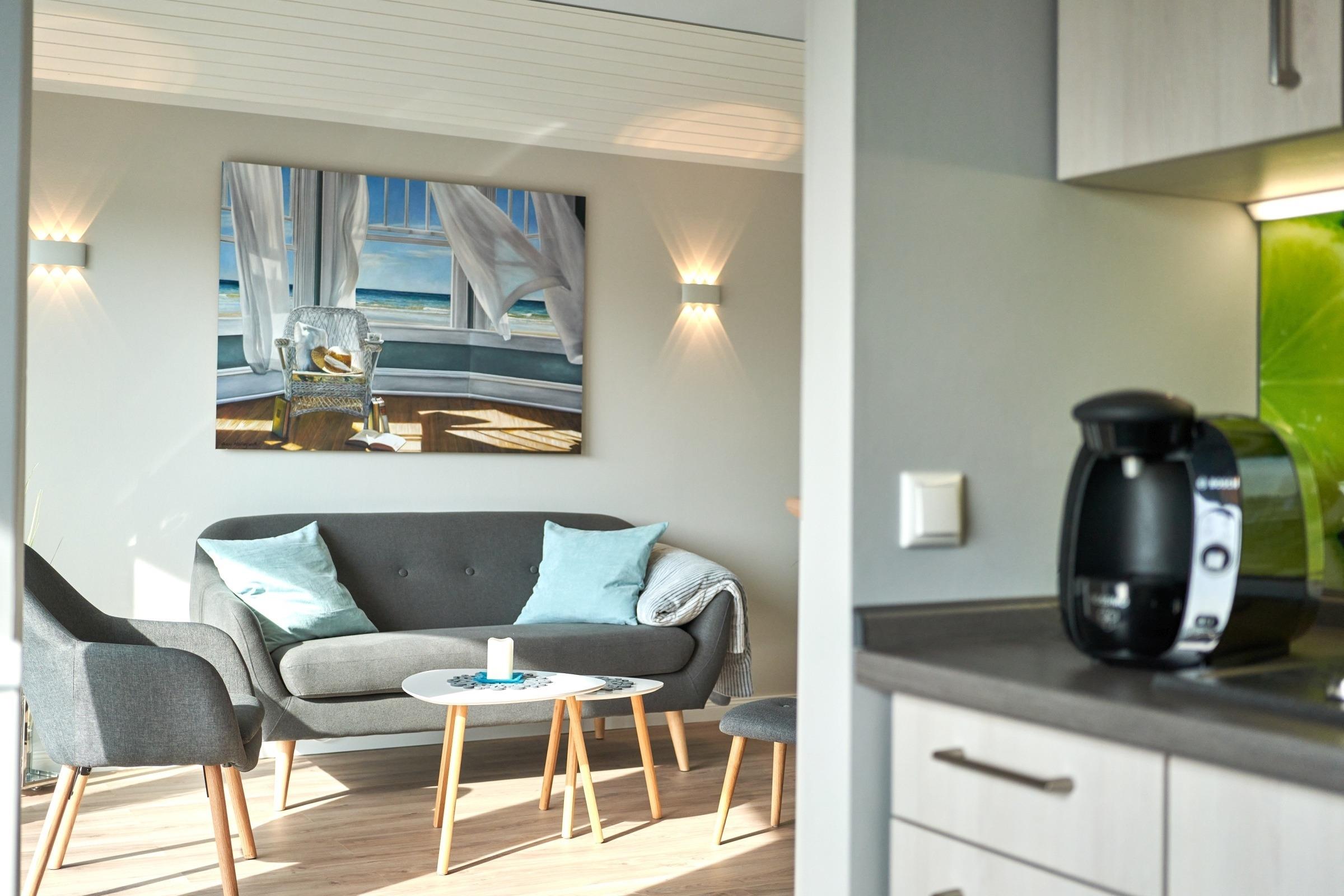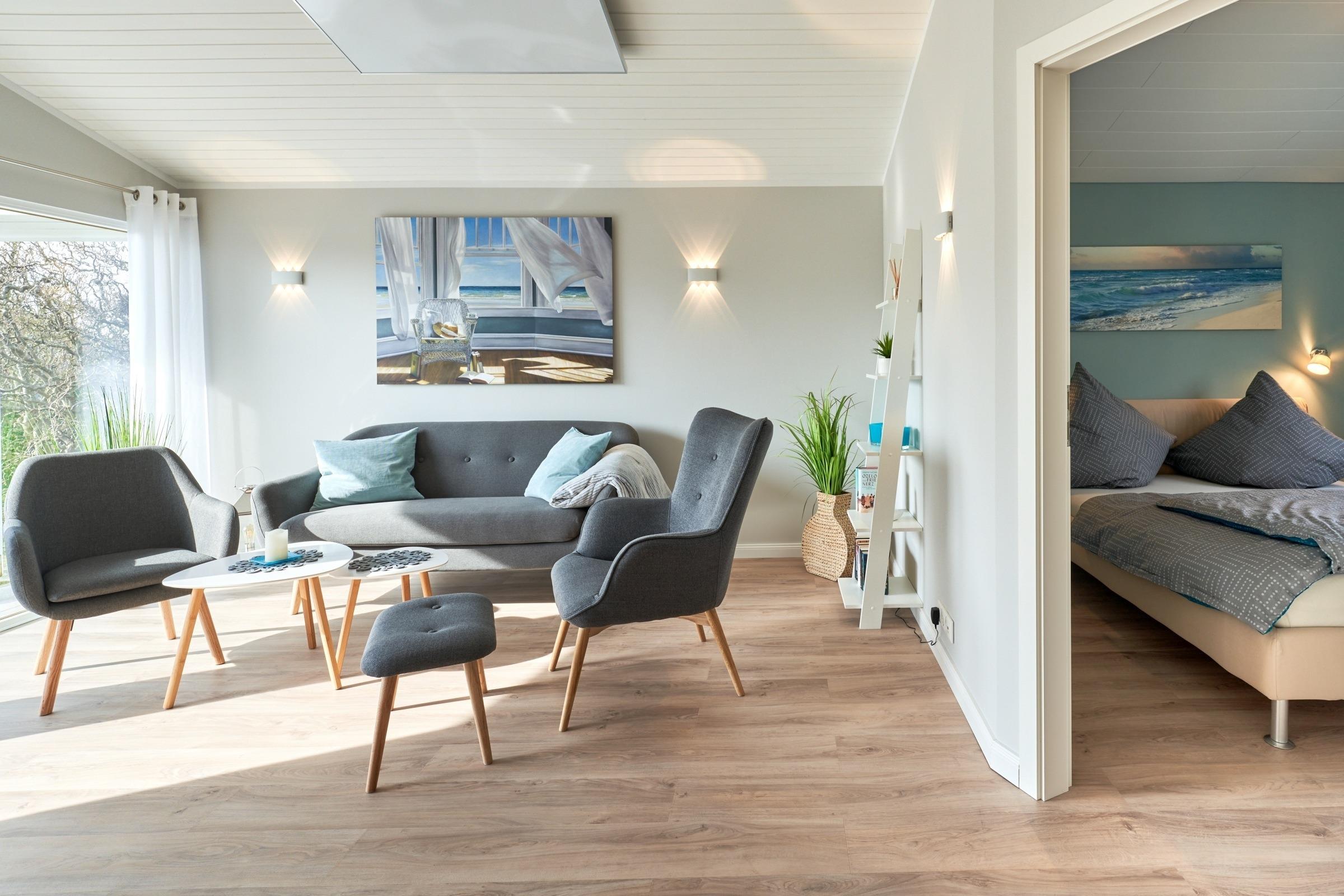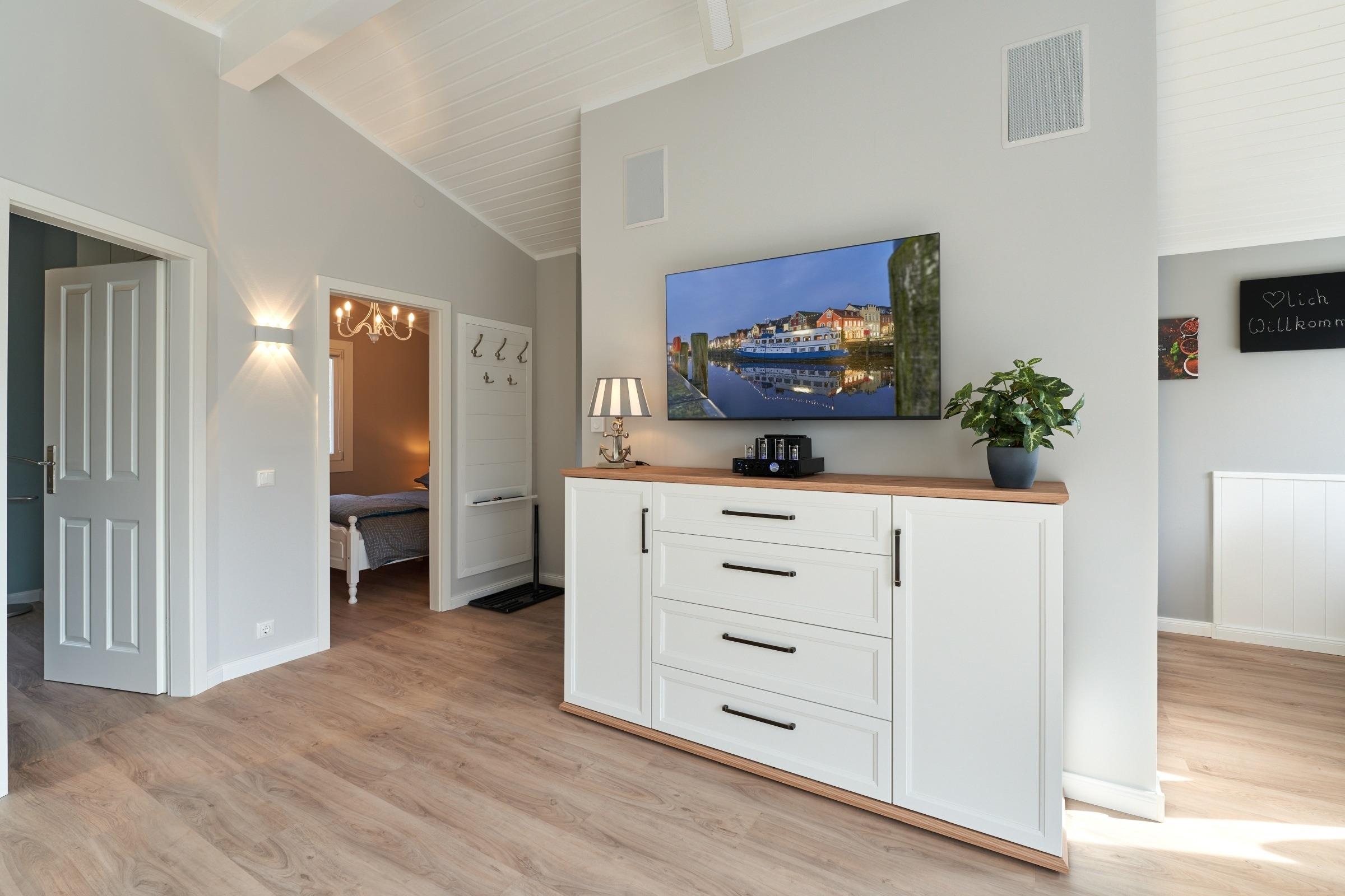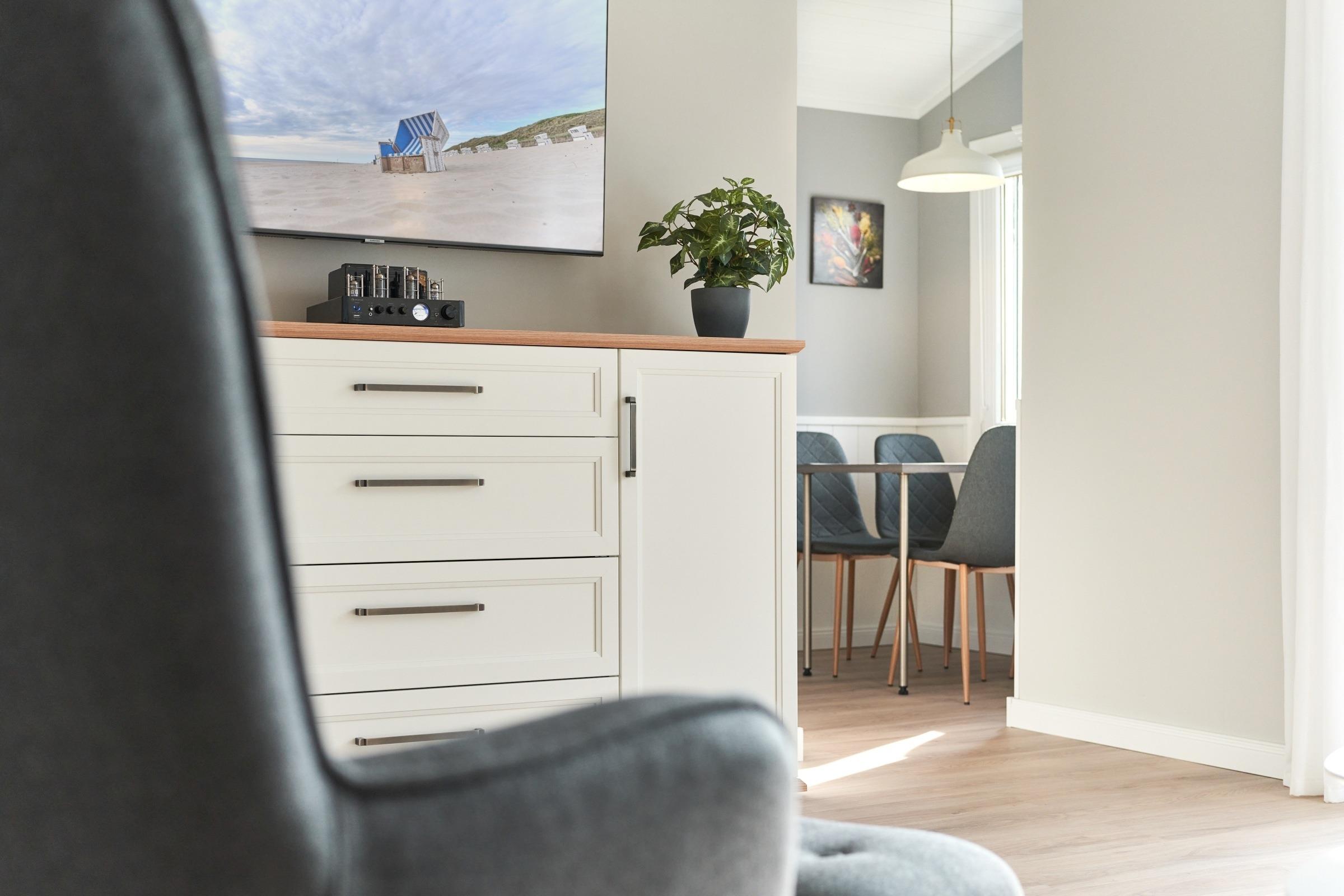im Strandkorb die Seele baumeln lassen können. Für gemütliche Stunden bei schlechtem Wetter sorgt der 50-Zoll-Smart-TV