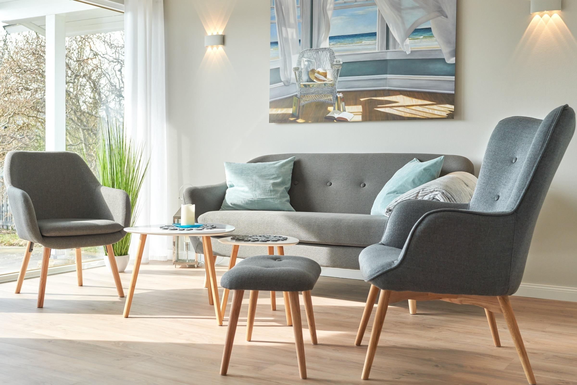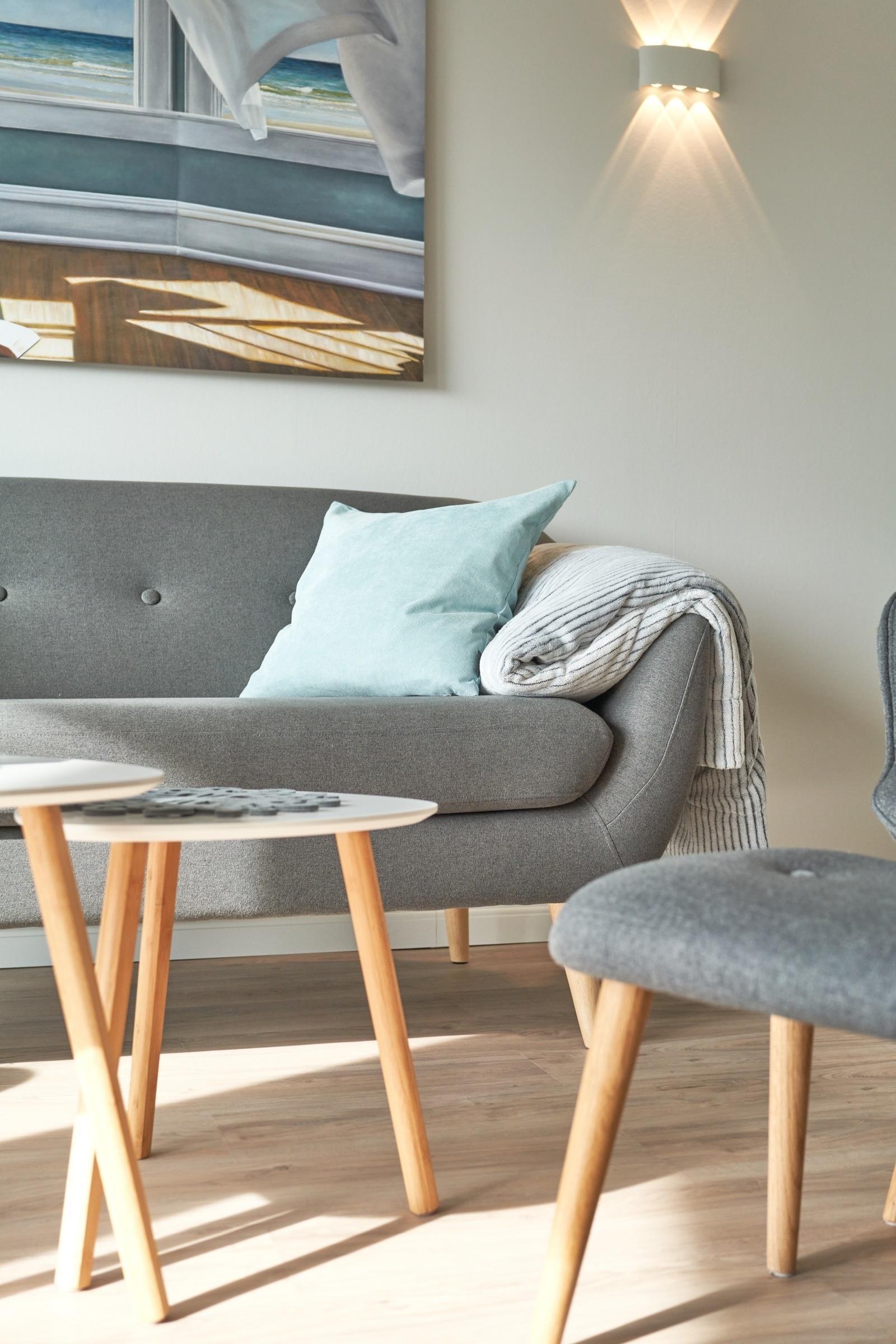 Das helle und stilvoll eingerichtete Wohnzimmer lädt mit seiner gemütlichen Sitzgruppe