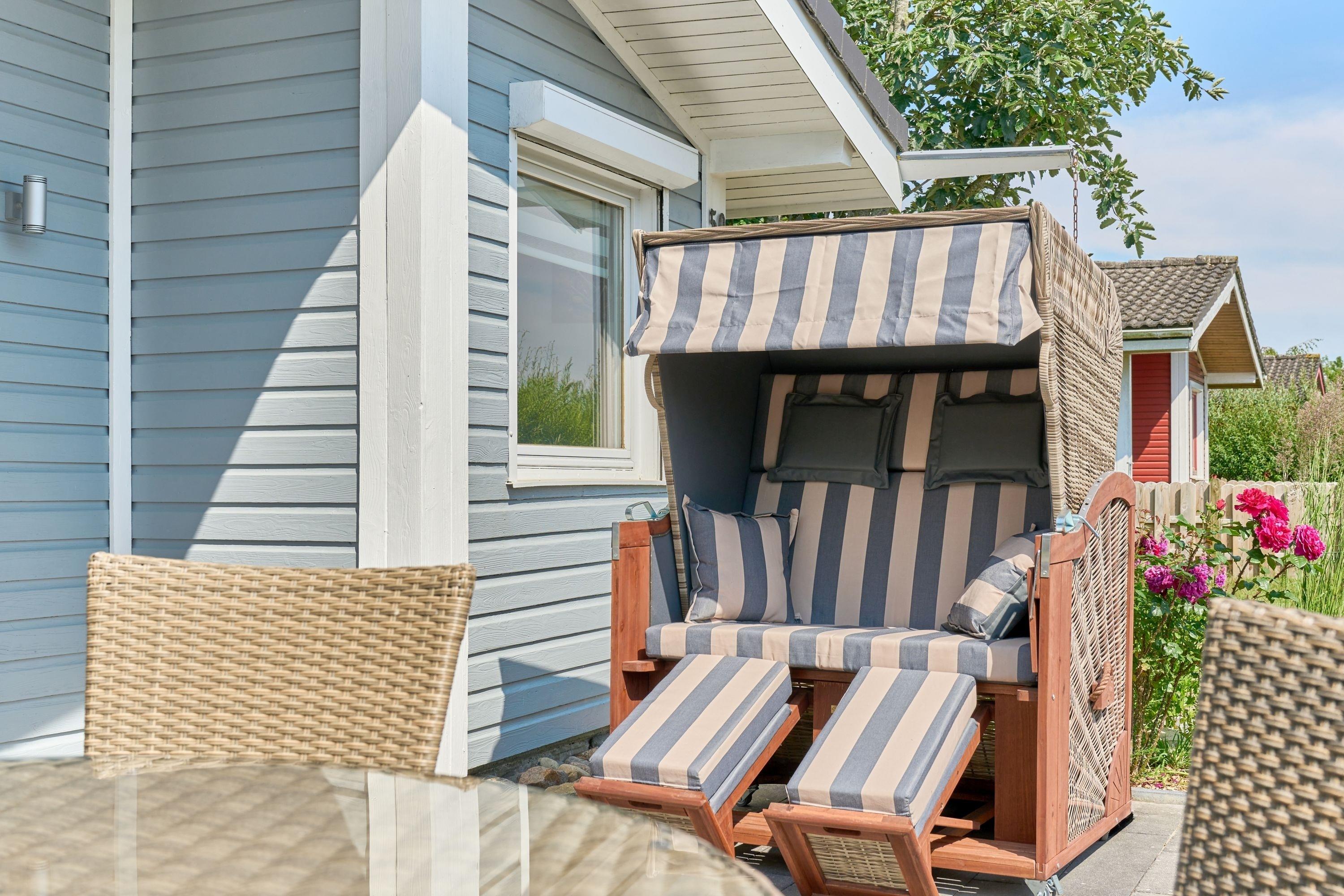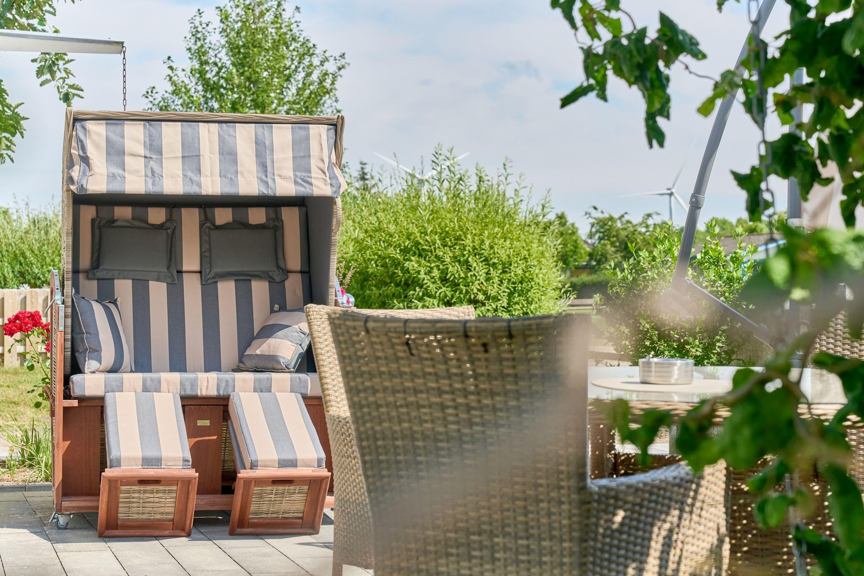 sowie einem Strandkorb ausgestattet, ideal für entspannte Stunden in der Sonne. Die kleinere, schattige Terrasse hinter