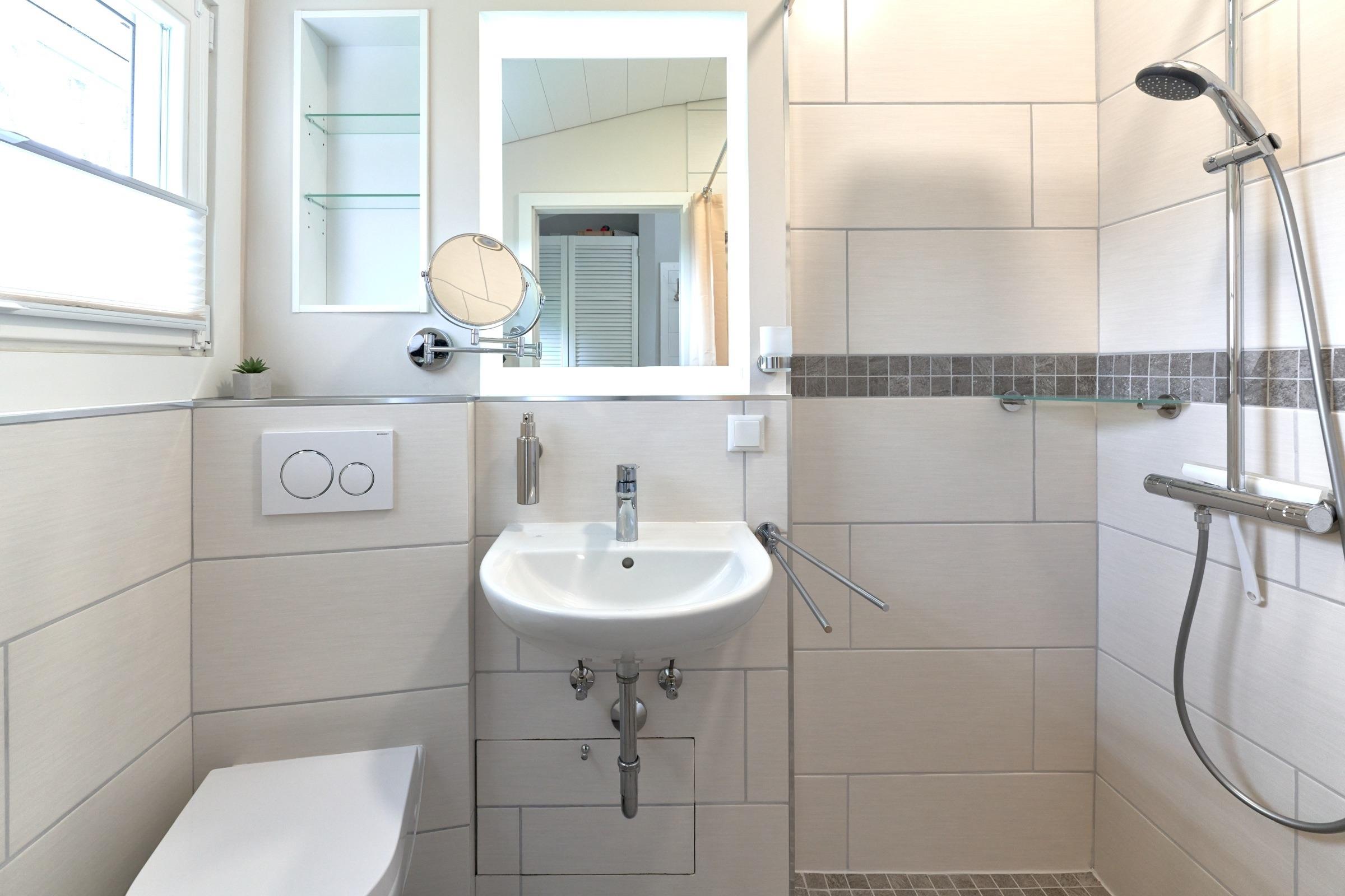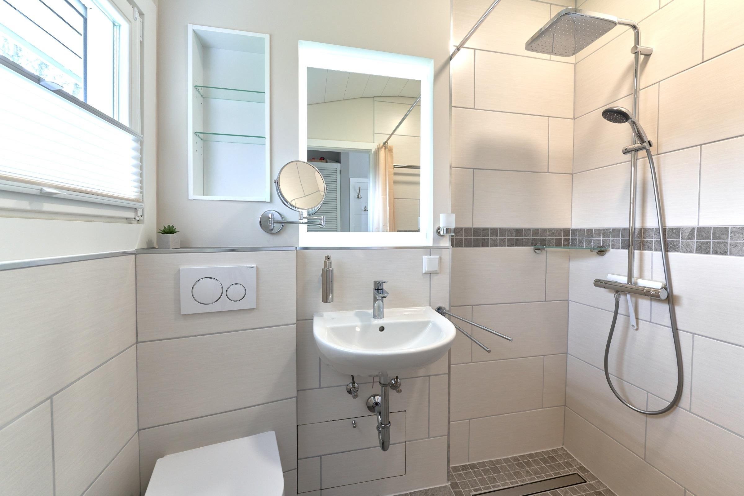 Regenwaldduschkopf, Handbrause, Fußbodenheizung und einem erhöhten Fenster für frische Luft.