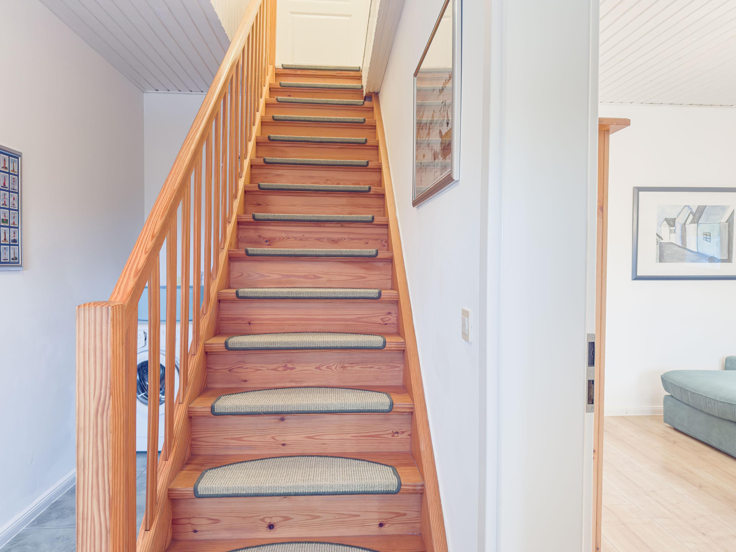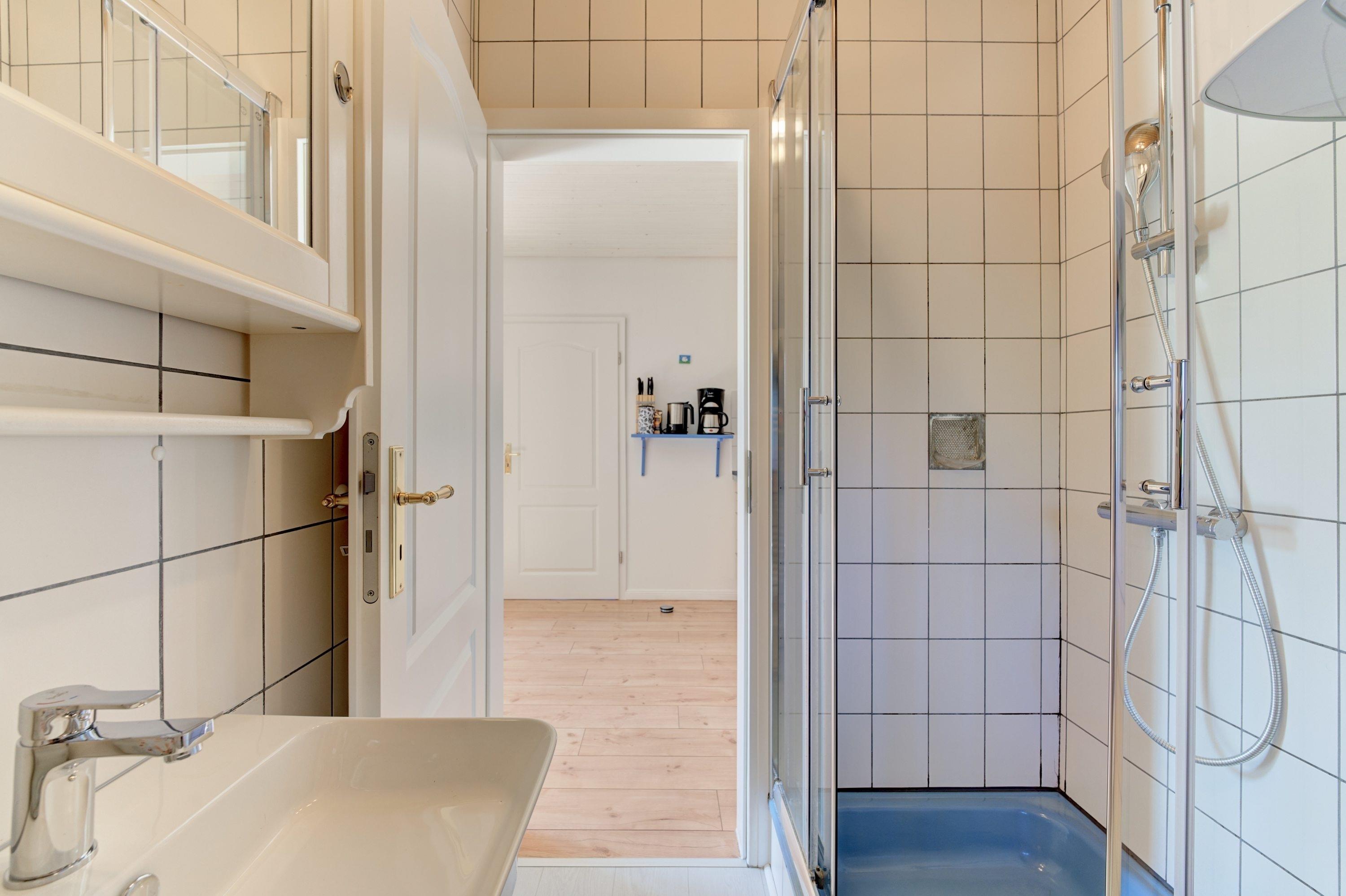 Im Erdgeschoss befindet sich außerdem ein modernes Duschbad mit WC sowie eine Waschmaschine – praktisch für längere Aufenthalte oder den Urlaub mit Hund.