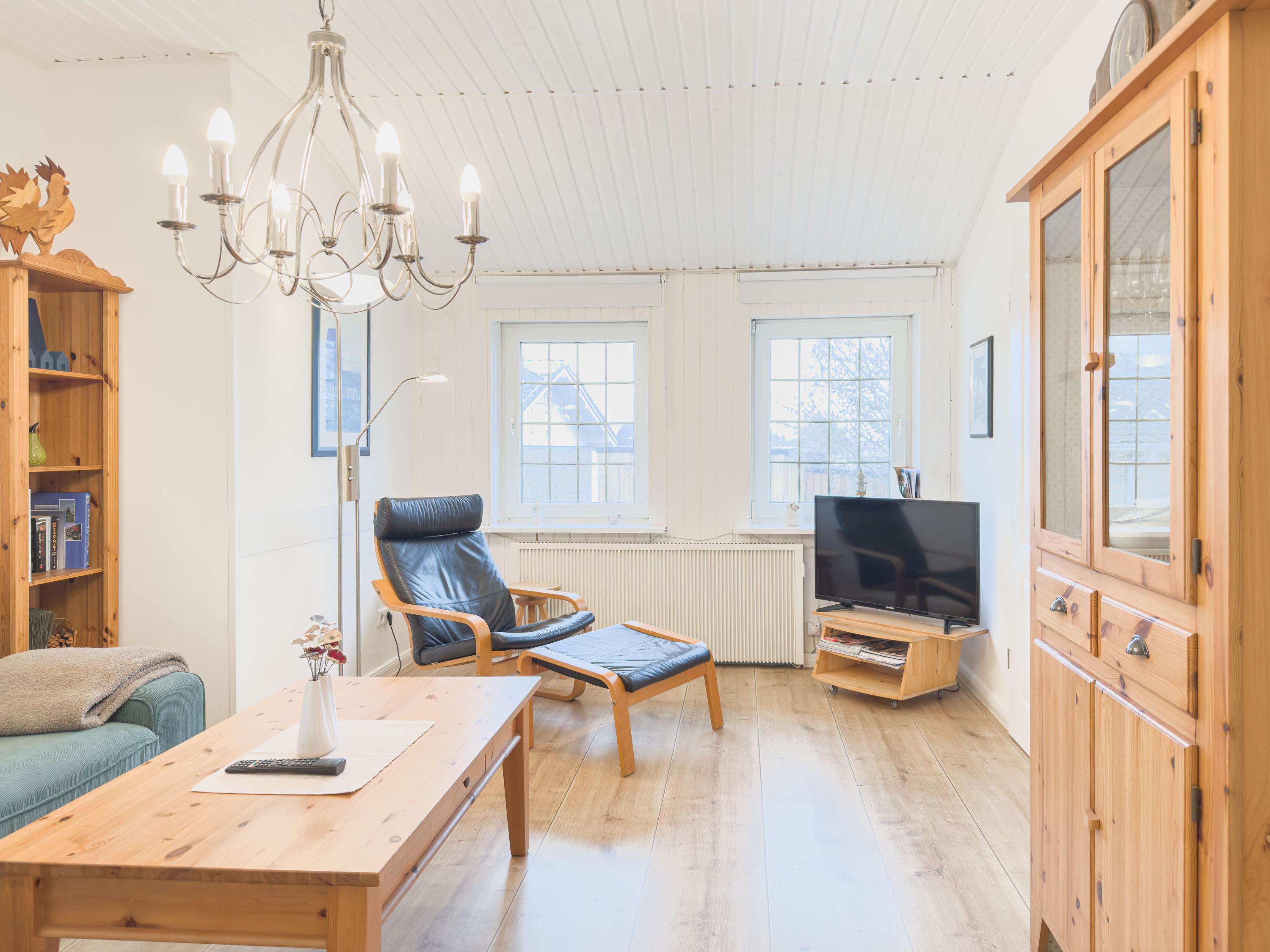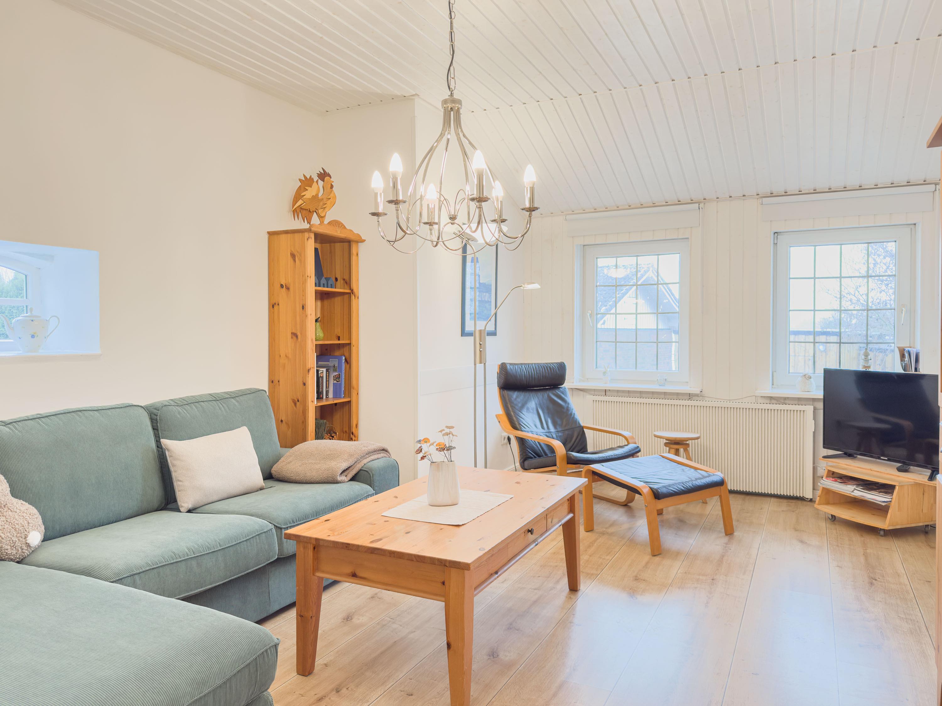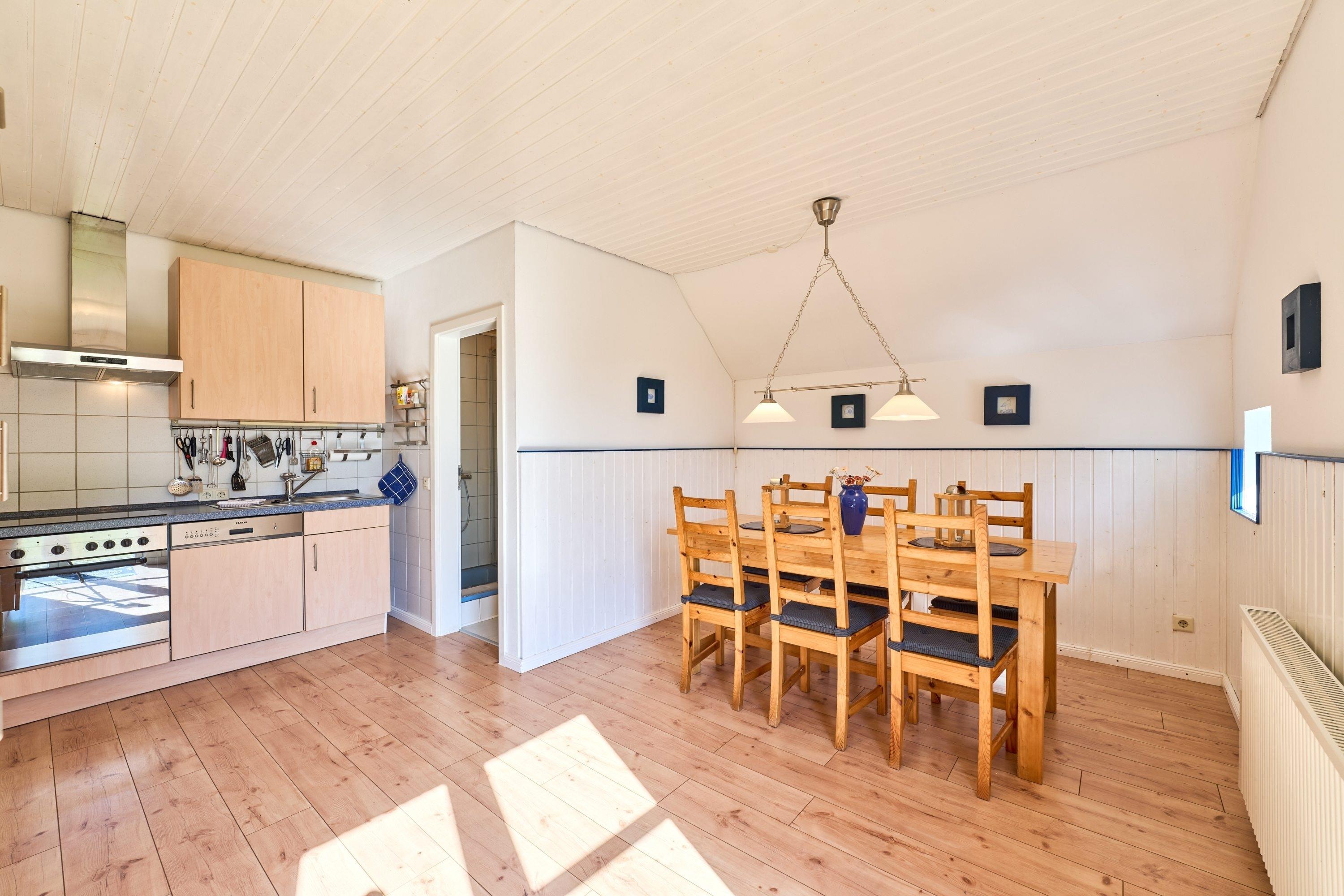 Der geschmackvoll eingerichtete Wohnbereich mit bequemen Sofas und Flachbildfernseher lädt zu gemütlichen Stunden ein – ob bei einem Spieleabend oder nach einem Tag an der frischen Nordseeluft. Die großzügige Küche mit Esstisch ist das Herzstück der Wohnung und bietet viel Platz für gemeinsame Mahlzeiten und lange Abende in geselliger Runde.
