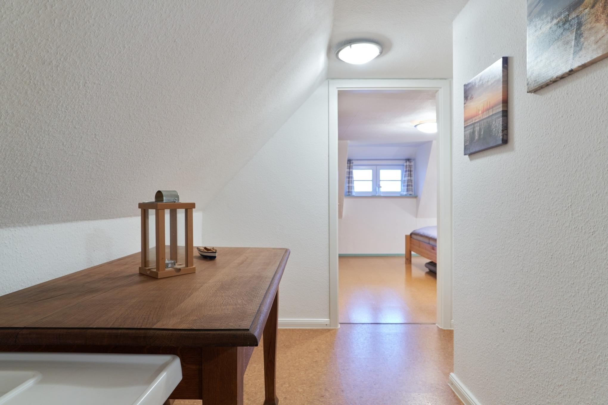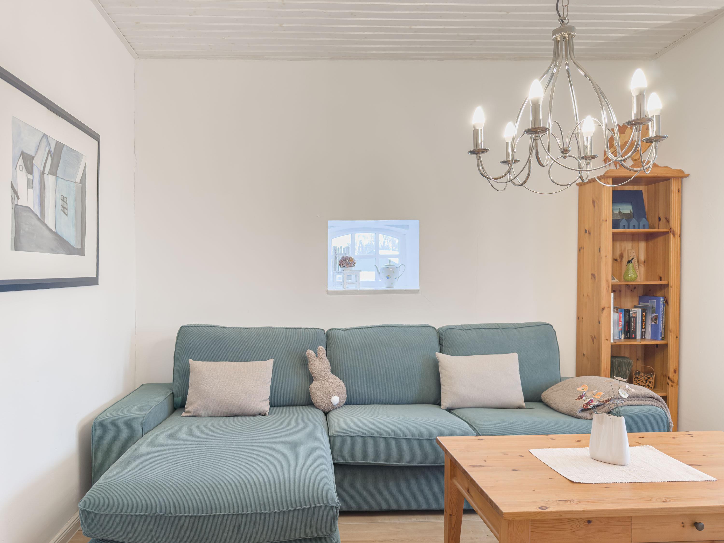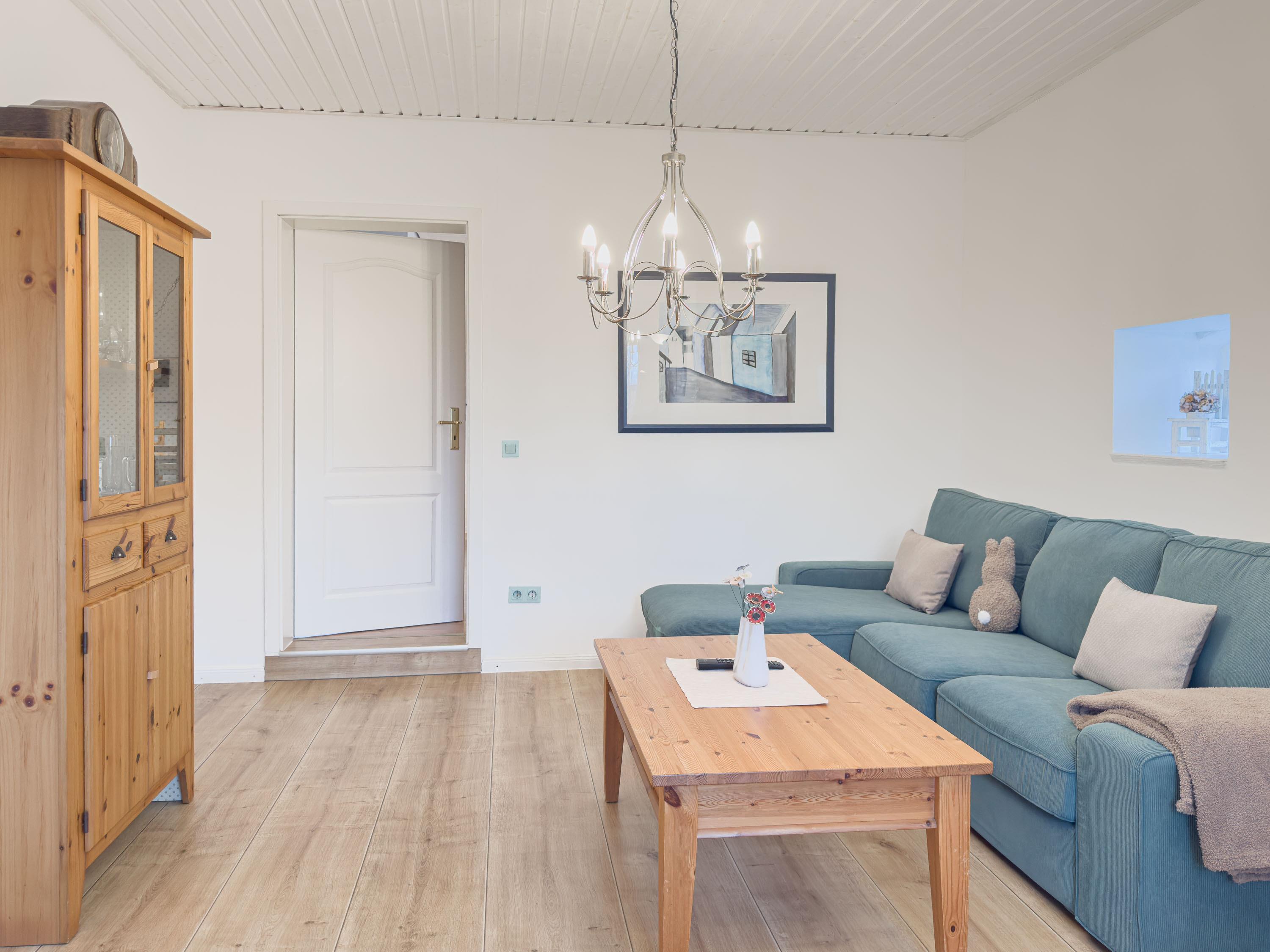 Der geschmackvoll eingerichtete Wohnbereich mit bequemen Sofas und Flachbildfernseher lädt zu gemütlichen Stunden ein – ob bei einem Spieleabend oder nach einem Tag an der frischen Nordseeluft. Die großzügige Küche mit Esstisch ist das Herzstück der Wohnung und bietet viel Platz für gemeinsame Mahlzeiten und lange Abende in geselliger Runde.