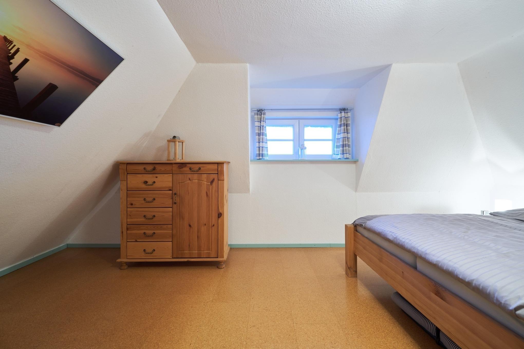 Die Schlafzimmer befinden sich im Obergeschoss und bieten ein besonders behagliches Wohngefühl unter dem traditionellen Reetdach.