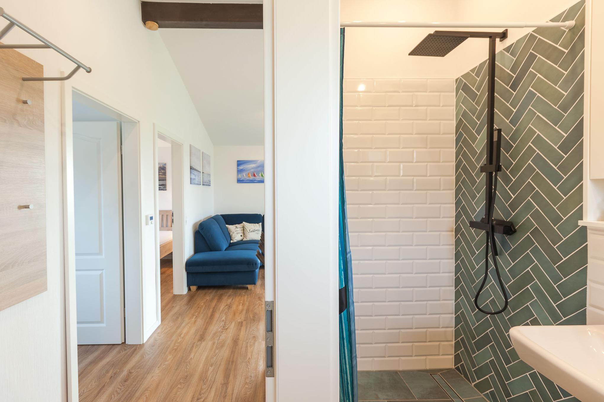 Familie oder Freunde. Das moderne Duschbad mit bodengleicher Dusche sorgt für zusätzlichen