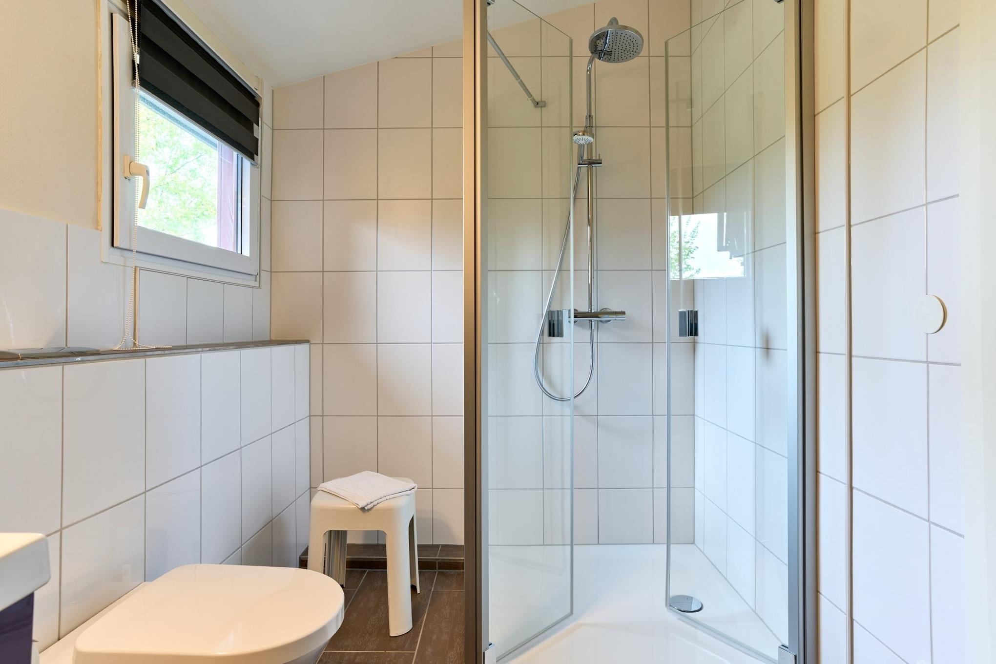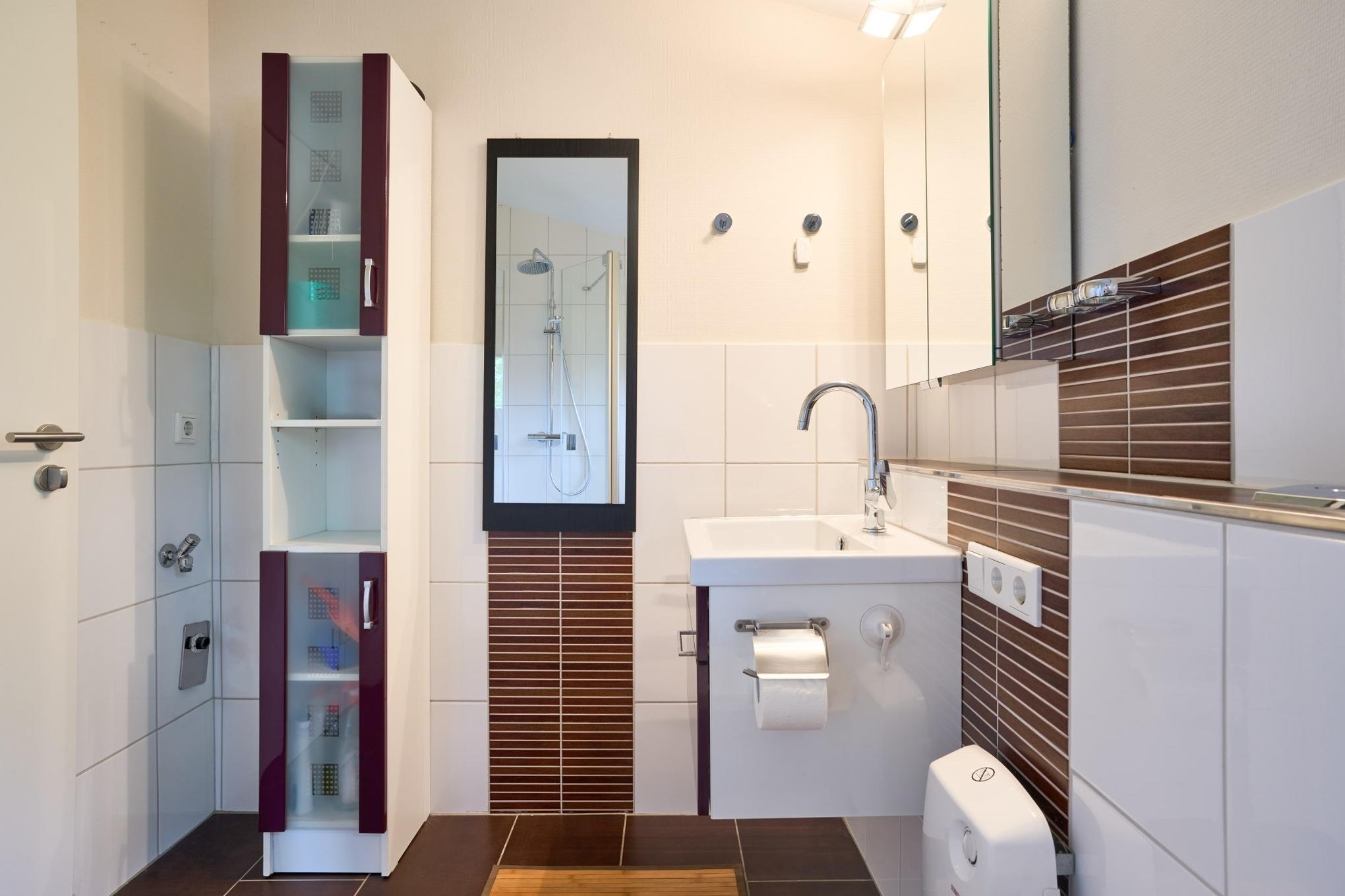 Das Badezimmer sorgt mit modernen Elementen für zusätzlichen Komfort, während Infrarot-Heizkörper in allen Räumen