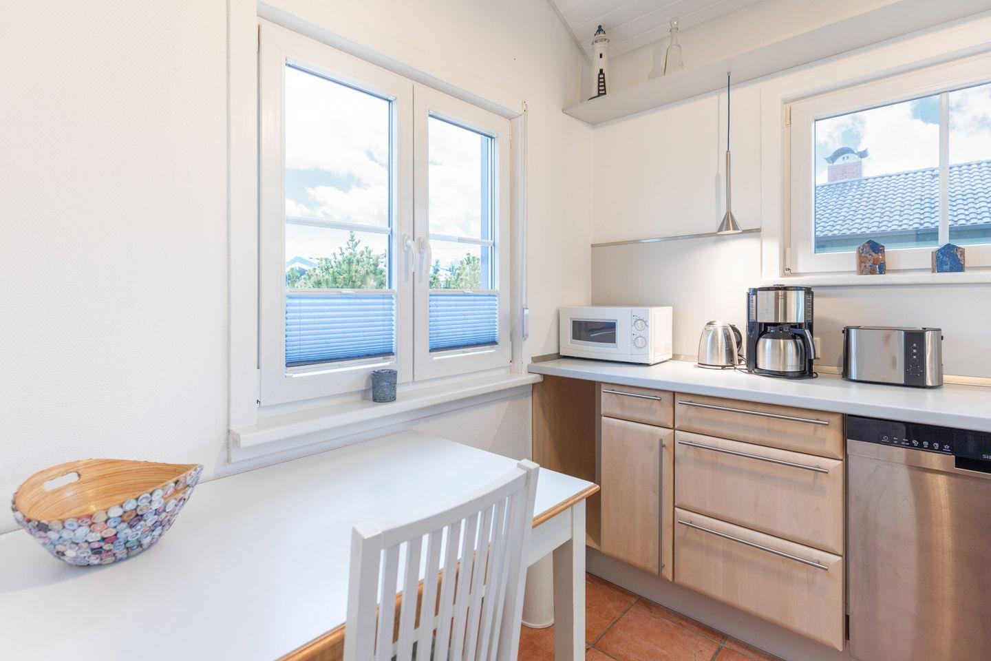 Unser lichtdurchflutetes Ferienhaus bietet auf 55 qm Platz und besticht durch die hohen Decken. Es ist mit einem gemütlichen Wohnbereich mit Kaminofen, SAT-TV, Essbereich, einer geschlossenen Küche und einem Duschbad mit Waschmaschine eingerichtet. Es verfügt über zwei Schlafzimmer: je ein Doppelbett (160 x 200 und 140 x 200).