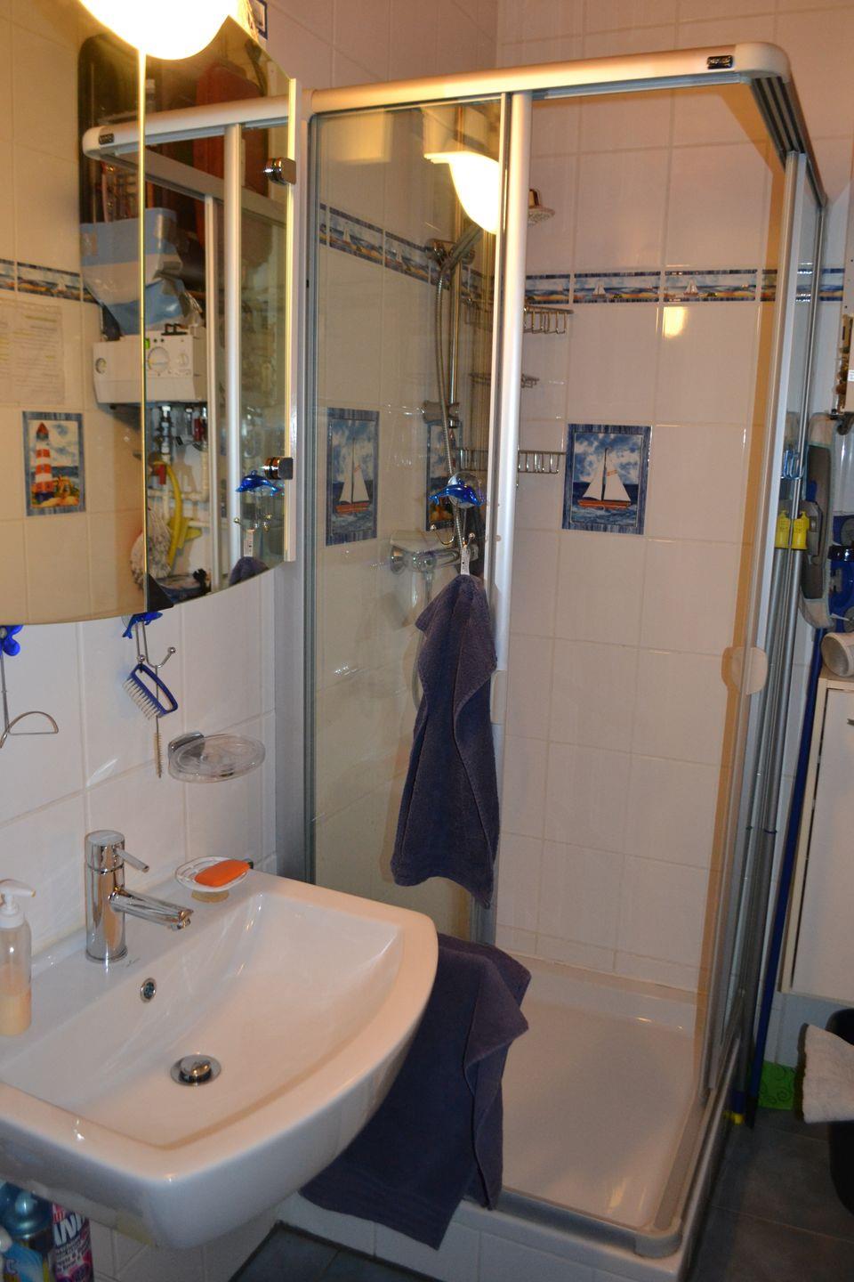 Das Bad hat eine Dusche mit niedriger Duschtasse und geregelter Thermostatbatterie, sowie eine Waschmaschine für die Wäsche zwischendurch.