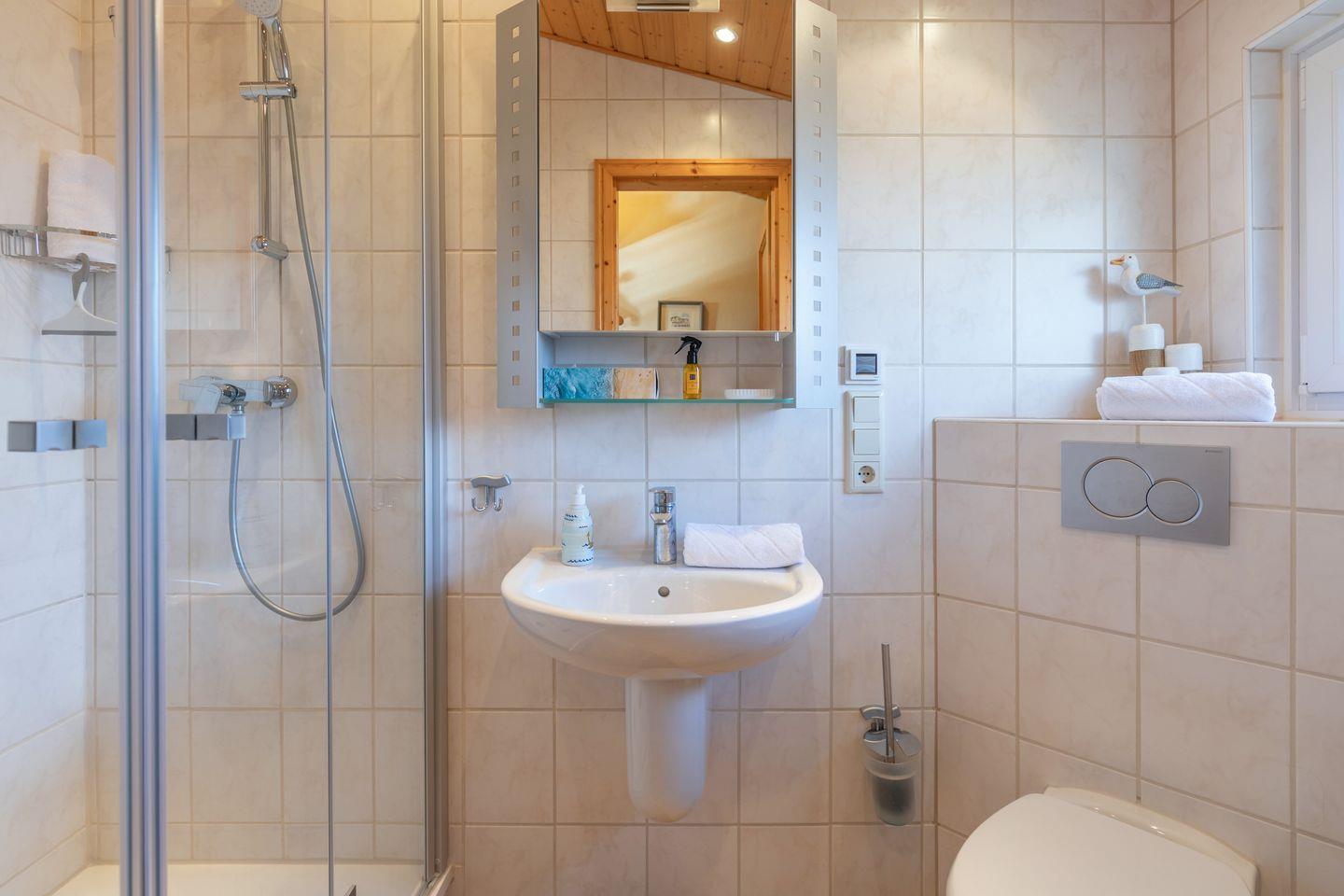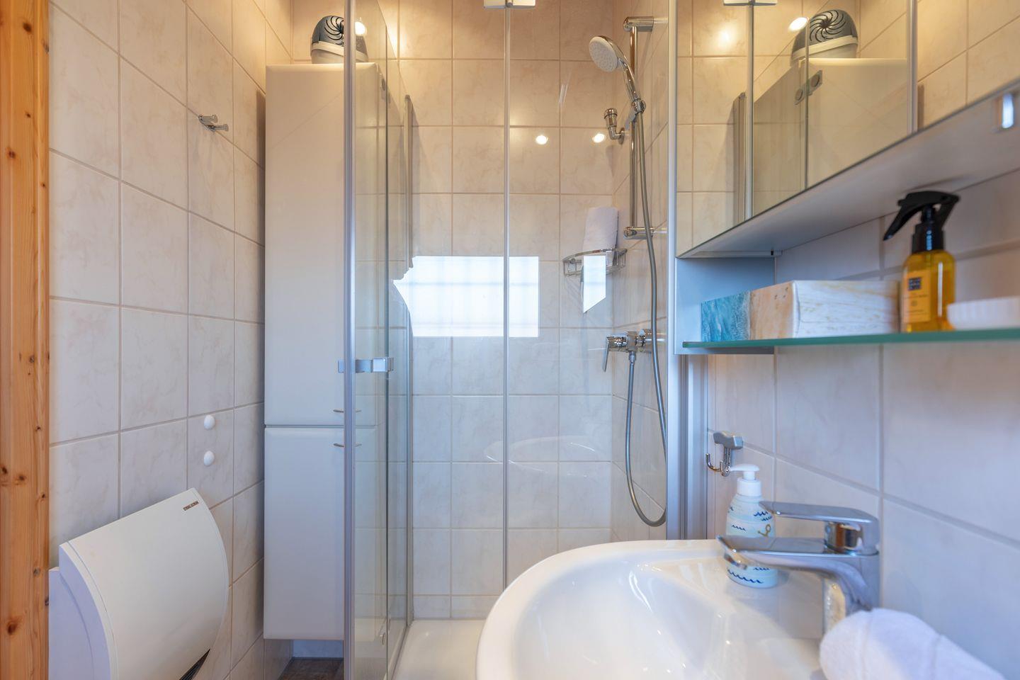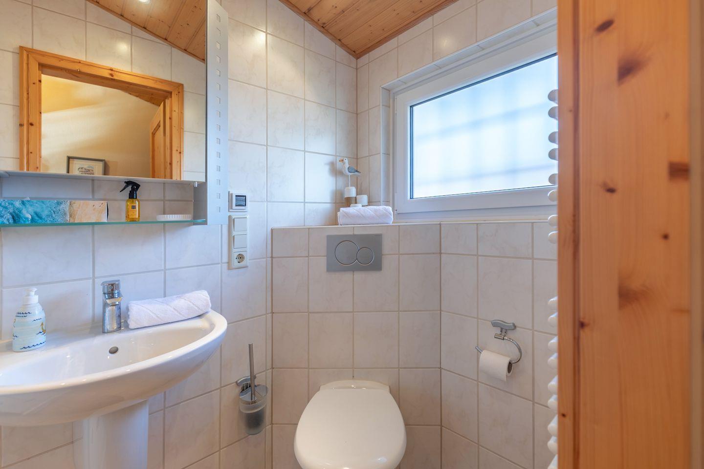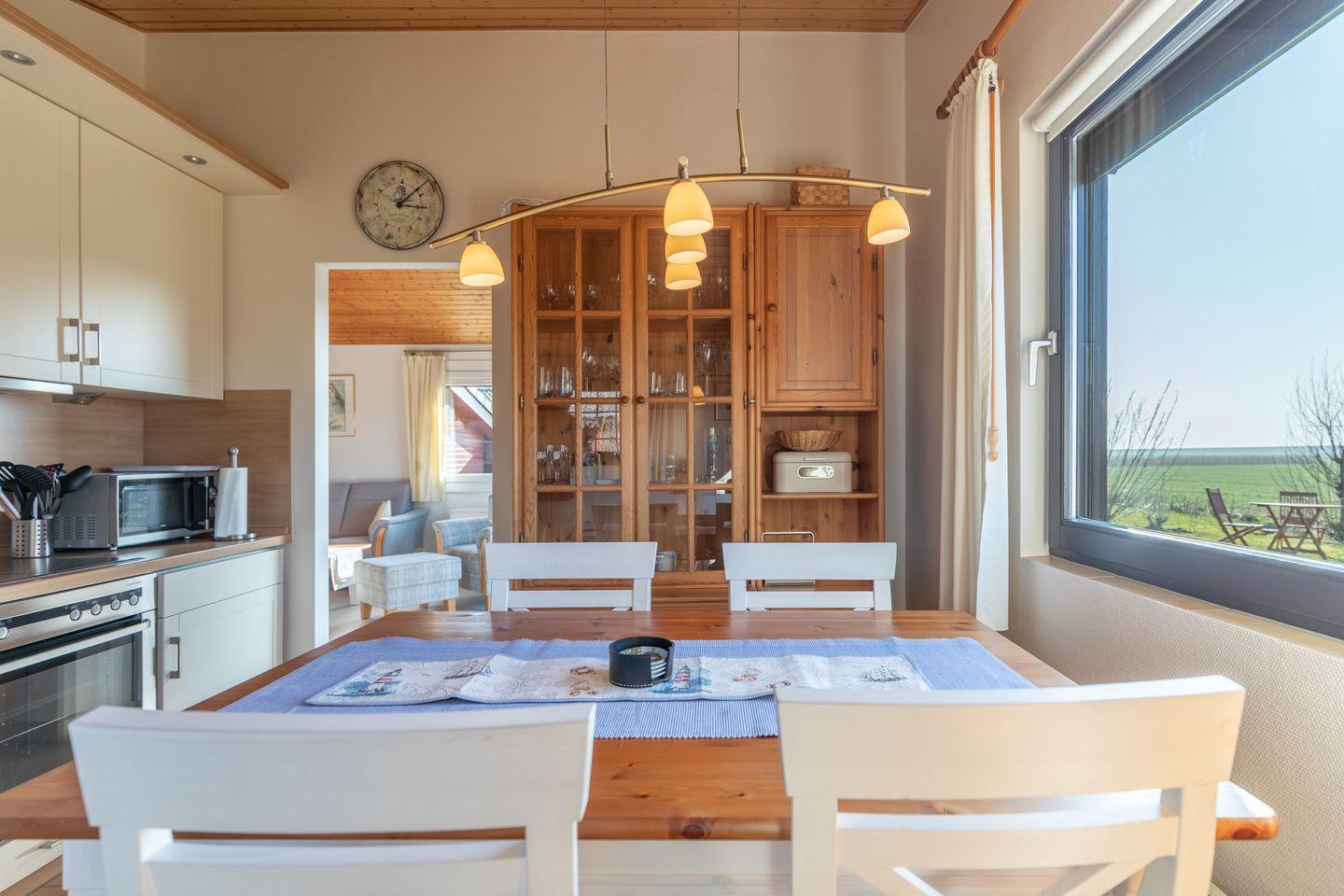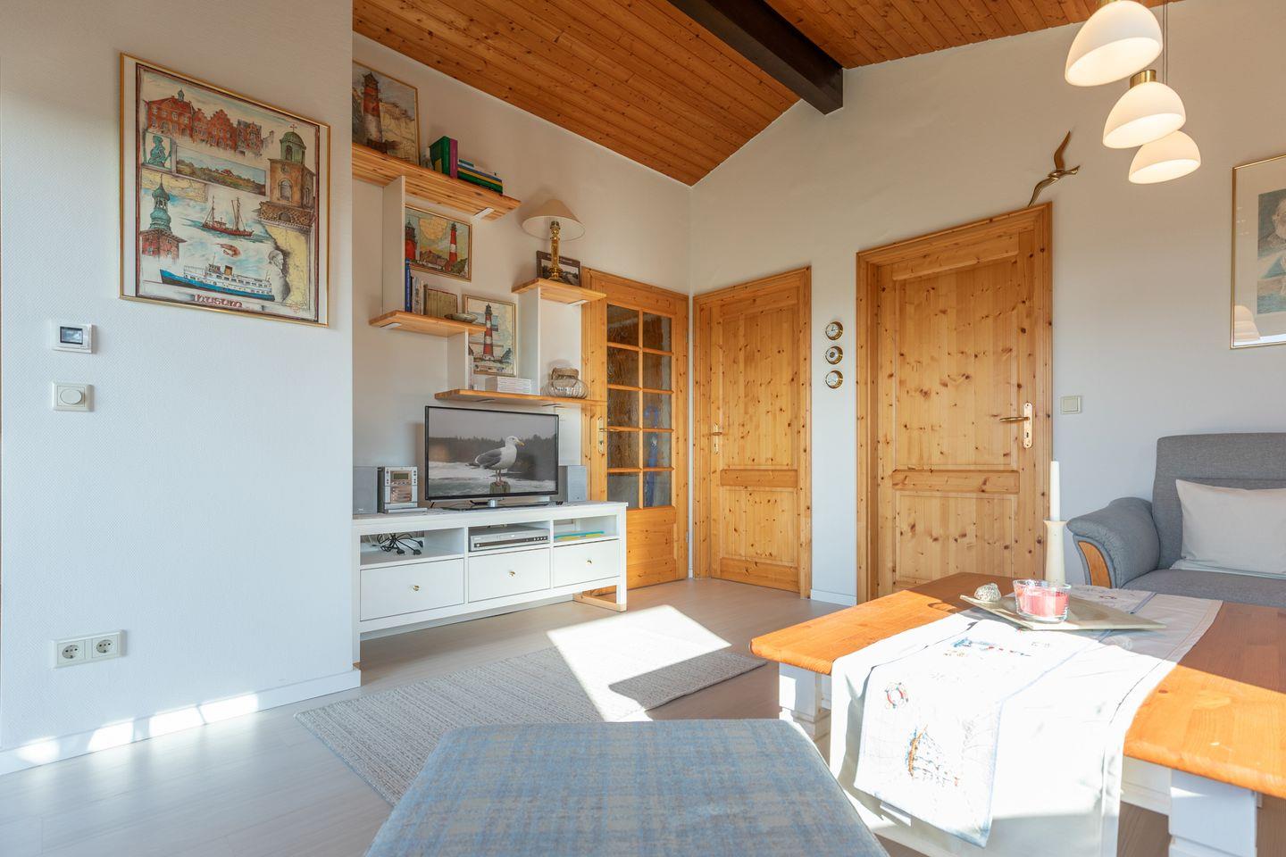 Mit 60 m² bietet die Unterkunft eine liebevolle Einrichtung und einen lichtdurchfluteten Wohnbereich mit Parkettboden, einer gemütlichen Sofaecke, TV, HiFi-Anlage und DVD-Player. Die separate Küche ist voll ausgestattet, darunter ein Esstisch, Cerankochfeld, Backofen, Wasserkocher, Mikrowelle und Kühlschrank. Eine Espressomaschine sorgt für Kaffee-Genuss, zudem gibt es eine Kaffeefiltermaschine (Filtergröße: 4). Zusätzlich gibt es eine Brotschneidemaschine.