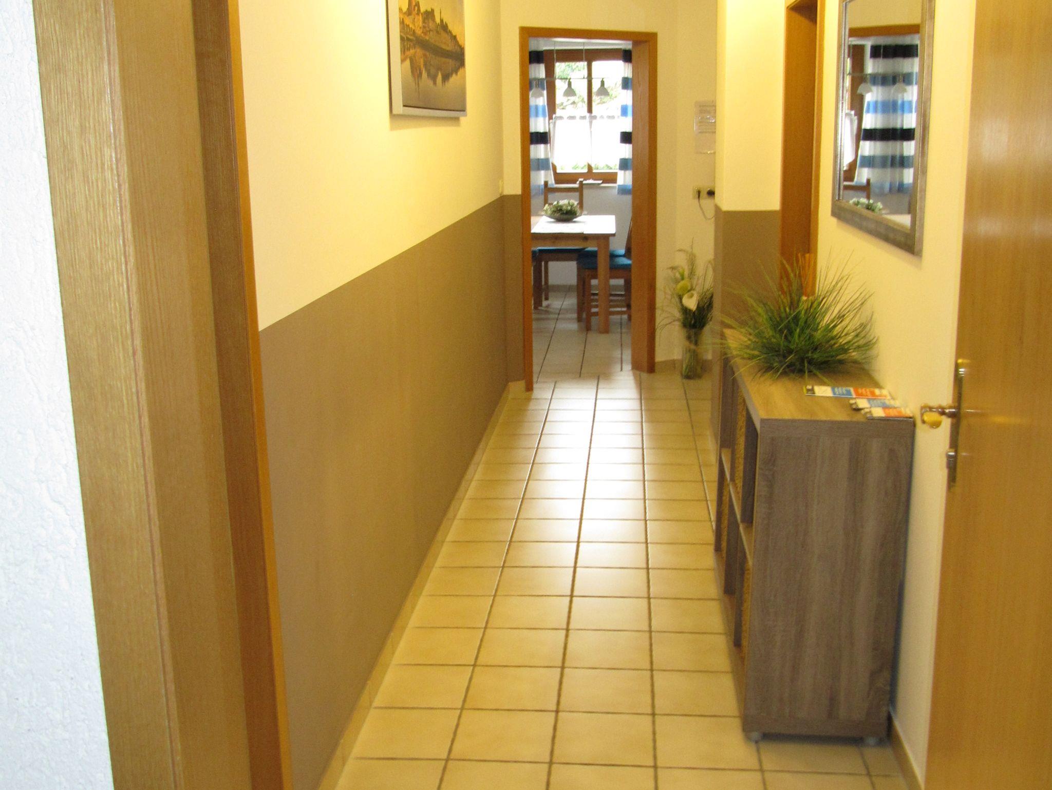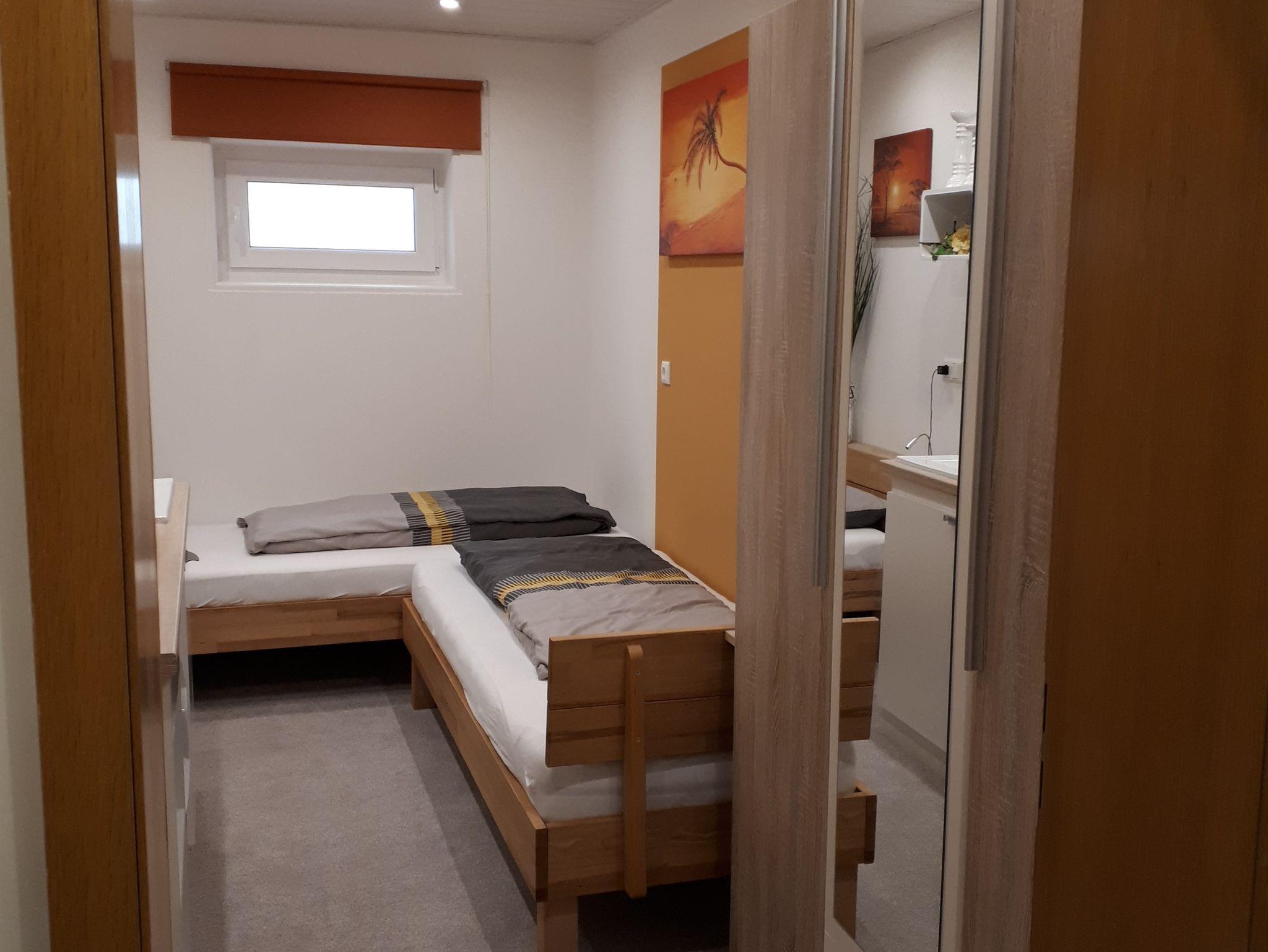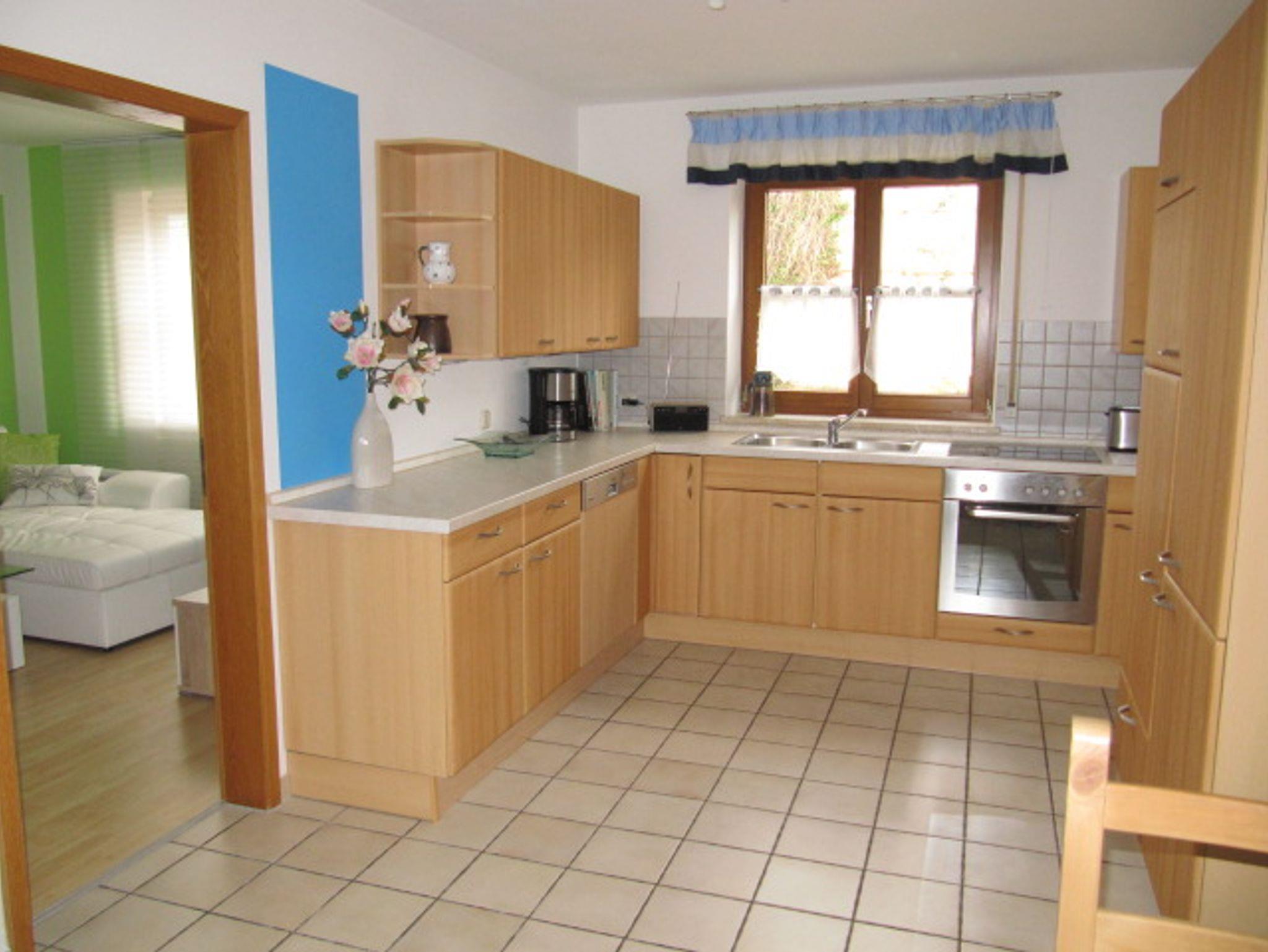 Die Ferienwohnung ist 68 m² groß, hat ein Schlafzimmer mit Doppelbett und Schrank, Wohnzimmer mit Liegesofa und einen Nebenraum mit 2 Einzelbetten. Die großzügige Wohnküche mit Geschirrspüller ist voll eingerichtet mit Kühlschrank, eigenem Gefrierteil, Backofen und Ceranfeld, Kaffeemaschine, Küchenwaage, Eierkocher, Toaster usw.