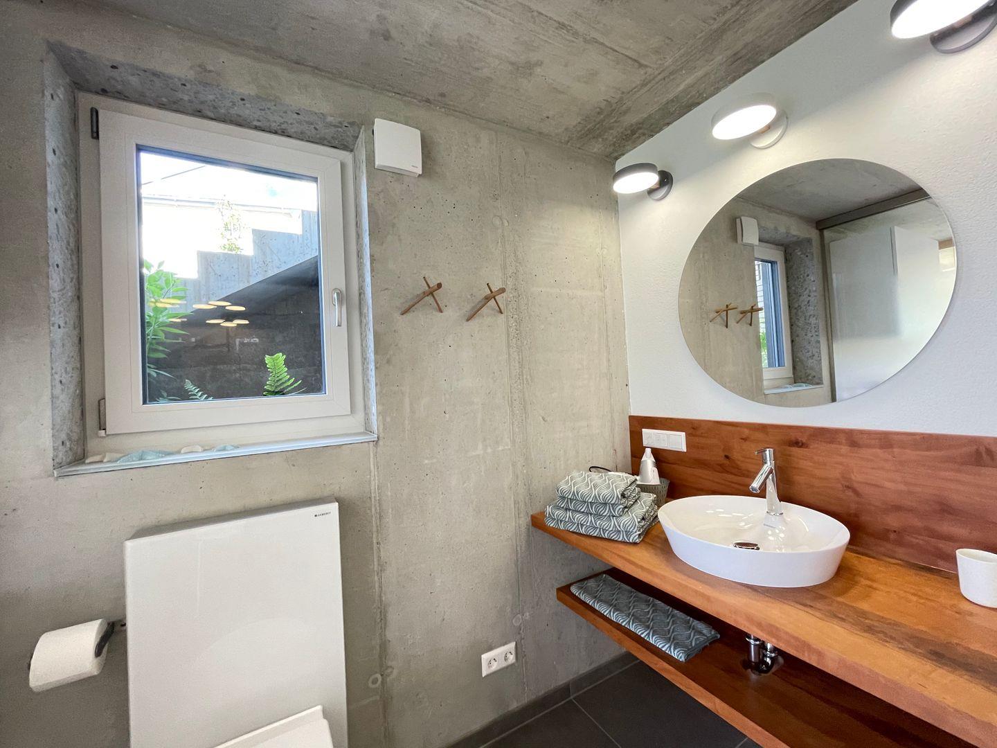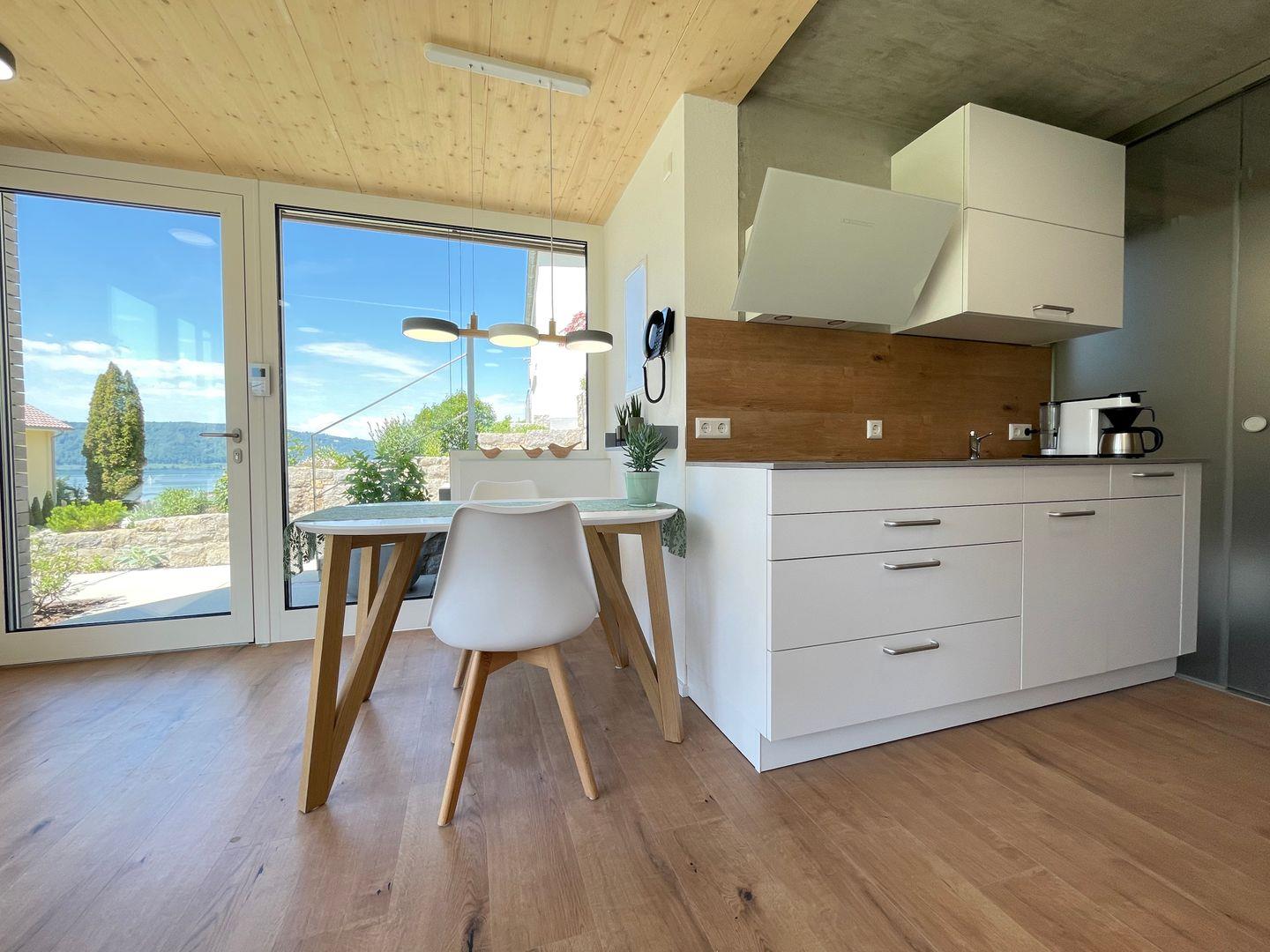 Die Ferienwohnung Torkelstube liegt im Gartengeschoss des Ferienhauses Rebhaus. Sie ist 42m² groß und besitzt eine Gartenterrasse und Liegewiese mit traumhaftem Ausblick. Von dieser Wohnung aus kann der Blick über den idyllischen Dorfkern von Sipplingen hinweg zum gegenüberliegenden Ufer des Bodensees bis zur Ortschaft Bodman schweifen. Die 2-Zimmer-Wohnung hat 1 Schlafzimmer, das mit einem Doppelbett (180x200cm) ausgestattet ist. Der offene Wohn- Essbereich mit integrierter Küche ist stilvoll und modern eingerichtet. Das durch Glaswände abgetrennte, modern gestaltete Tageslichtbad ist mit elegantem Waschtisch aus eingeöltem Birnbaumholz, WC und bodengleicher, direkt begehbarer Dusche ausgestattet.