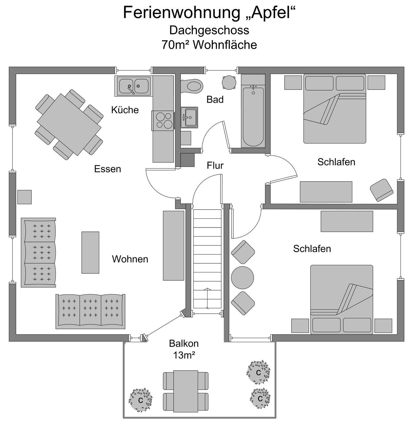 Die Ferienwohnung Apfel befindet sich im Dachgeschoss des Obsthauses und hat 70m² Wohnfläche. Vom Balkon hat man eine traumhafte Sicht auf den Bodensee und das gegenüberliegende, schöne Fachwerkhaus welches sich am historischen Ortskernrand befindet. Die 3-Zimmer-Wohung hat einen großzügigen Wohn-Essbereich mit intrigierter Küchenzeile und 2 Schlafzimmer, die mit je einem Doppelbett (180x200cm) ausgestattet sind. Das Bad ist mit einer Badewanne mit Duschmöglichkeit, WC und Waschbecken ausgestattet.