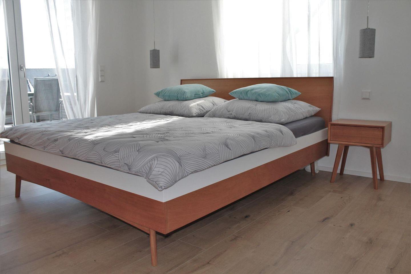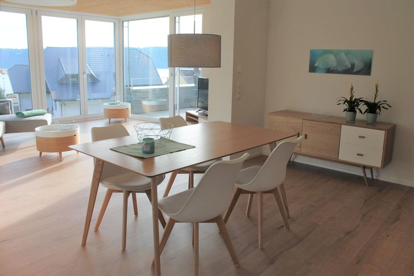 Die Ferienwohnung Weinlaube liegt im Erdgeschoss des Ferienhauses Rebhaus. Sie ist 85 m² groß und besitzt einen großen Balkon mit traumhaftem Ausblick. Von dieser Wohnung aus kann der Blick über den idyllischen Dorfkern von Sipplingen hinweg zum gegenüberliegenden Ufer des Bodensees bis zur Ortschaft Bodman schweifen. Die 3-Zimmer-Wohung hat 2 Schlafzimmer, die mit je einem Doppelbett (180x200cm) ausgestattet sind. Der offene und großzügige Wohn- Essbereich mit integrierter Küche und schönem Essplatz ist sehr geschmackvoll eingerichtet. In dem lichtdurchfluteten Wohnbereich mit bodentiefen Fenstern befindet sich ein Ecksofa mit Loungemodul. Das modern gestaltete Bad ist mit großem Waschtisch und Sitzbank aus eingeöltem Birnbaumholz, WC und geräumiger, begehbarer Dusche ausgestattet.