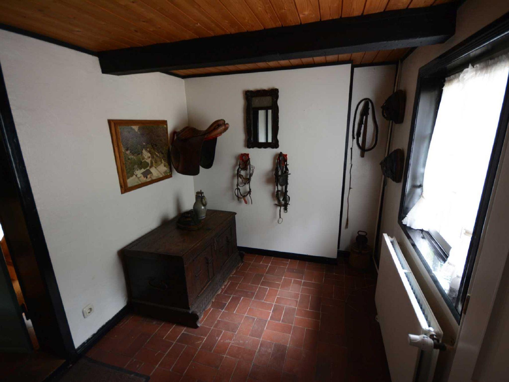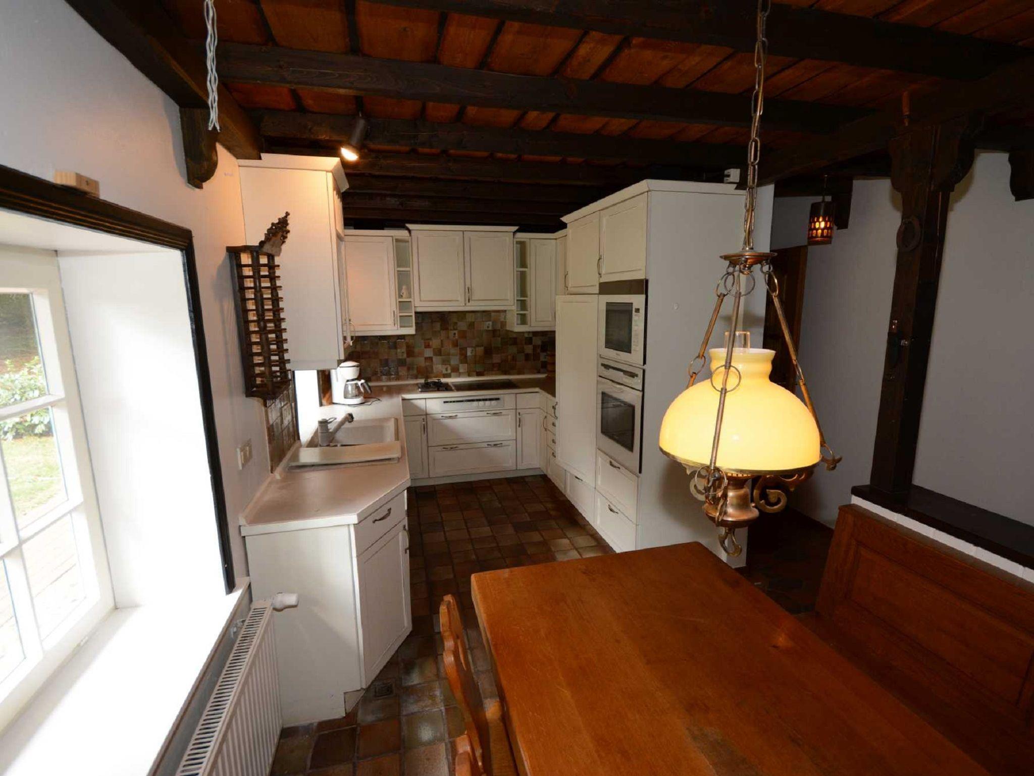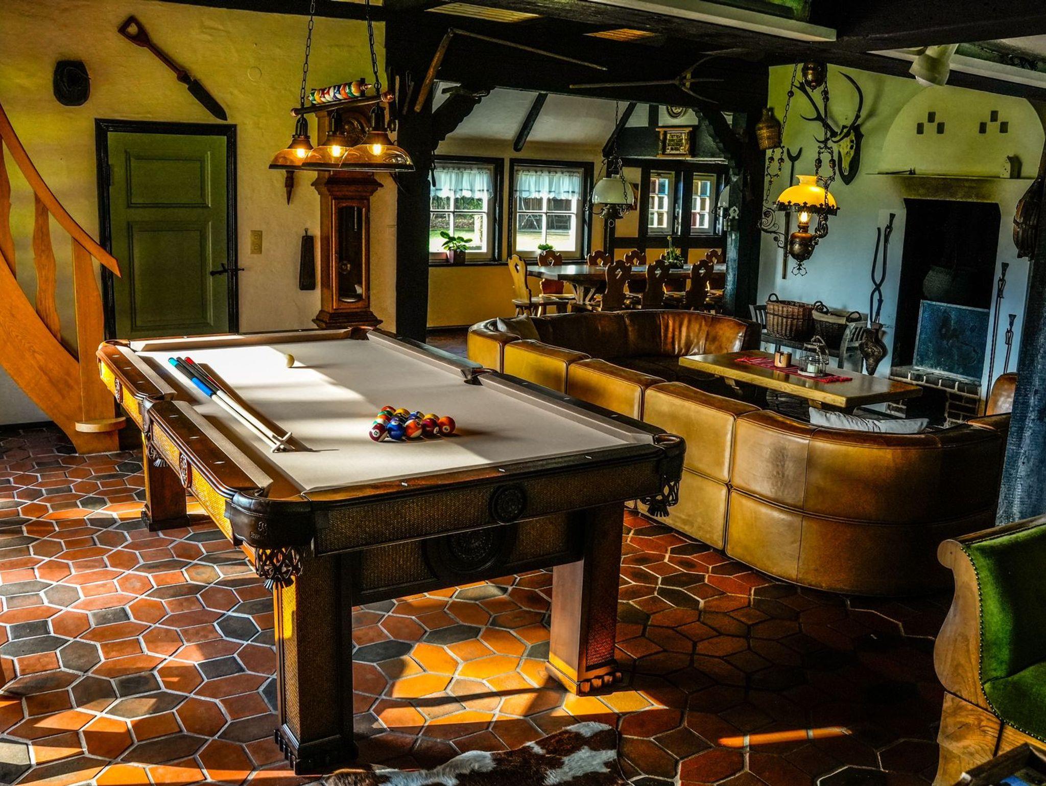 Im Erdgeschoss befindet sich das Wohnzimmer mit offenem Kamin, gemütlicher Couchgarnitur, Billiardtisch, Kicker, Schreibecke und einem Esstisch für 12 Personen. Zusätzlich ein Fernseh-bzw.Lesezimmer, ein extra WC, die Küche und der Hauswirtschaftsraum mit Waschmaschine und Trockner. Die Küche ist ausgestattet mit Backofen, Mikrowelle, Ceran-Kochfeld, Geschirrspüler und Kühlschrank. Im Obergeschoss sind vier Schlafzimmer und 2 Badezimmer.