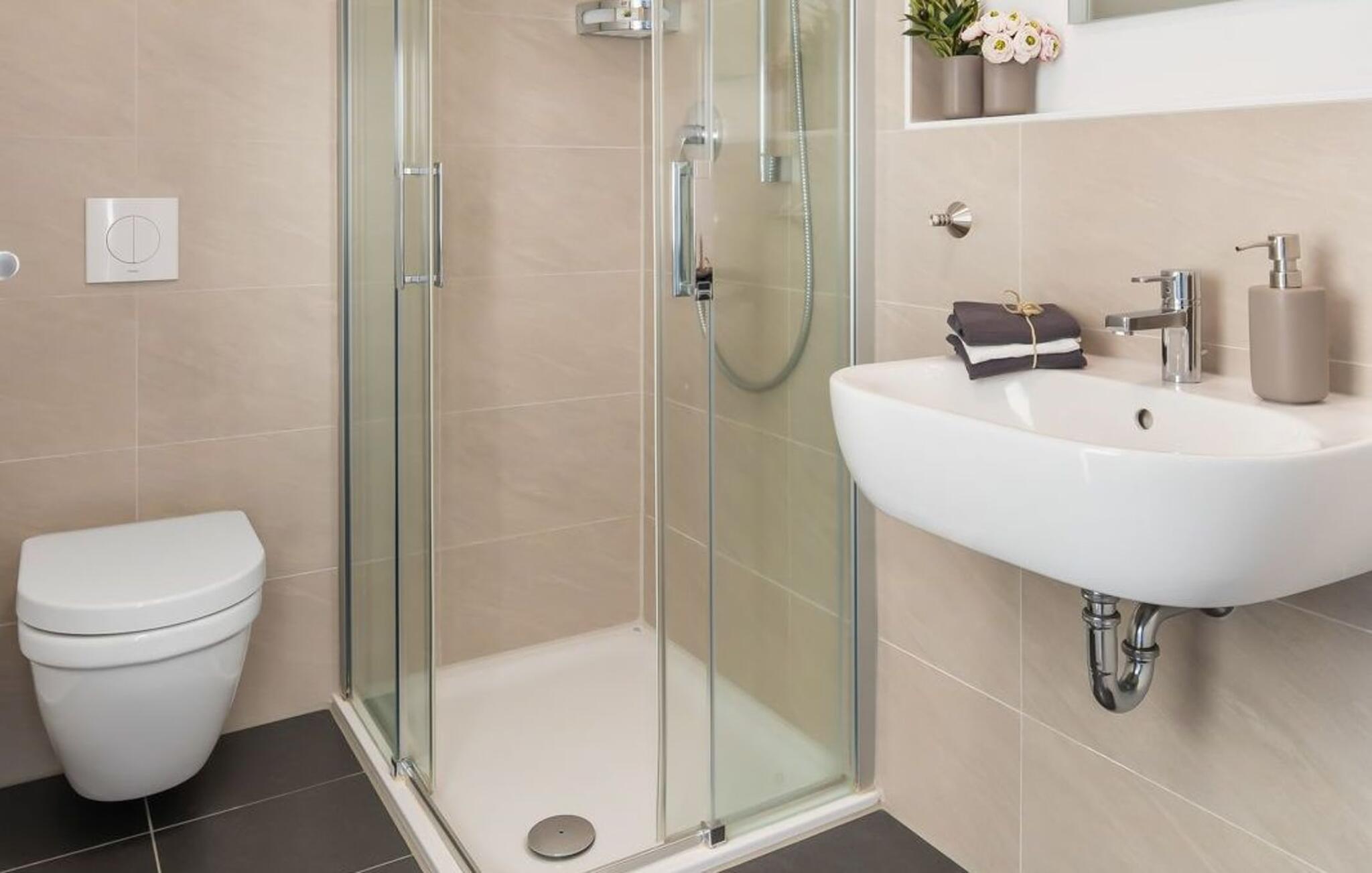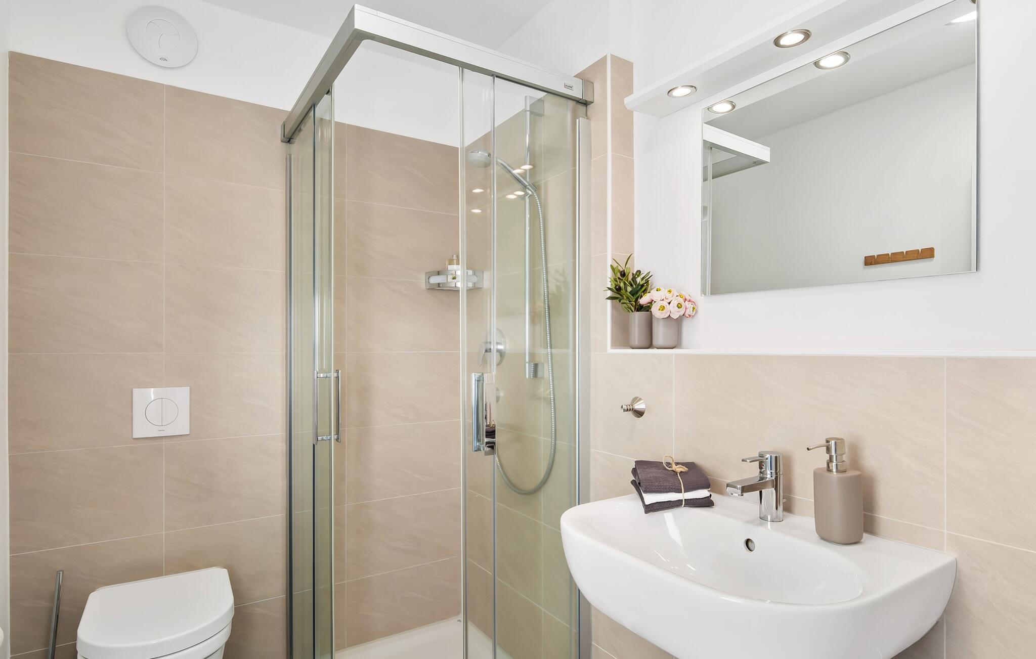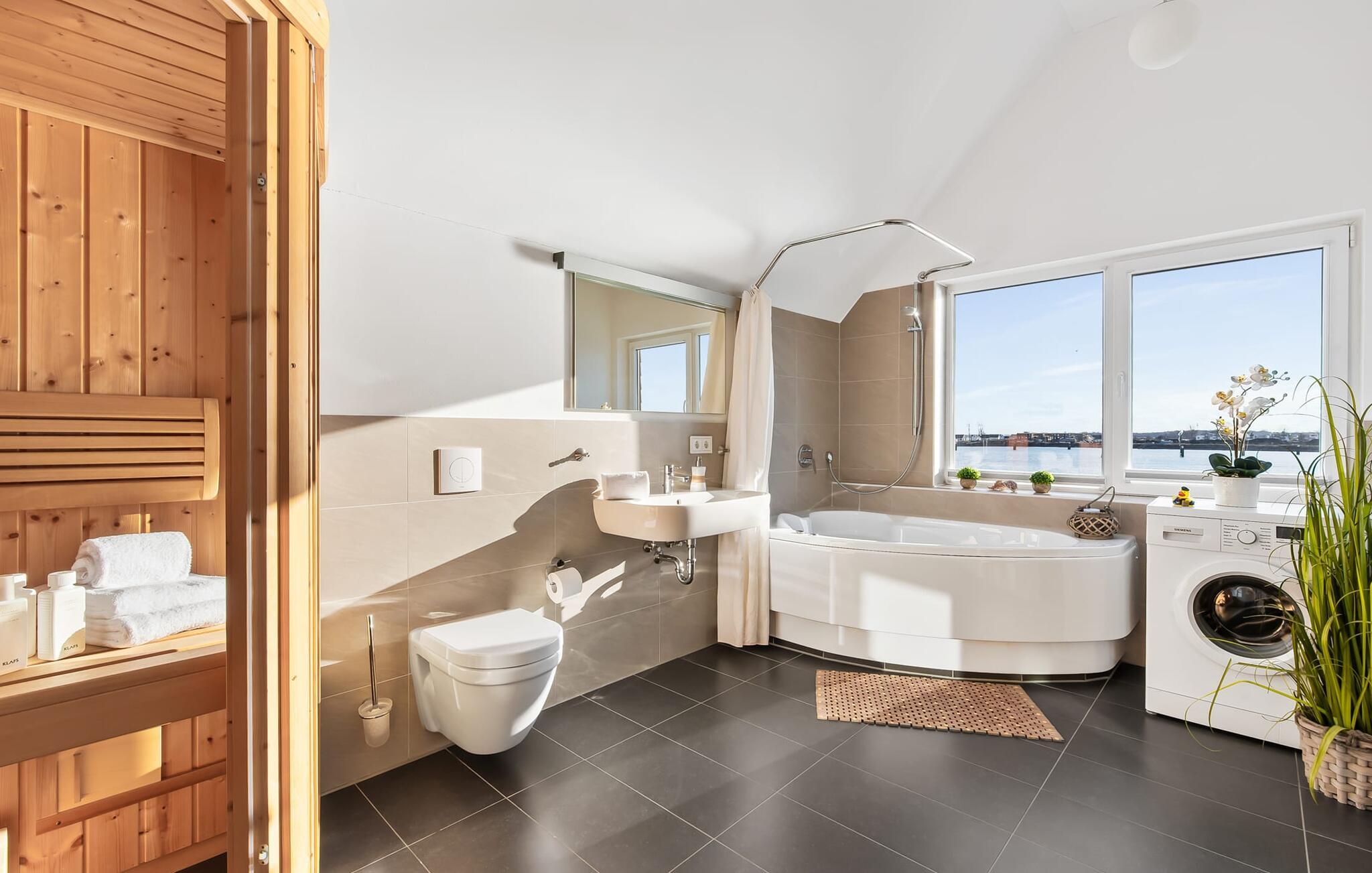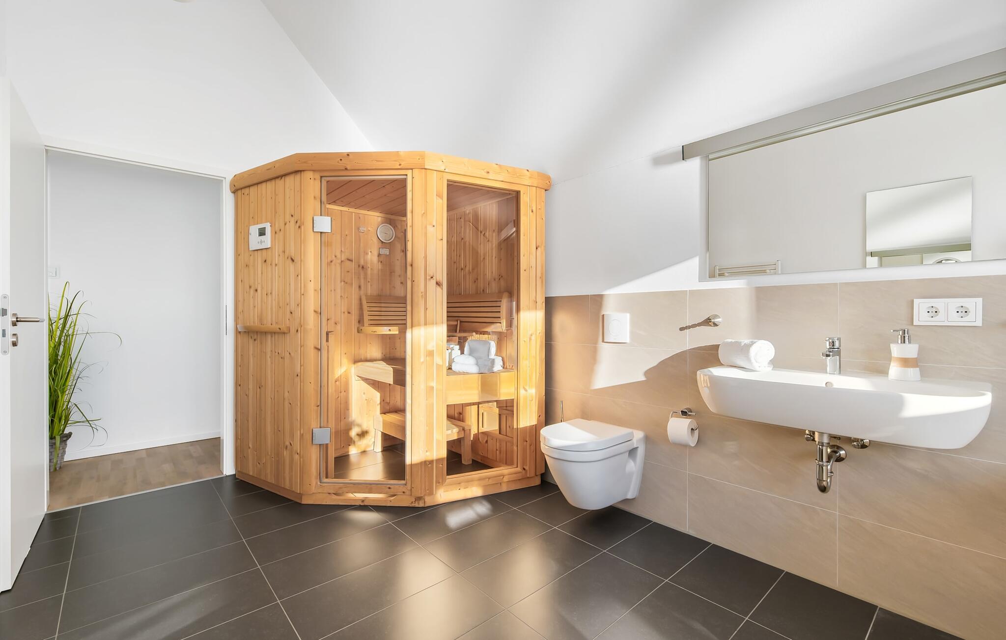 Det rummelige badeværelse har alt hvad du behøver, et brusebadekar og en finsk sauna. Behagelige wellness-øjeblikke er uundgåelige og sikrer vidunderlig afslapning selv i de køligere årstider. Hvad kunne være hyggeligere på ferien end at afslutte en lang dag ved Østersøen i det private wellness-område?