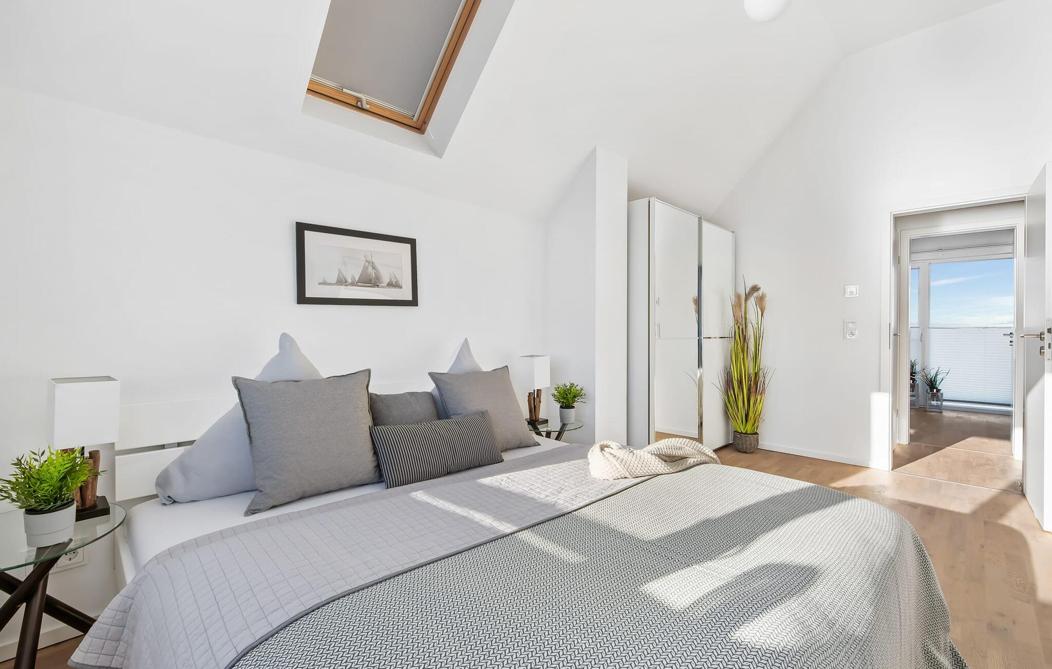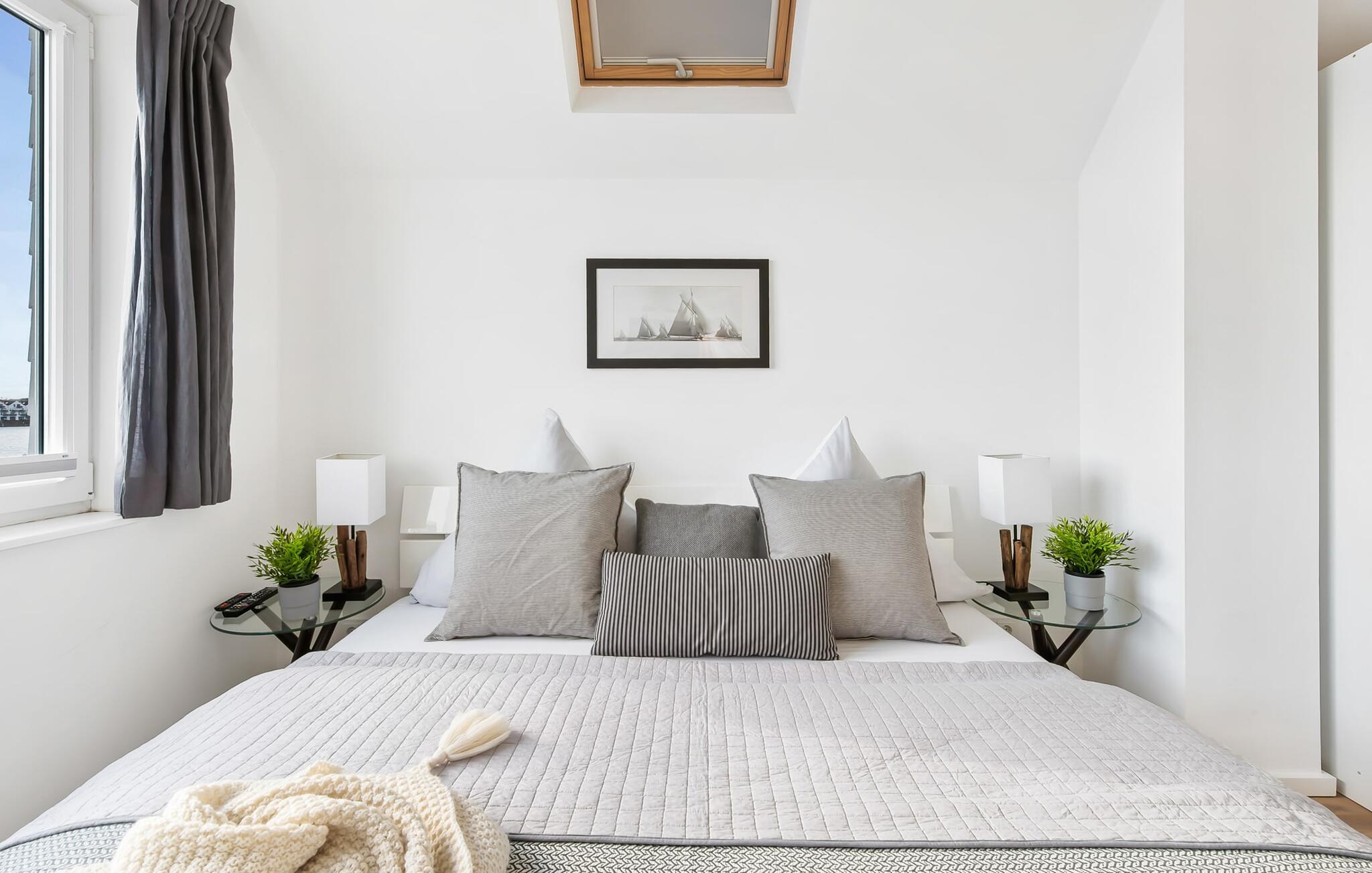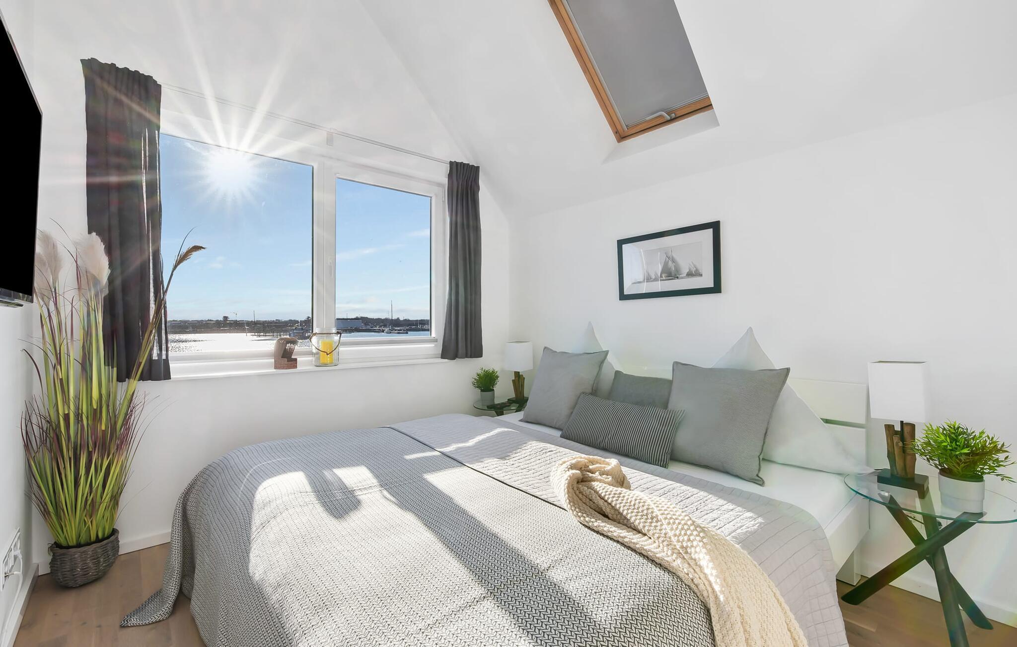 Afslapningsområdet er på første sal i lejligheden. Der er en fantastisk udsigt over havnen fra det store soveværelse. Fald i søvn under stjernerne, hvor et ovenlysvindue giver dig mulighed for at se ikke kun stjernehimlen, men også de vidunderlige skyformationer, der er så karakteristiske for norden. Det andet soveværelse har udsigt over Østersøfjorden Schlei.