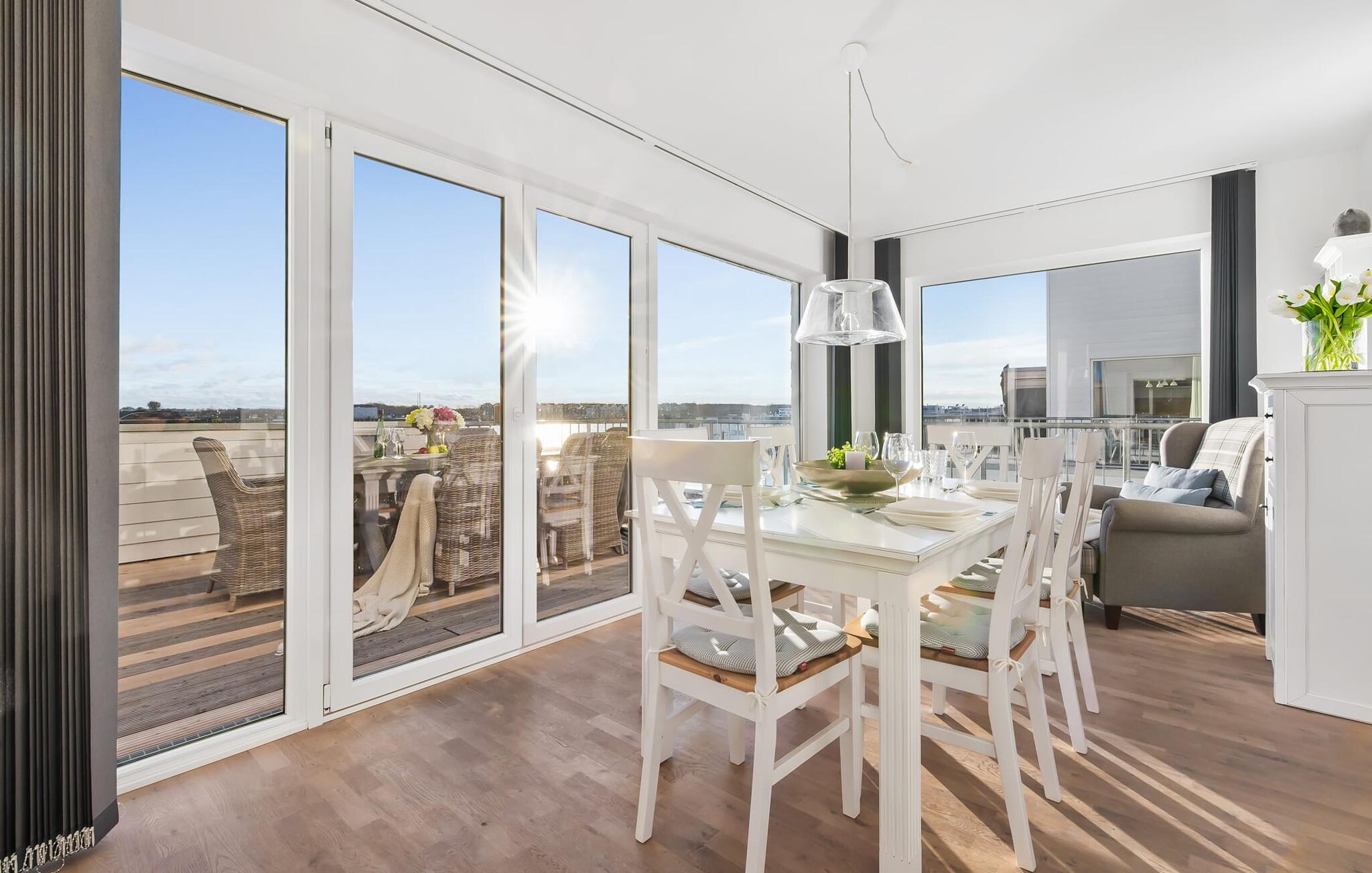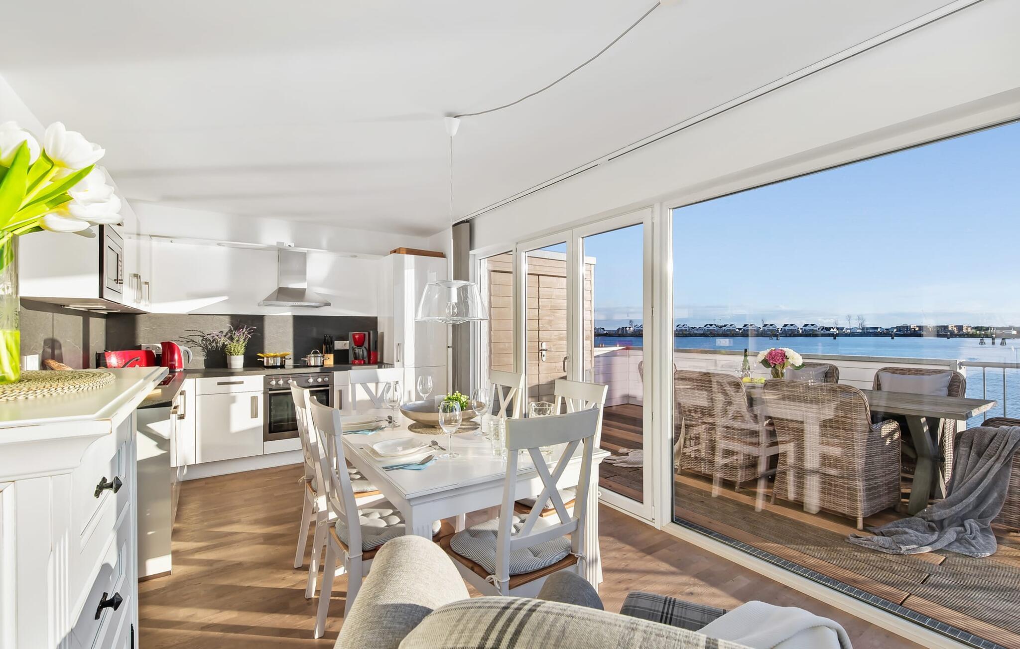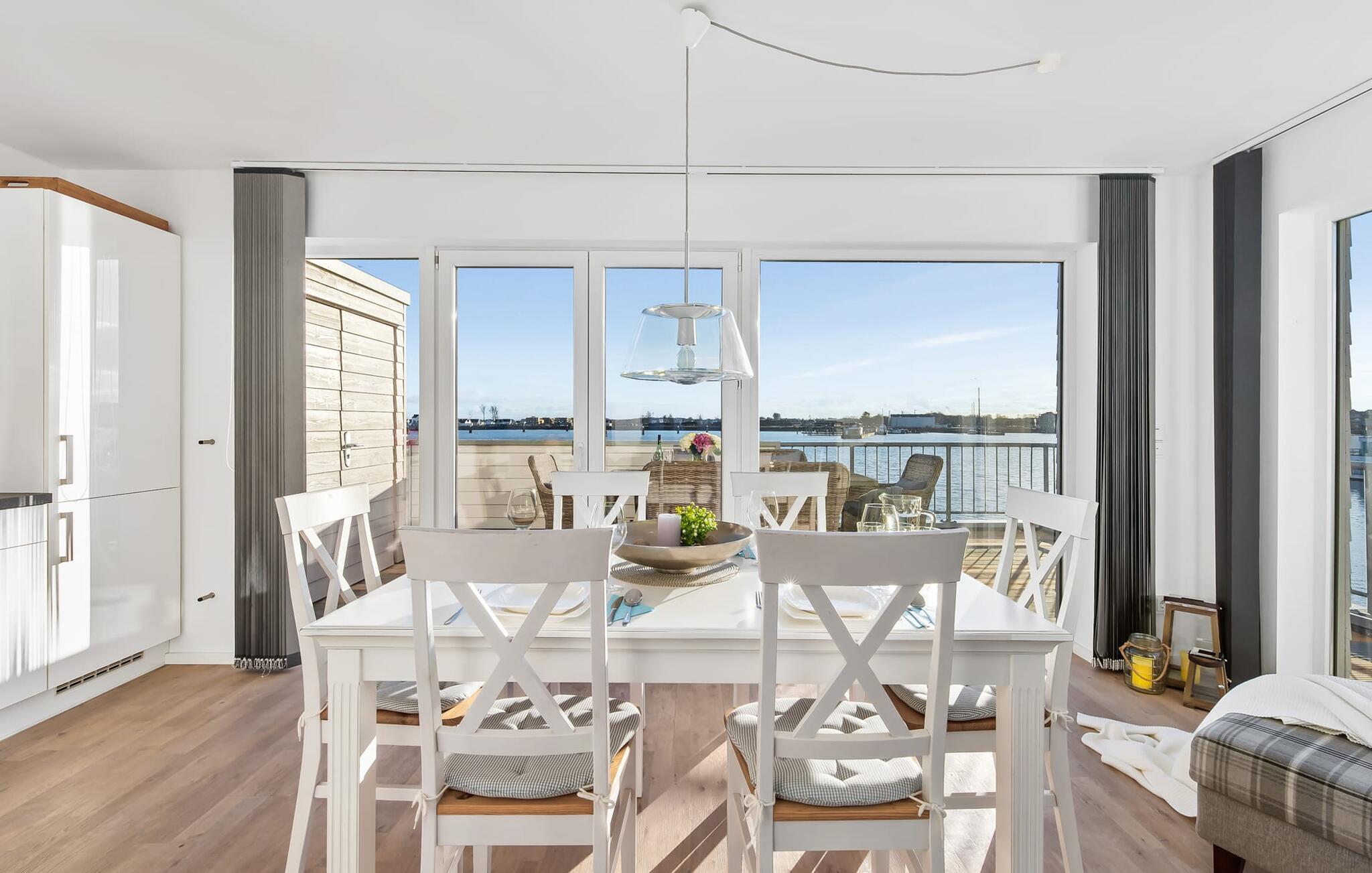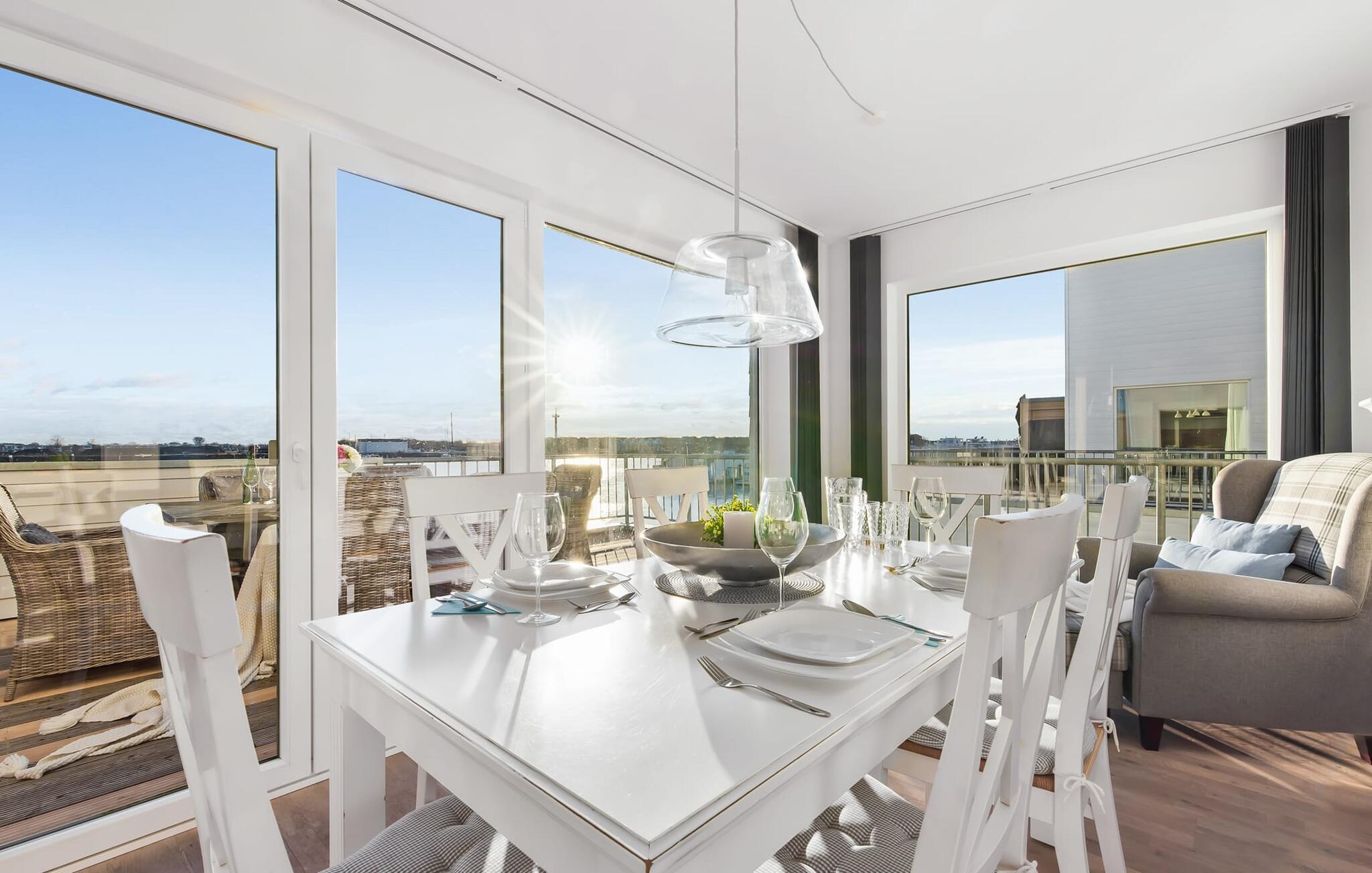 Ferielejlighedens stue/spisestue er oversvømmet med lys med panoramavinduer fra gulv til loft ud mod havnen og Sleien. En fantastisk udsigt åbner op på terrassen ved siden af ??spisepladsen med udsigt over sejler- og sportsbådshavnen i feriestedet Olpenitz ved Østersøen.