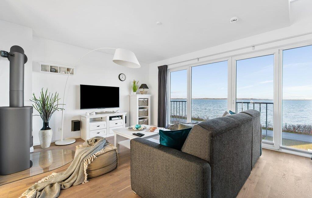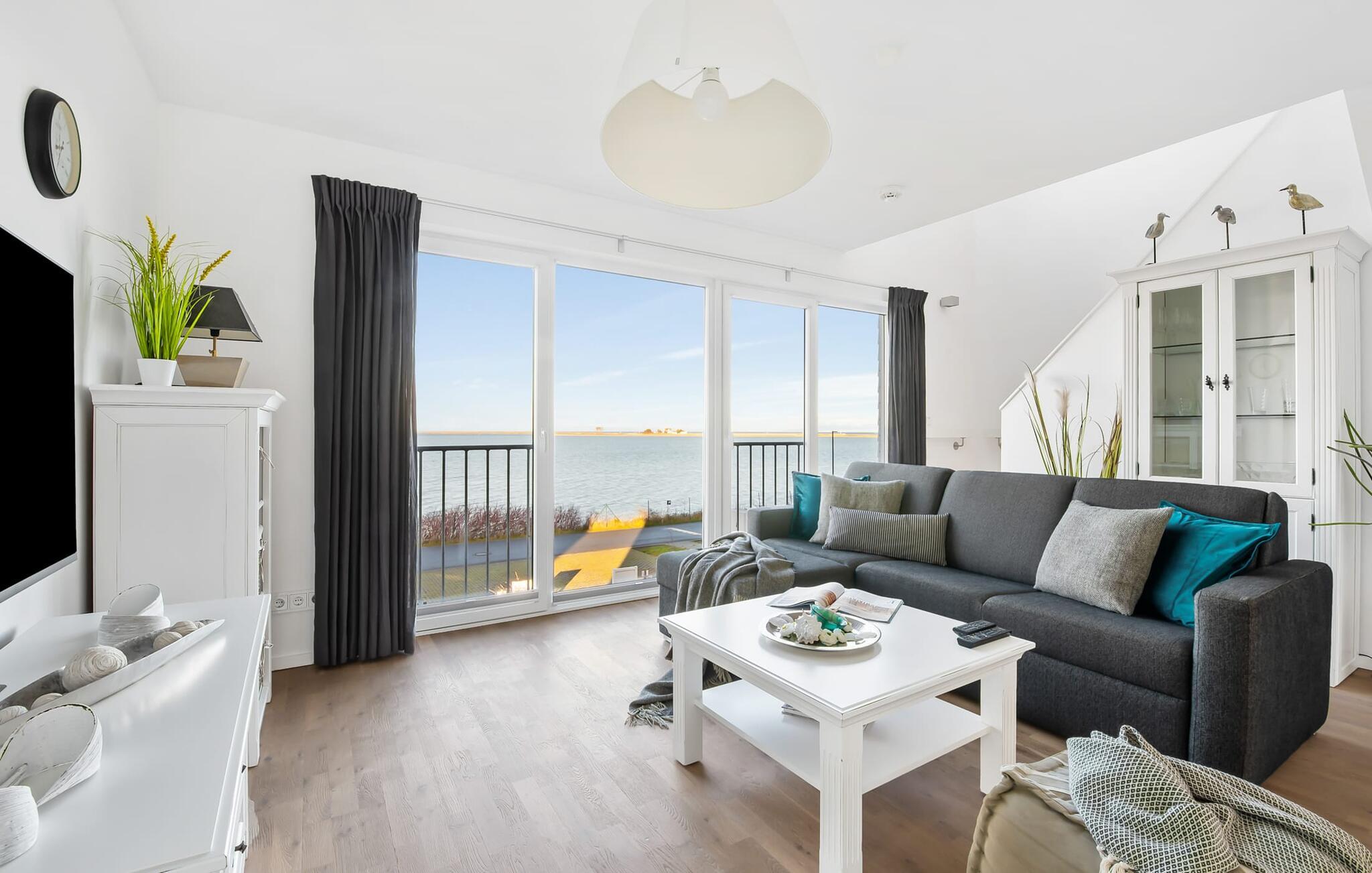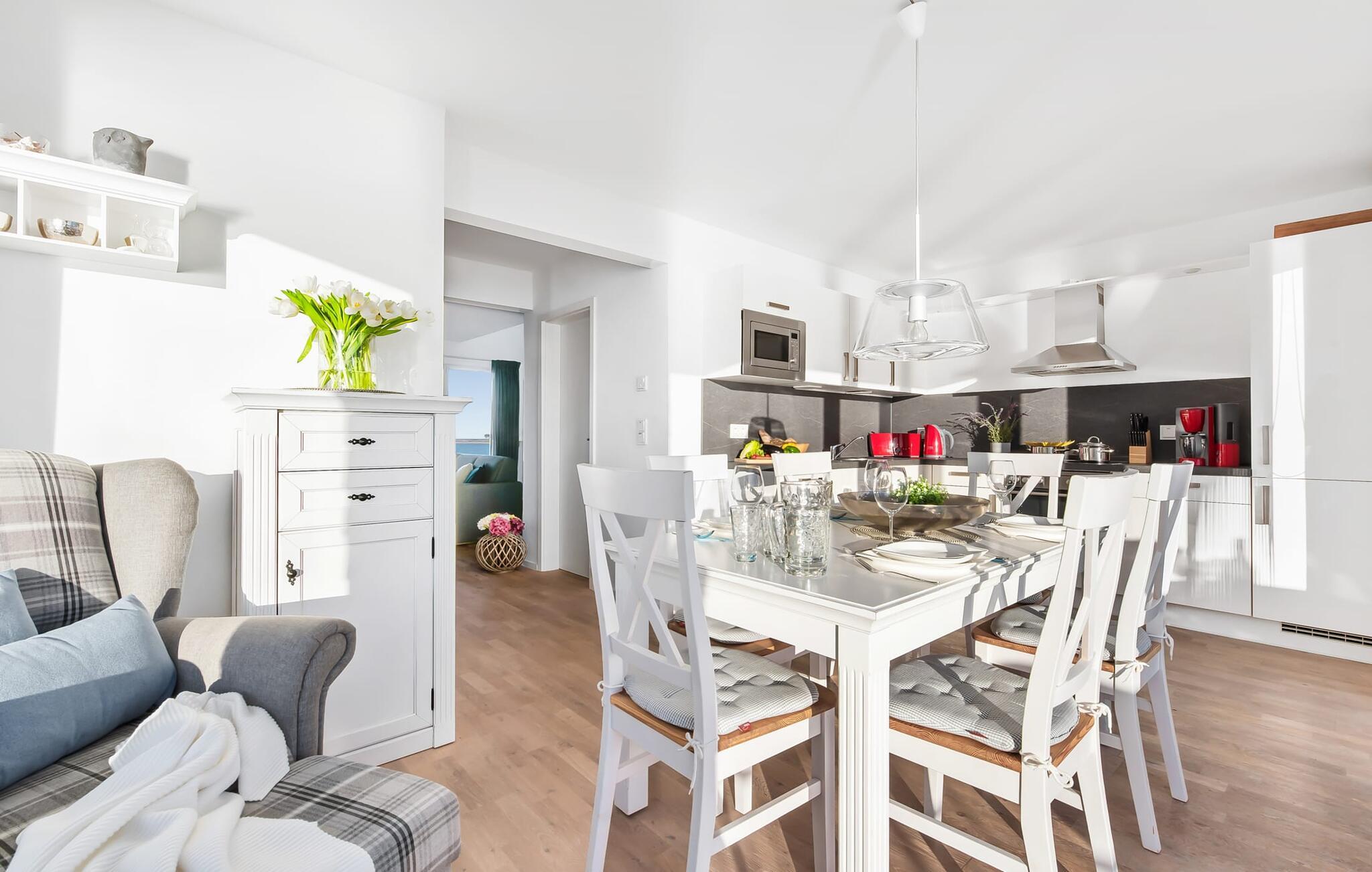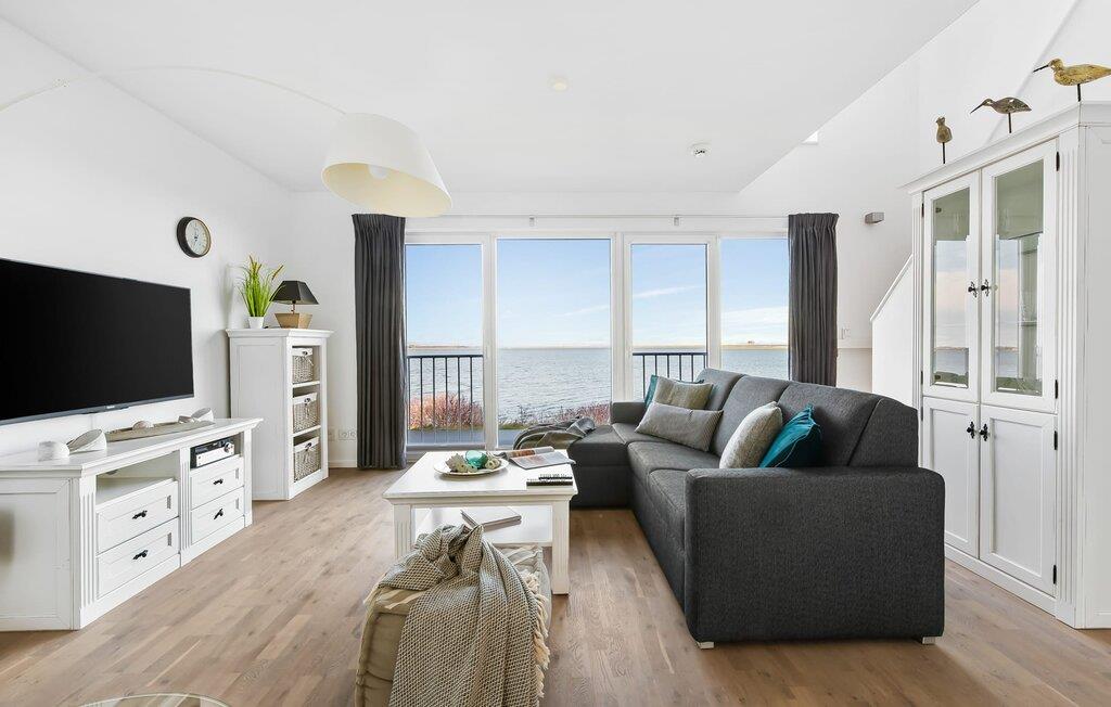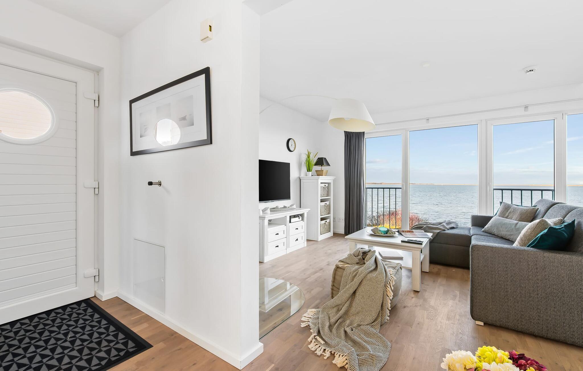 Ferielejlighedens stue/spisestue er oversvømmet med lys med panoramavinduer fra gulv til loft ud mod havnen og Sleien. En fantastisk udsigt åbner op på terrassen ved siden af ??spisepladsen med udsigt over sejler- og sportsbådshavnen i feriestedet Olpenitz ved Østersøen.