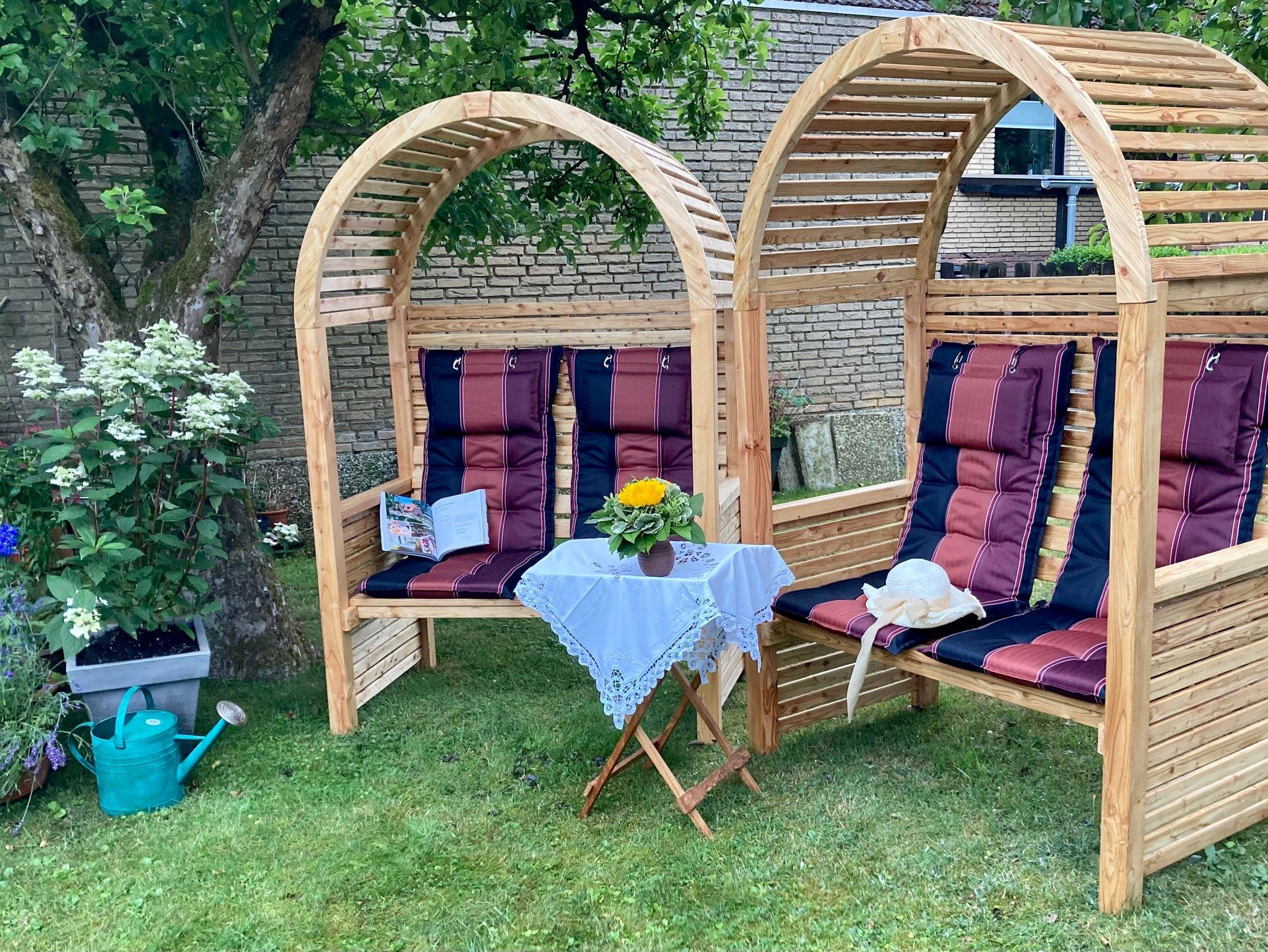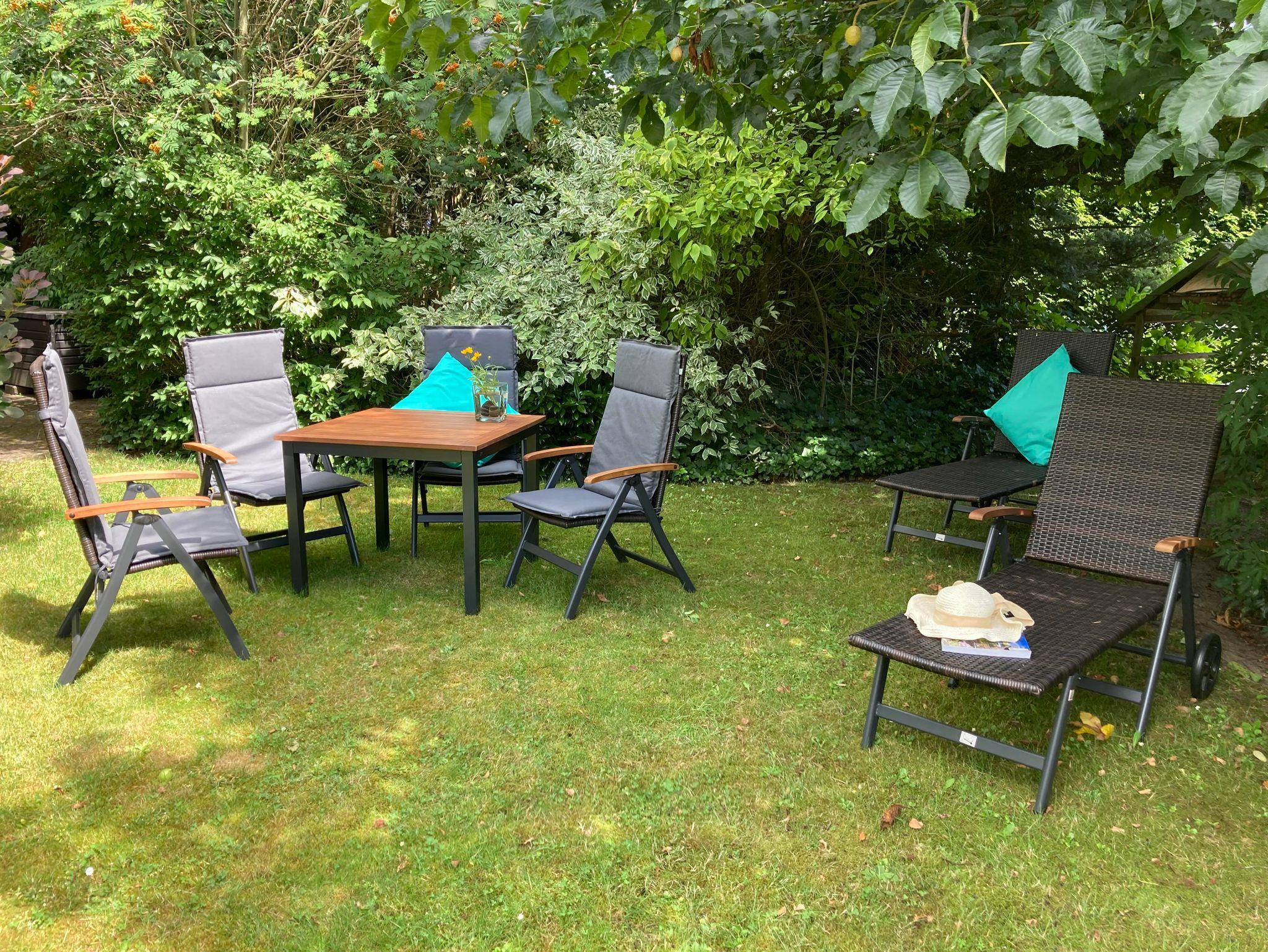Der große Garten lädt mit Sitzgruppen und Liegen zum Lesen, Sonnenbaden oder Picknicken ein.