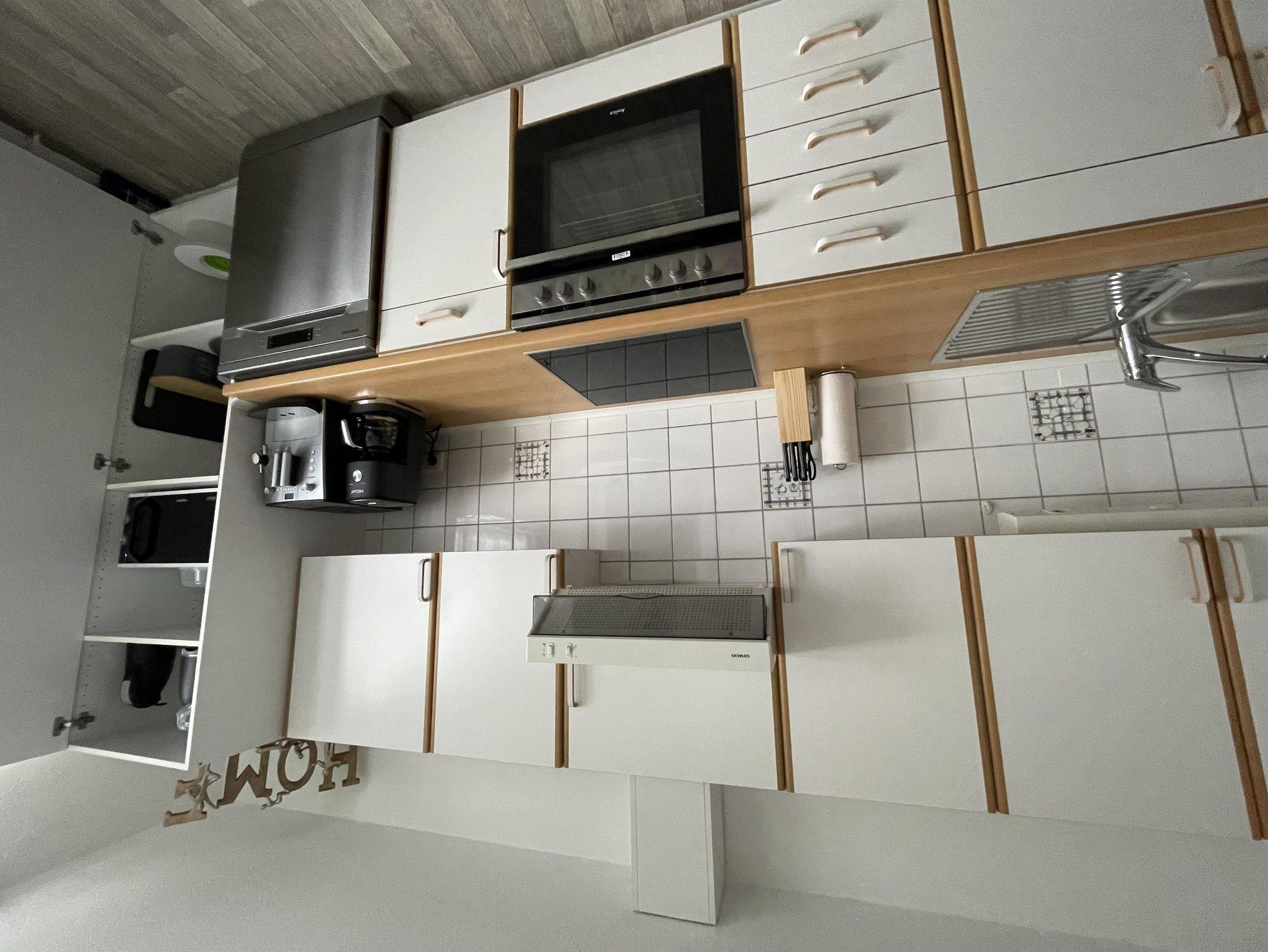 Die Küche ist komplett eingerichtet: Küchenzeile mit Backofen, Ceranfeld, Geschirrspülmaschine, Kaffeevollautomat, Kaffeemaschine, Toaster, Mikrowelle, Geschirr, Töpfe und Pfannen.