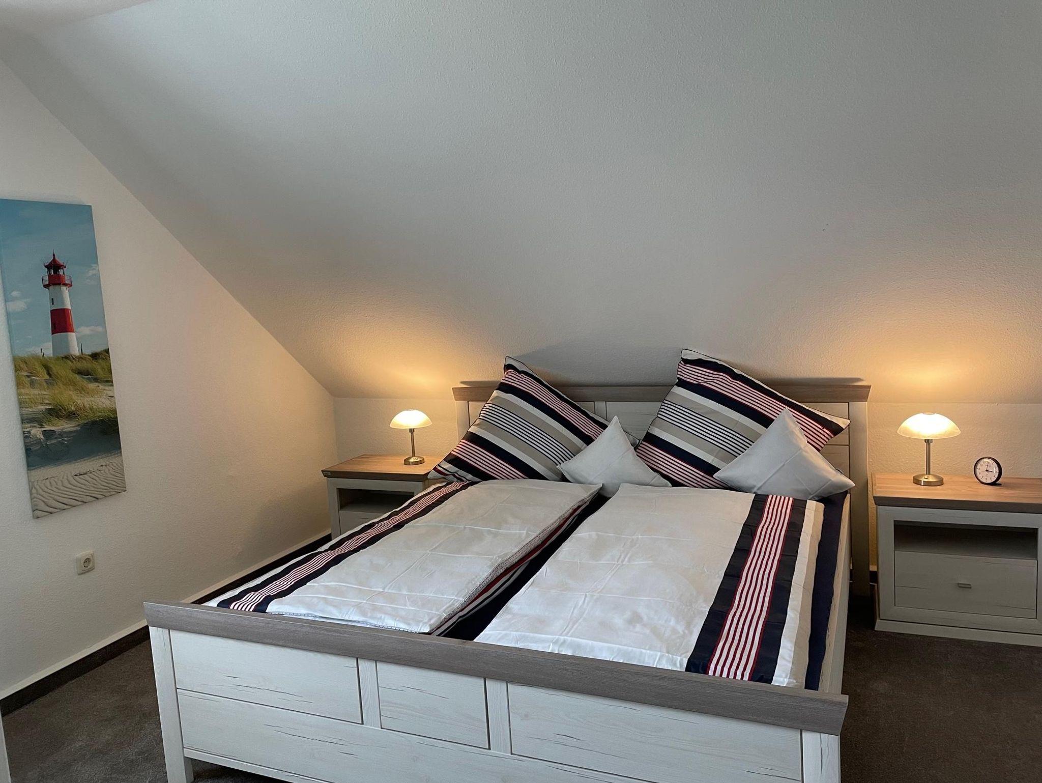Das Schlafzimmer besteht aus einem Doppelbett zwei Nachtischen und Leselampen, Ihre Kleidung können Sie im geräumigen 3-türigen Spiegelkleiderschrank unterbringen. Hier finden Sie auch zwei zusätzliche Decken und sowie einen Safe.