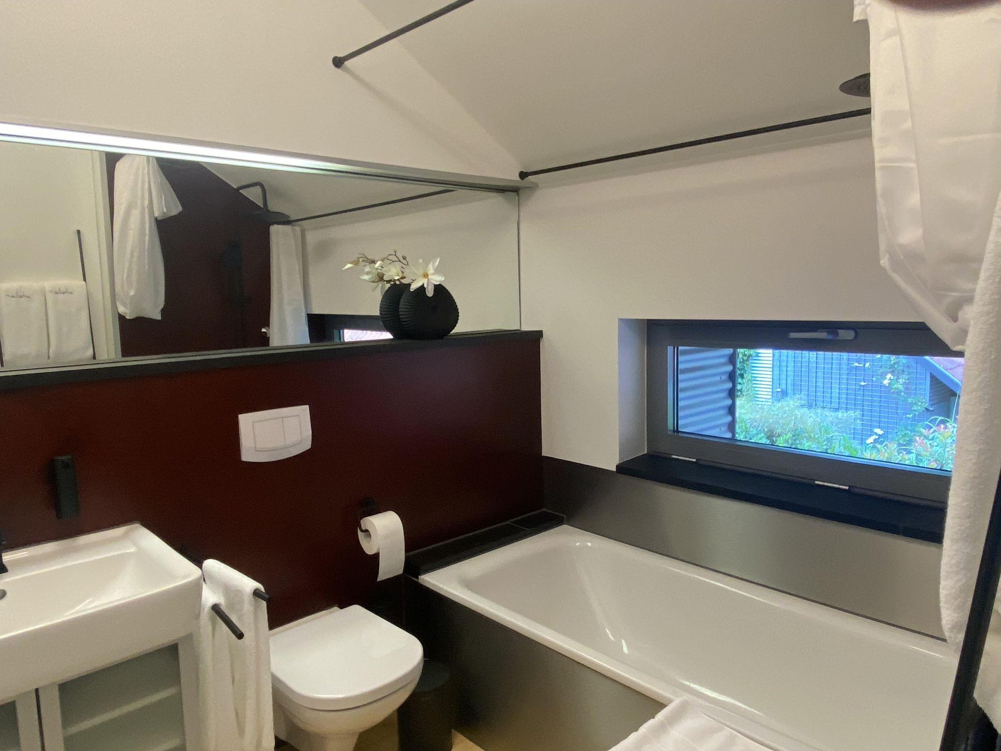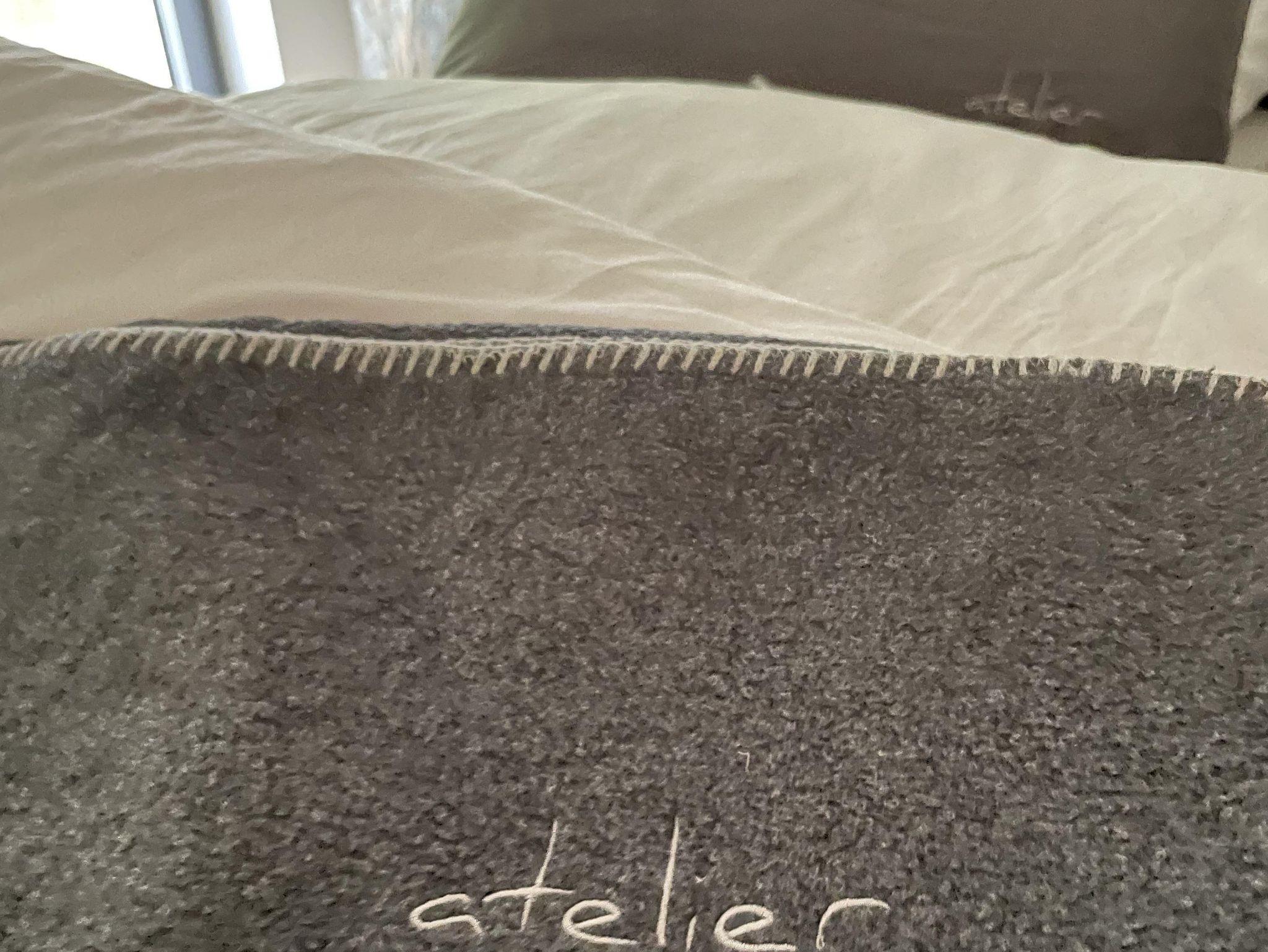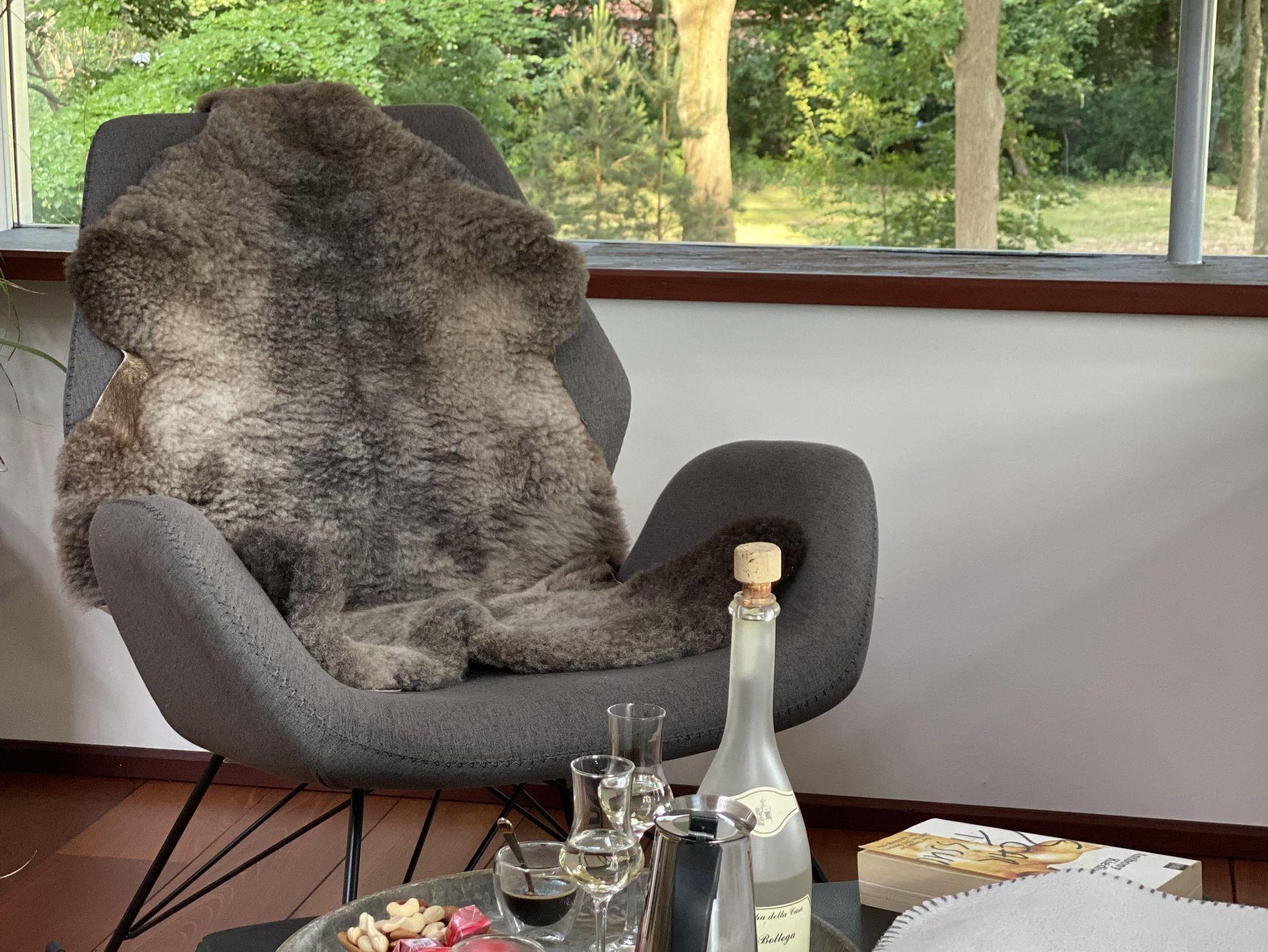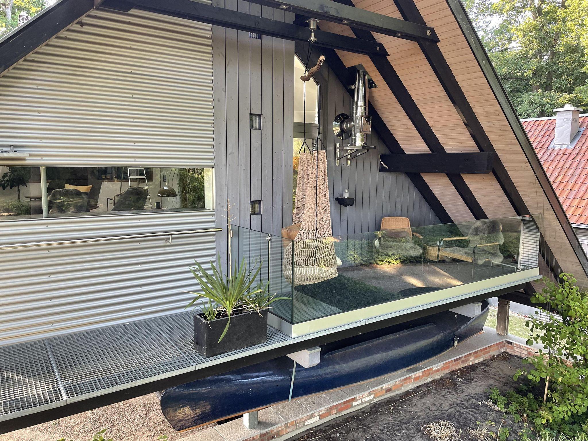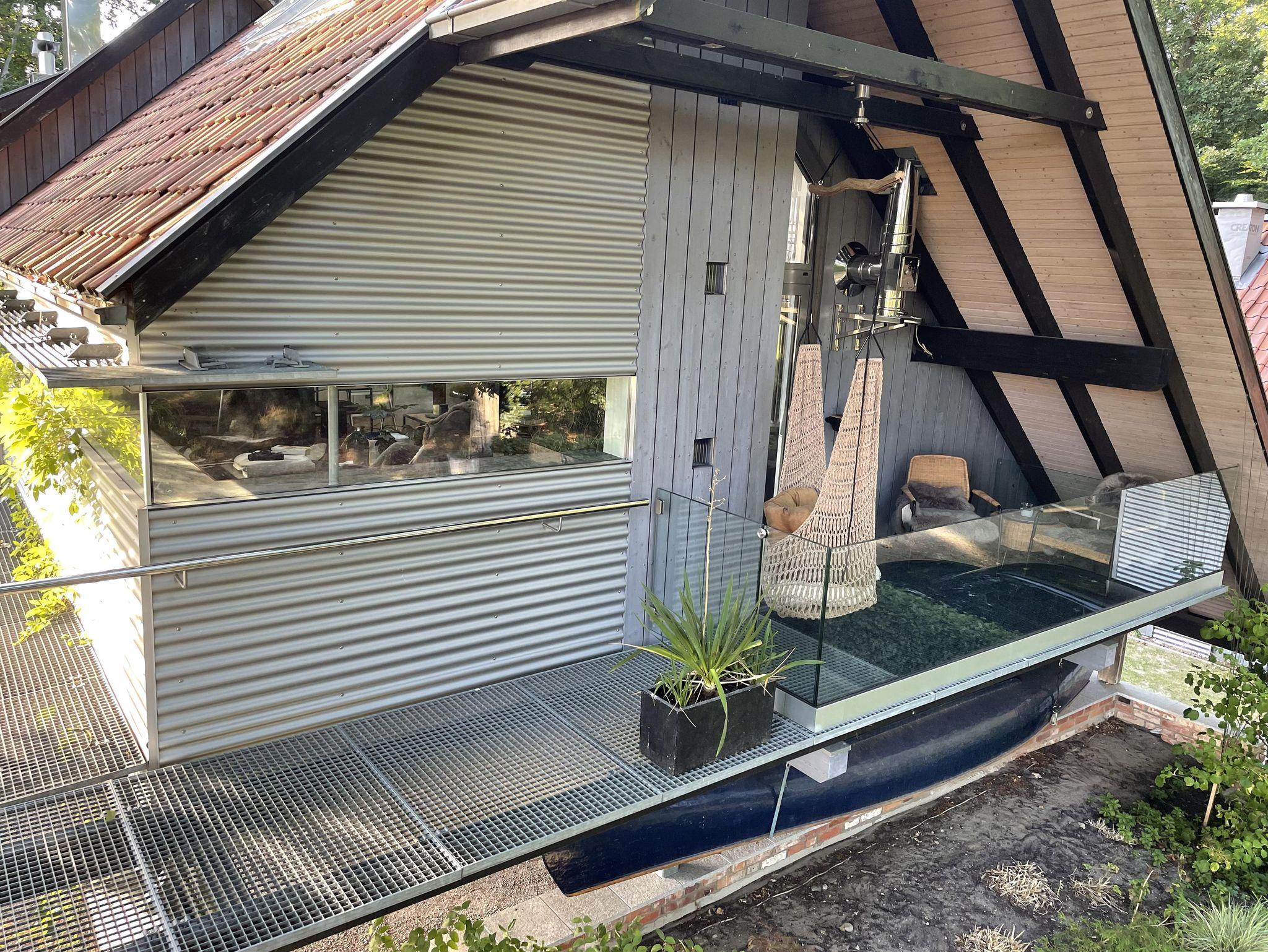 Ein überdachter, windgeschützter Außenbereich mit Lounge-Möblierung ist direkt vom Atelier aus zu begehen.
