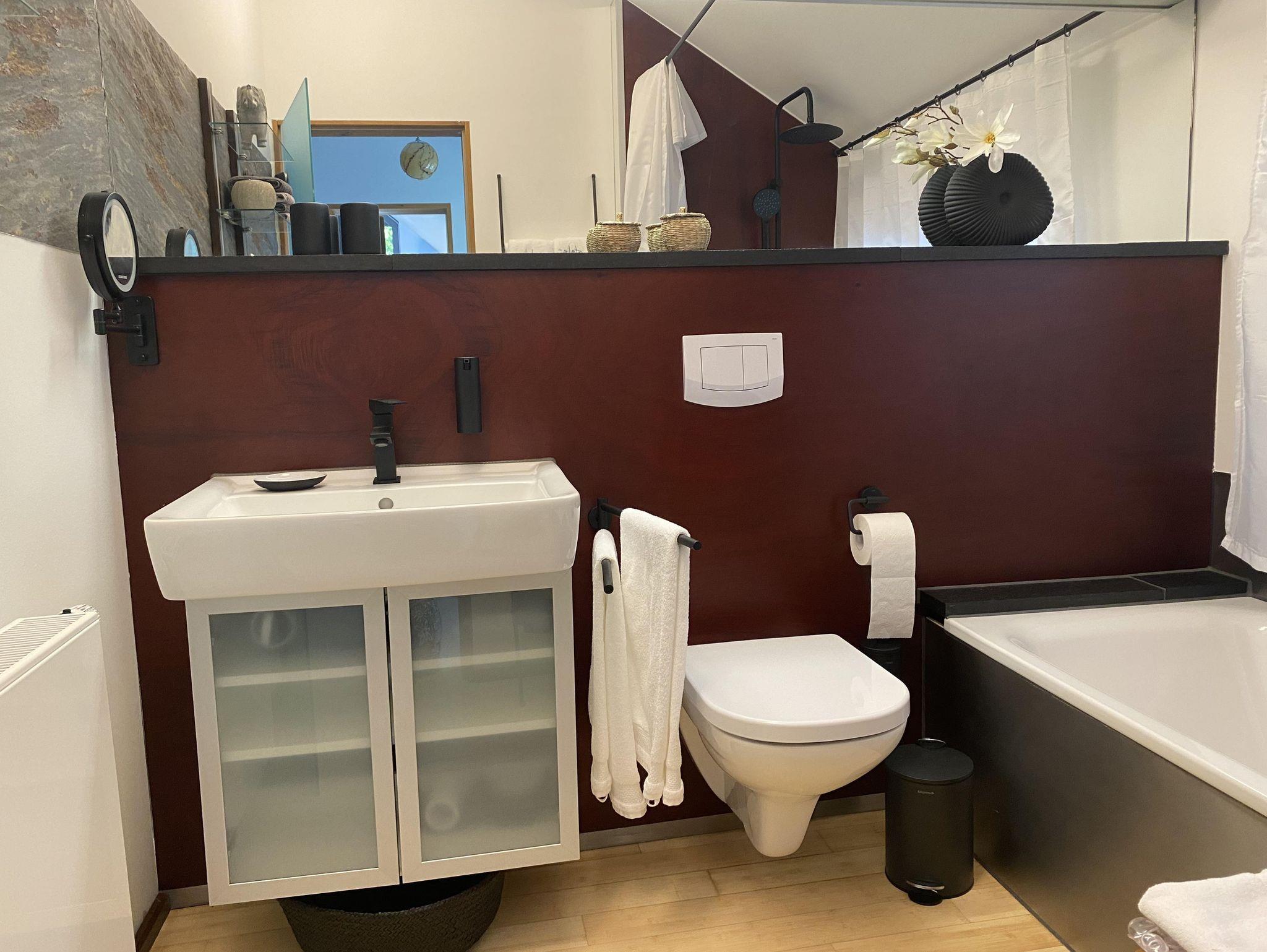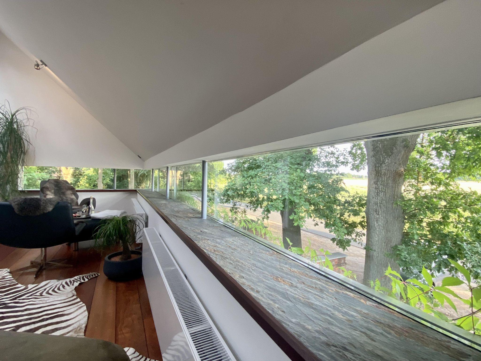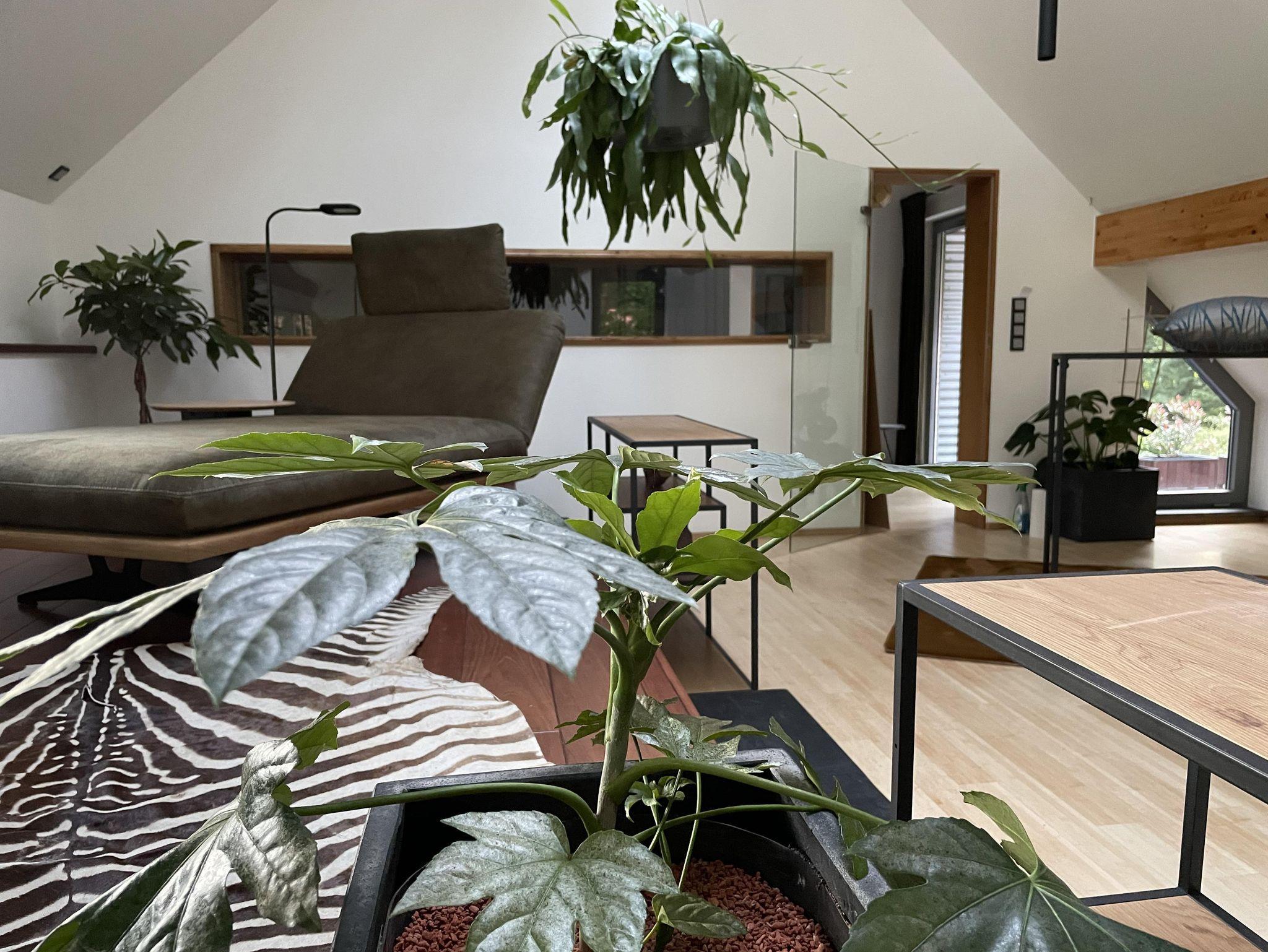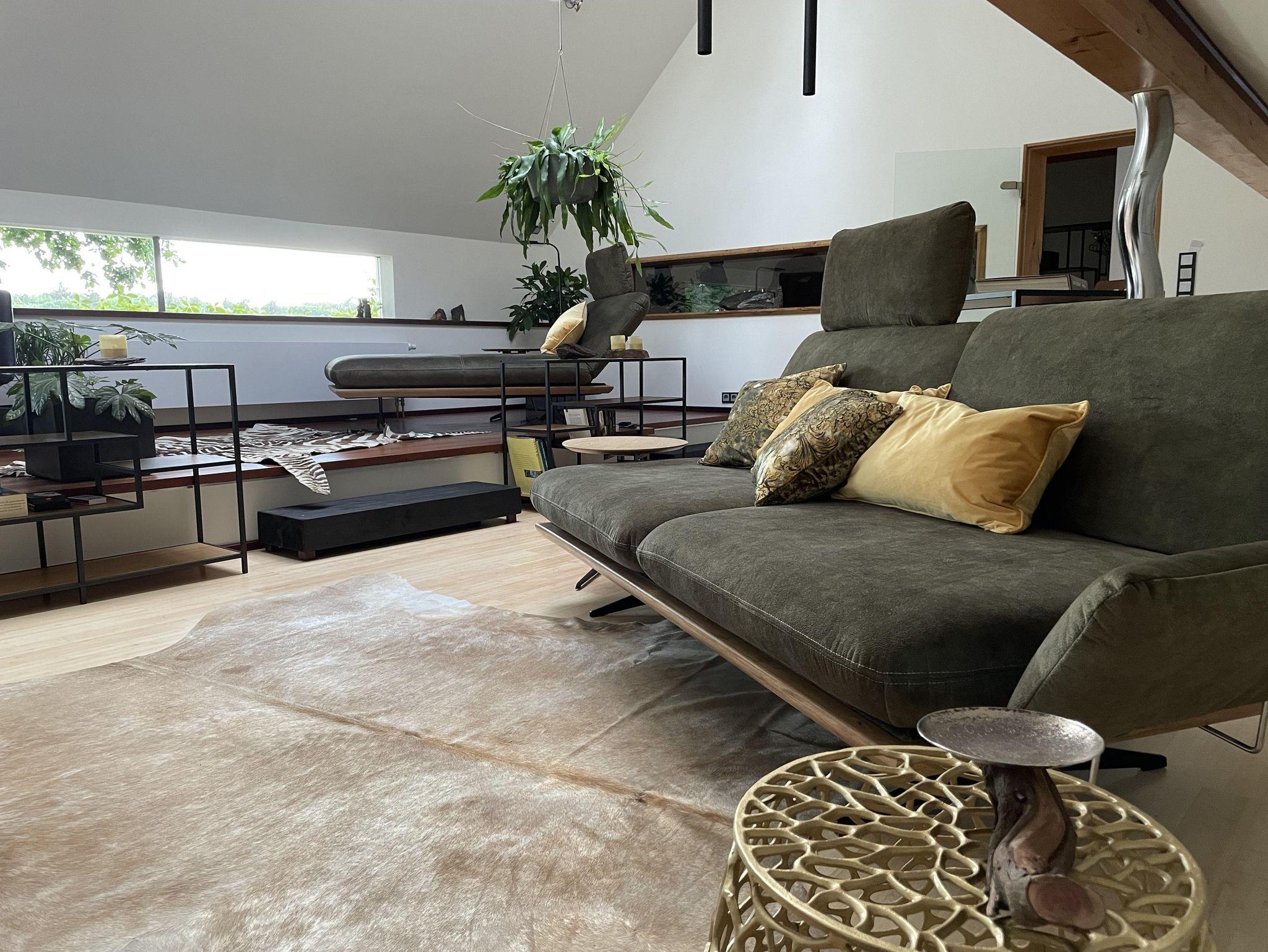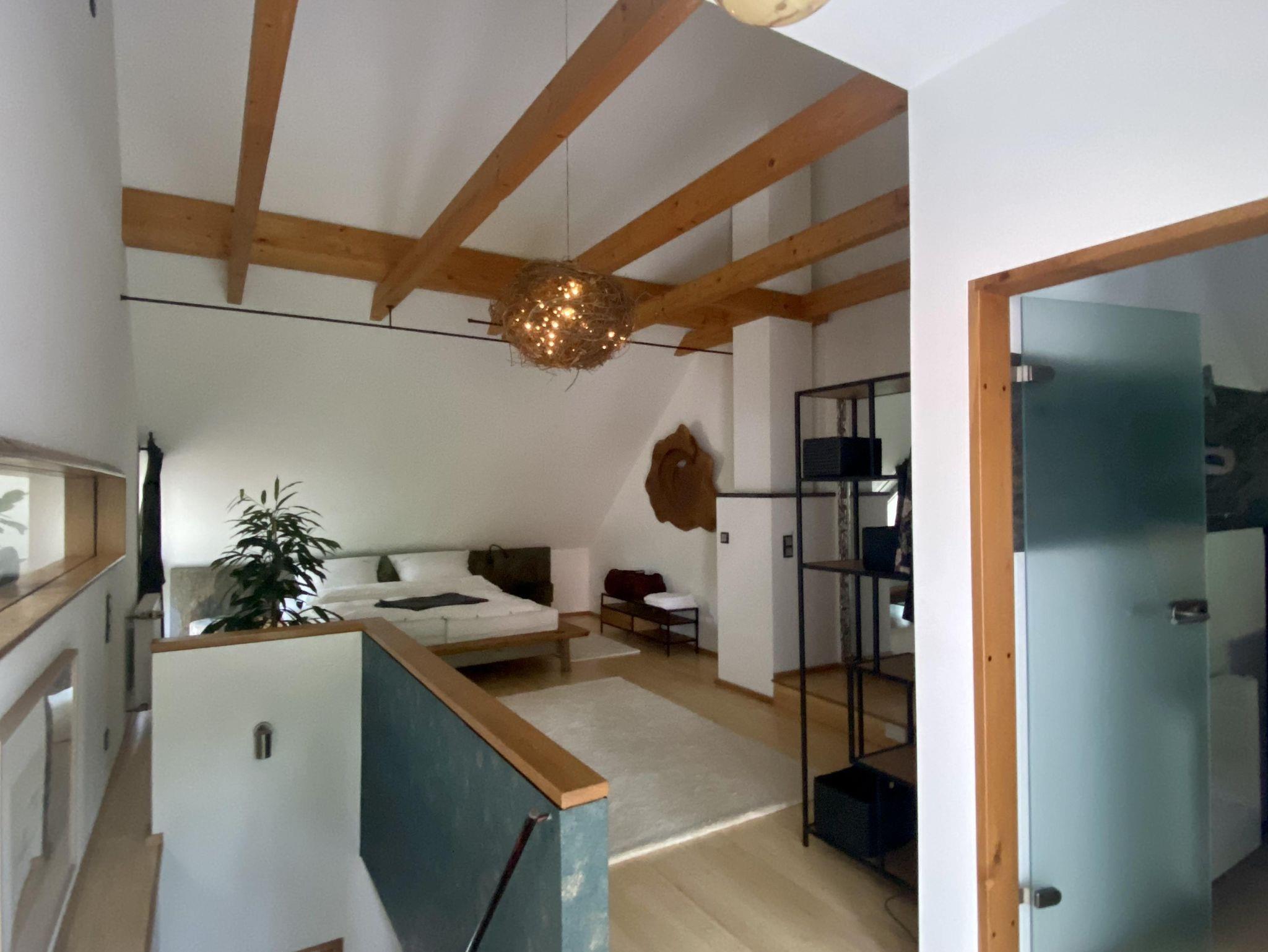 Über die Treppe gelangt man in das loftartig ausgebaute OG, mit Schlaf-Ankleidebereich, elektr. verstellbarem Massivholz-Doppelbett und dimmbaren Leseleuchten. Angrenzend liegt das separate Bad mit Wanne und Duschmöglichkeit. Über den offenen Flurbereich betritt man den lichtdurchfluteten Atelier-Wohnbereich mit Panorama-Verglasung. Diverse Sitz- und Ruhemöbel, ein kleiner Office-Bereich sowie digitale Endgeräte (TV/dab+Radio/Bluetoothbox) sind ebenso vorhanden, wie ein weiterer Kaminofen. Alle Räume, bis auf Küche und Entree, sind mit Massivholzböden belegt.