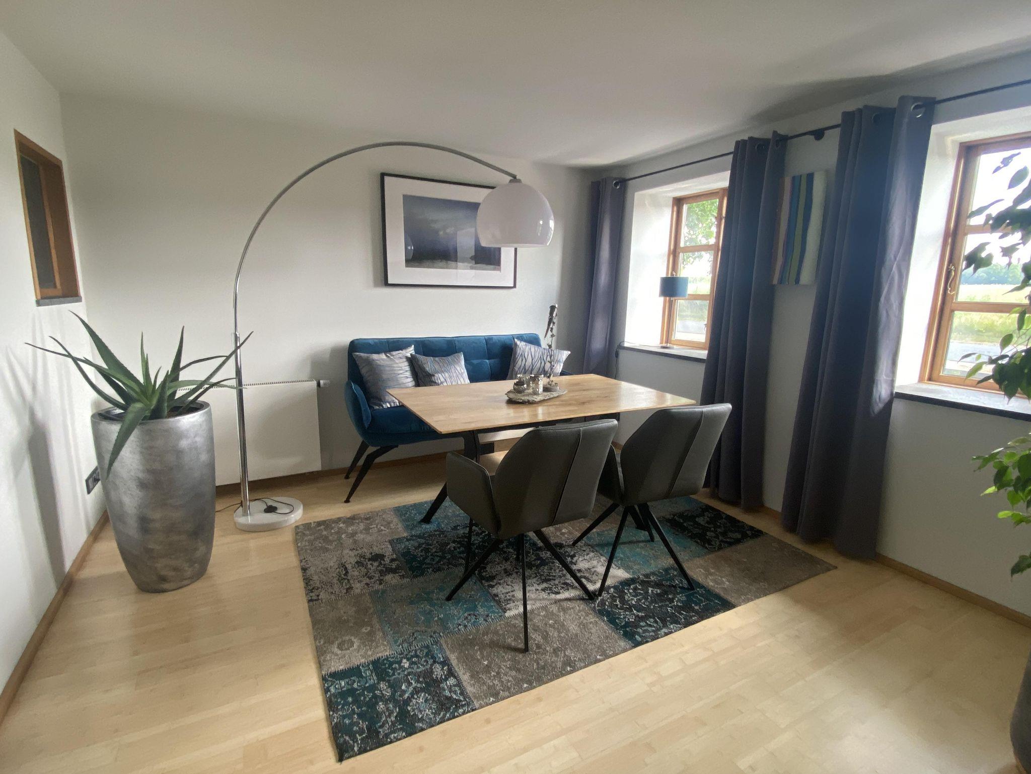 Im EG befindet sich die vollausgestattete Einbau-Küche, mit Abstellraum und Waschmaschine sowie das südausgerichtete Esszimmer mit Kaminofen.