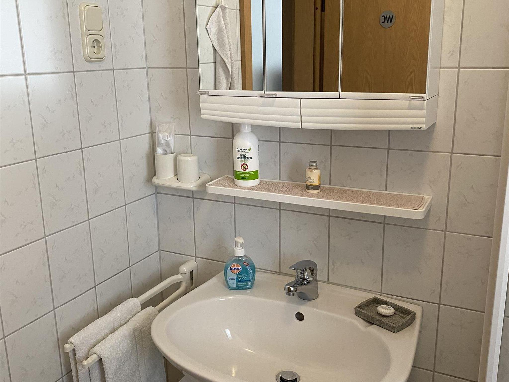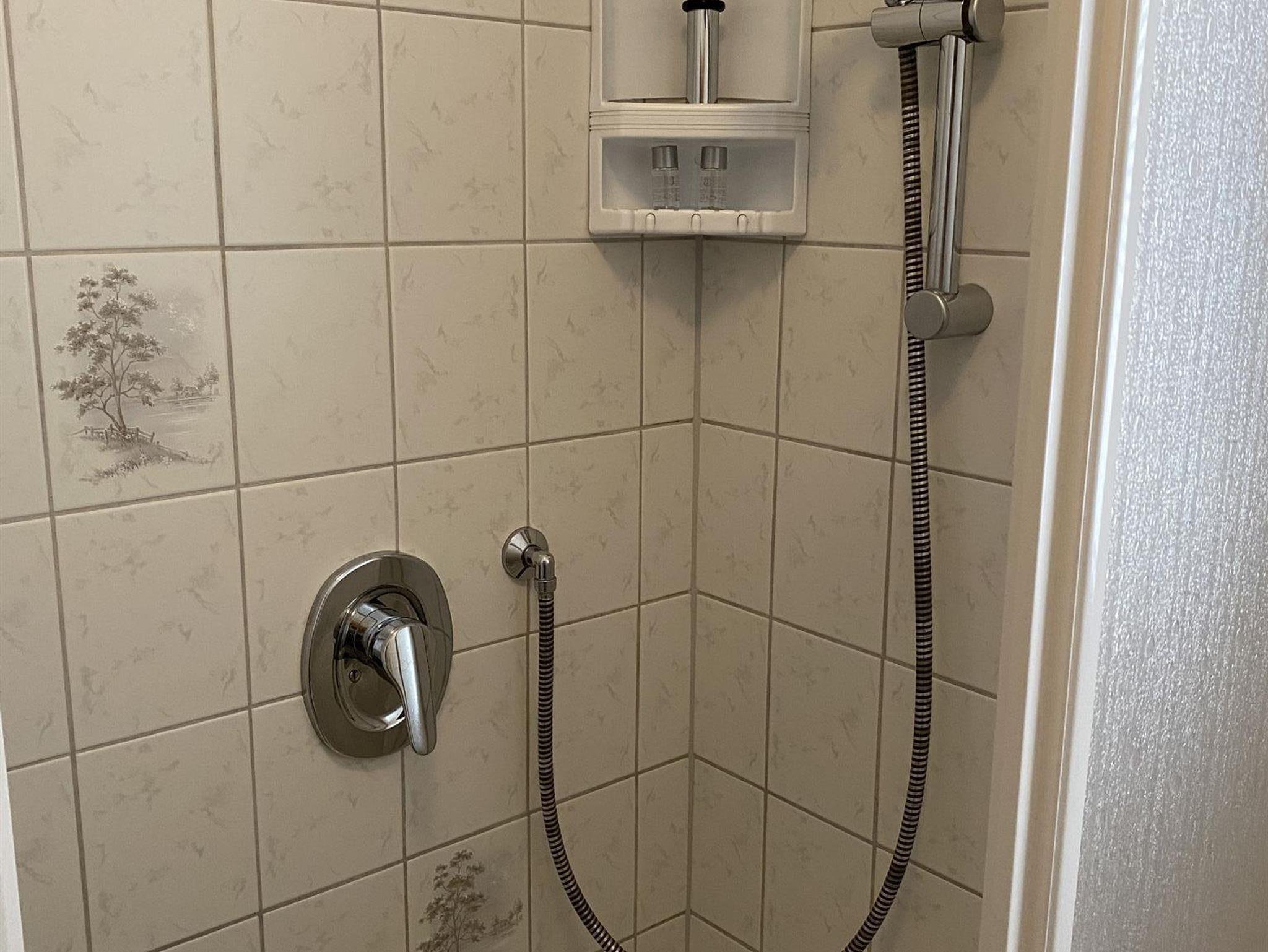 Dusche/WC mit Fenster, Handbrause; Waschtisch mit Spiegelschrank, Kosmetikspiegel, Fön;
