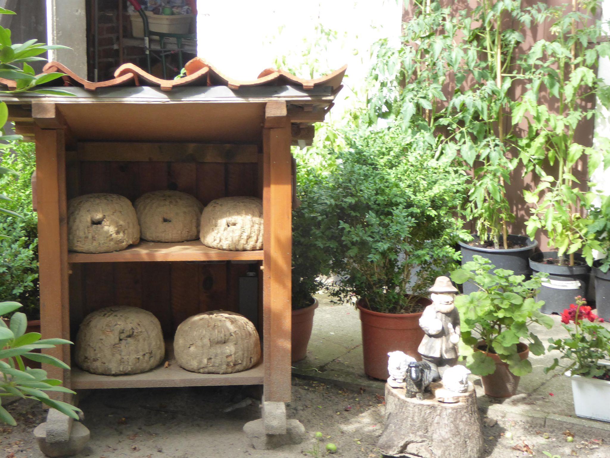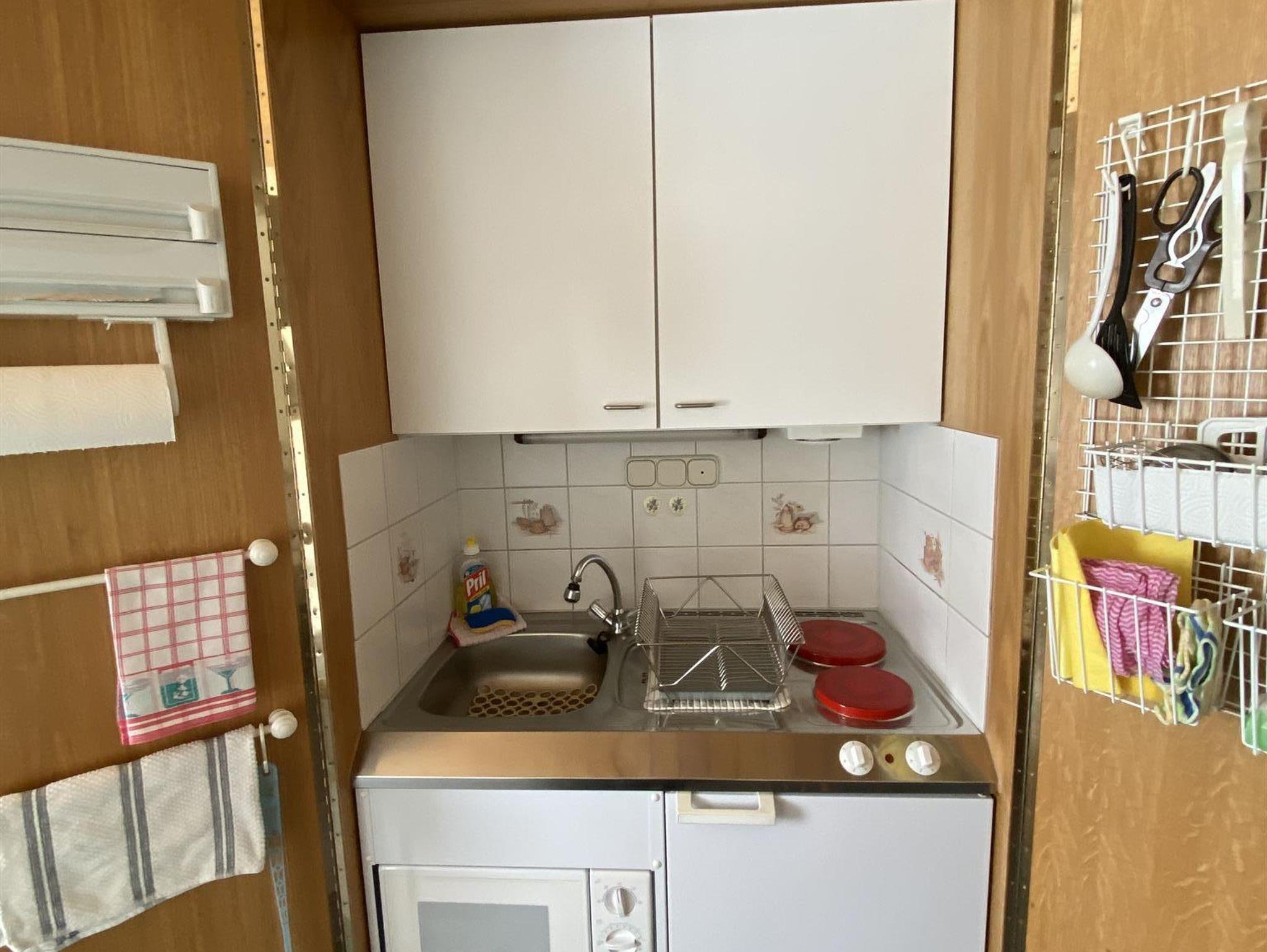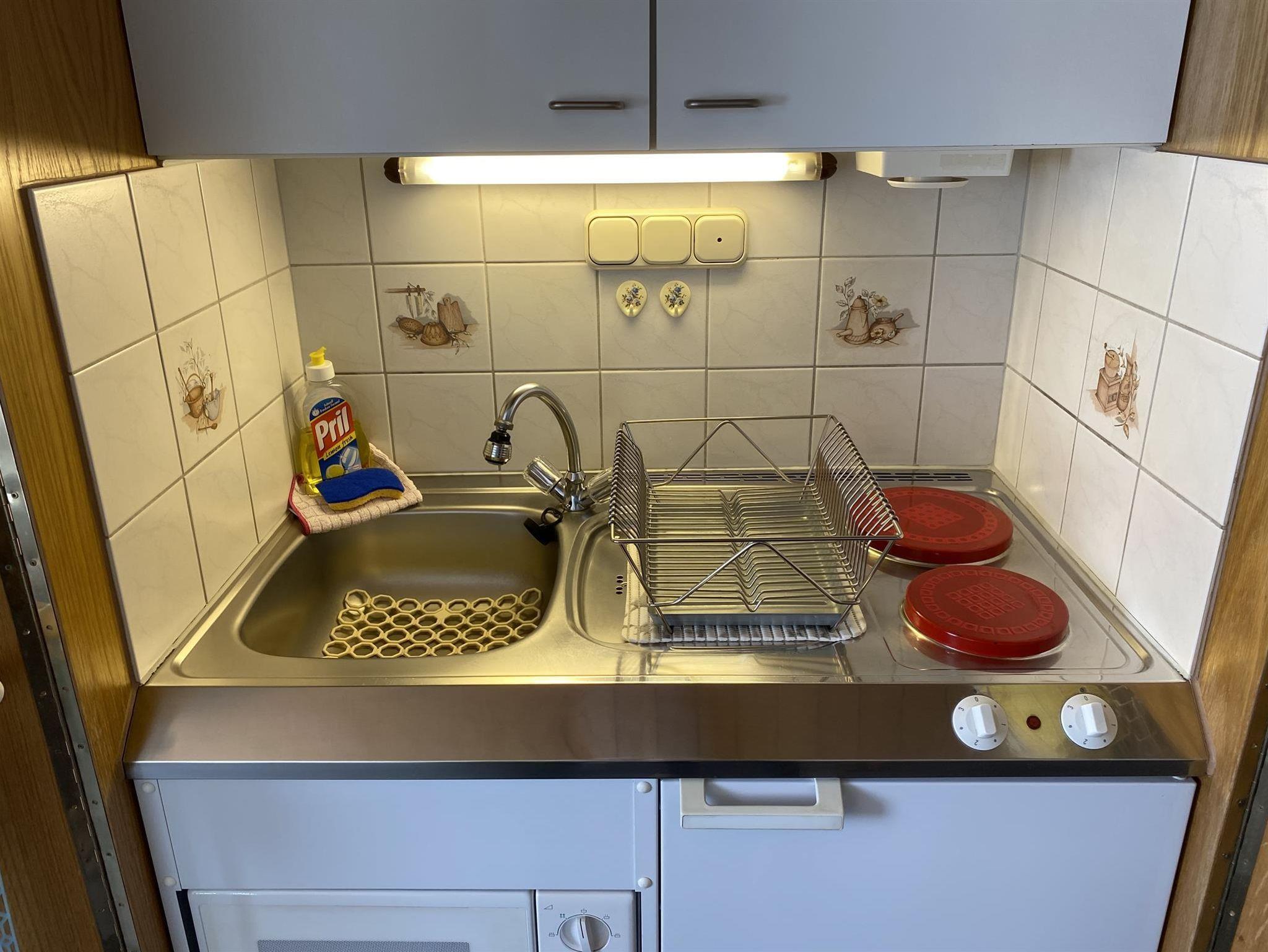 Kleinküche mit Kühlschrank (inkl. Gefrierfach), Spüle und Zweiplattenherd, Backofen, Mikrow. mit Grill, Toaster, Kaffeemaschine und Kaffeefilter, Wasserkocher, Eierk., Gewürze, Geschirr, Besteck, Töpfe, Pfanne etc. sowie div. weiteres Kücheninventar;