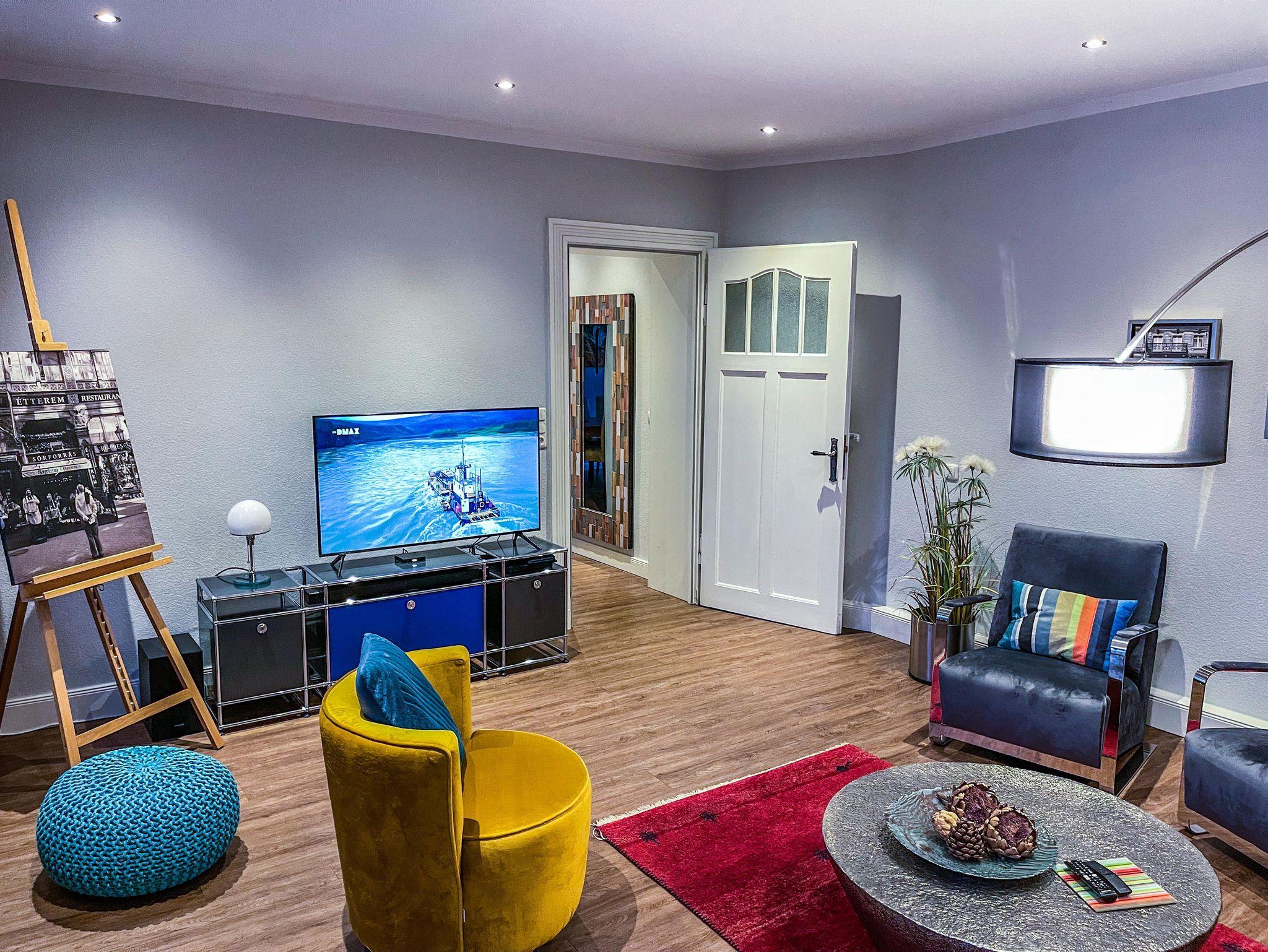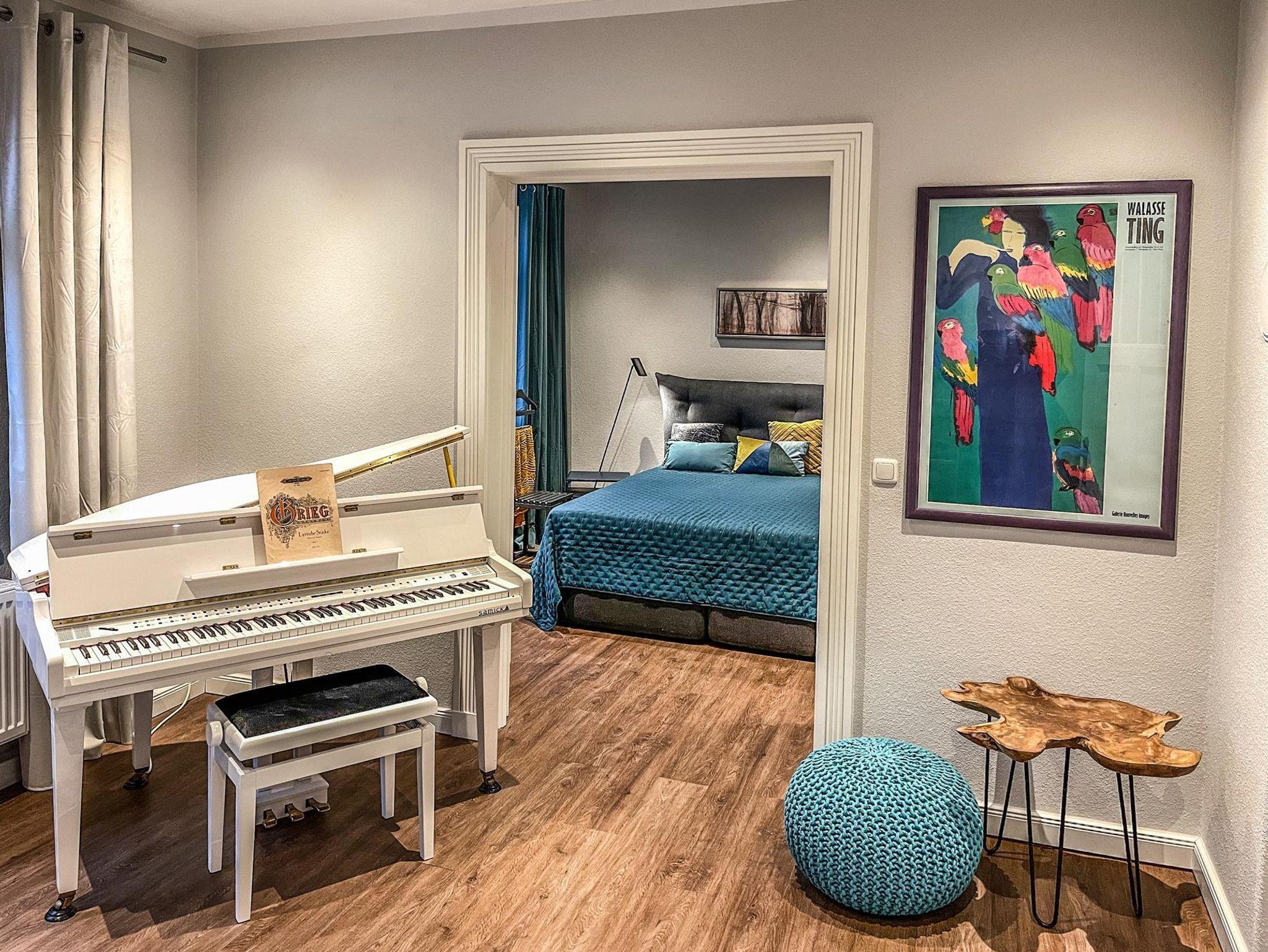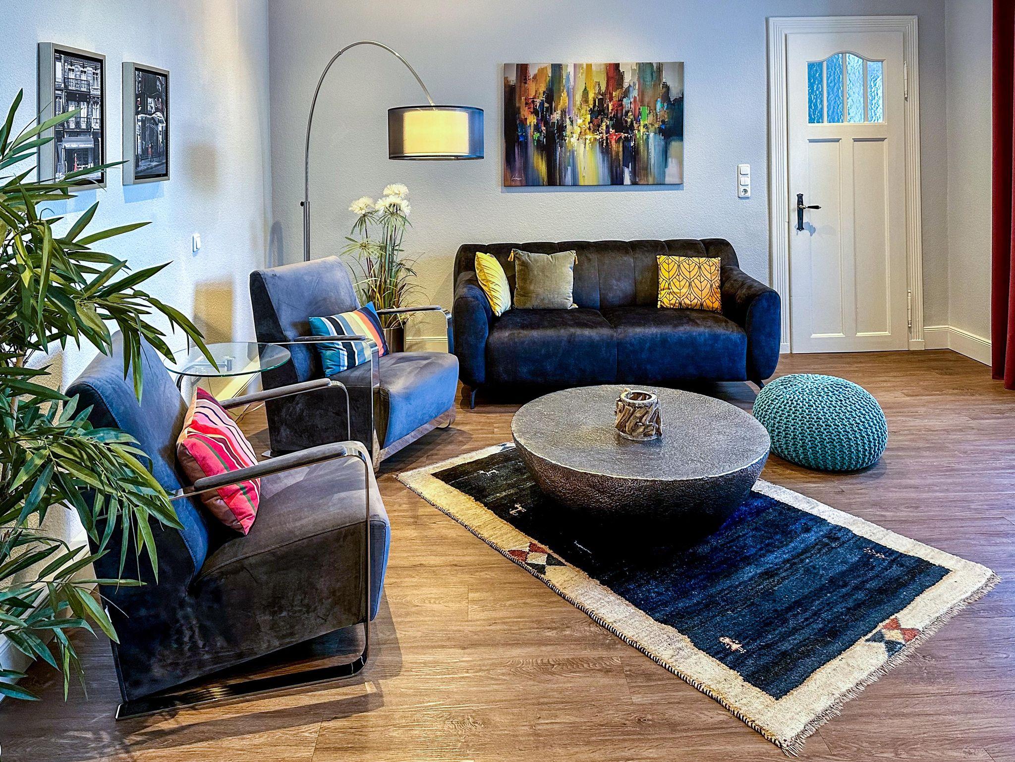 die EINS: Die Große mit dem etwas Mehr. 5 Zi., 122 qm für 1-4, Boxspringbett, Wasserbett (Gel), 2 Bäder mit Walk-in Dusche od. Badewanne. Bibliothek-Musikzi., Terrasse, Balkon zum Park