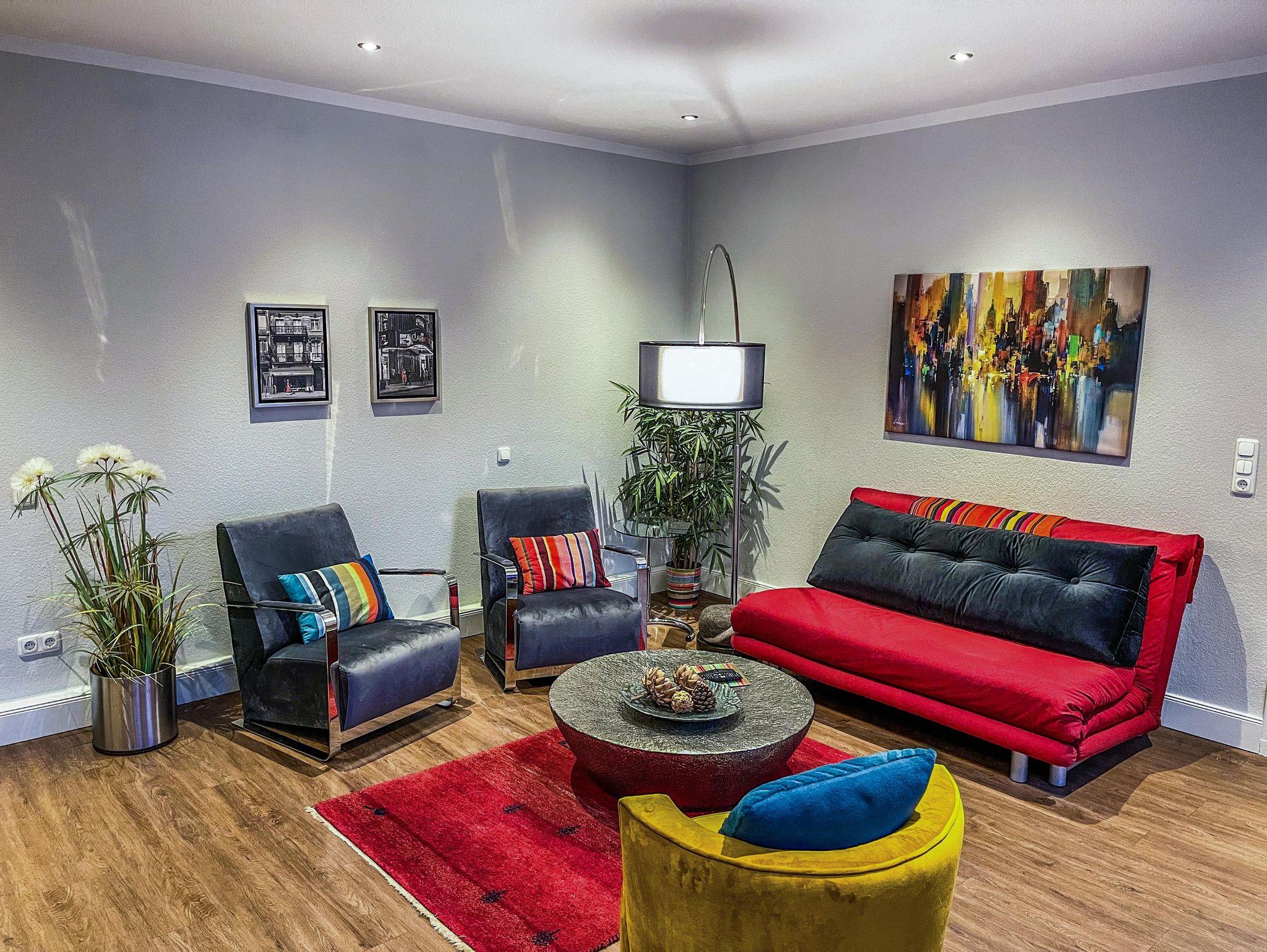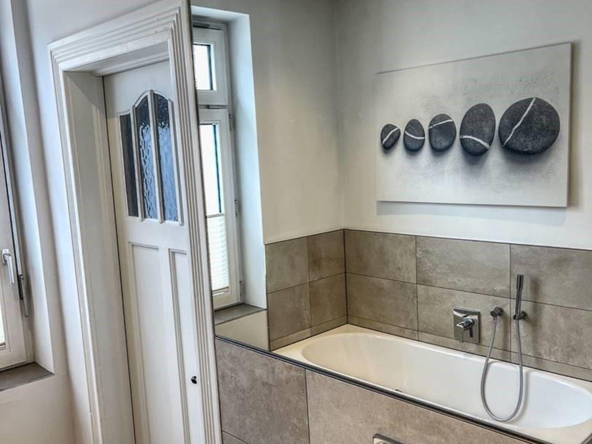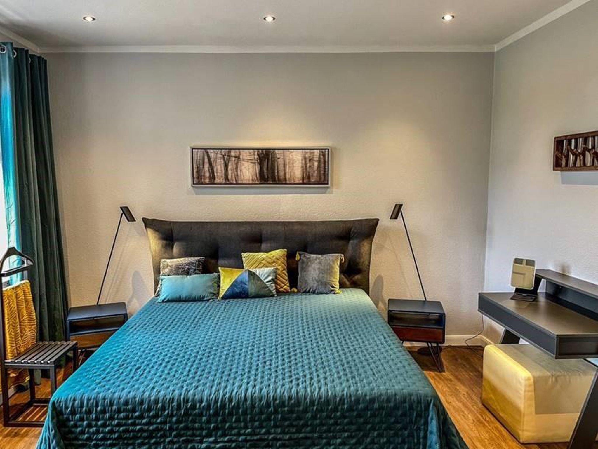 die EINS: Die Große mit dem etwas Mehr. 5 Zi., 122 qm für 1-4, Boxspringbett, Wasserbett (Gel), 2 Bäder mit Walk-in Dusche od. Badewanne. Bibliothek-Musikzi., Terrasse, Balkon zum Park