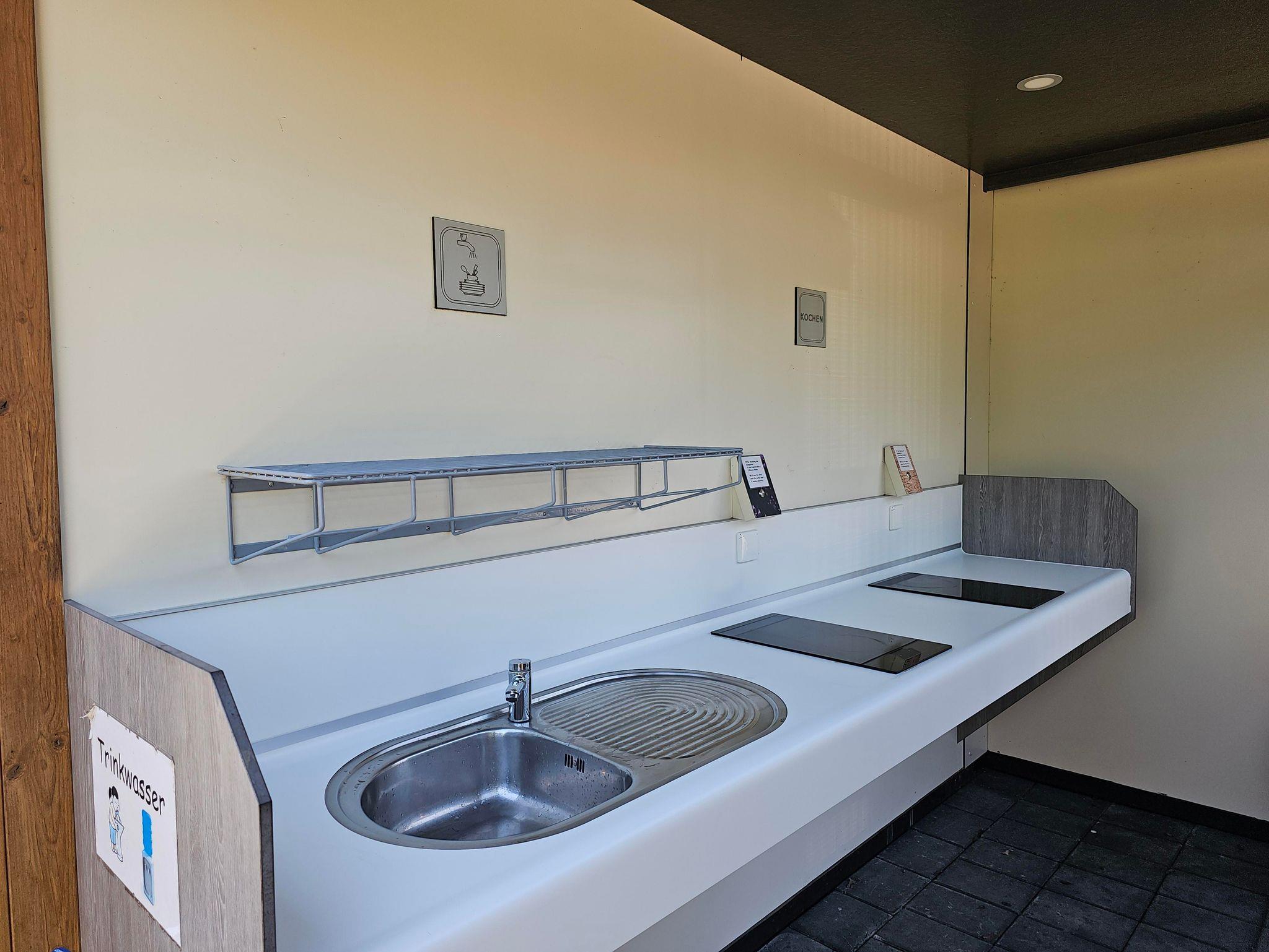 - Küche mit Spüle, Induktionsplatte mit zwei Feldern, Kühlschrank, Kaffeemaschine, Wasserkocher, Toaster und Inventar