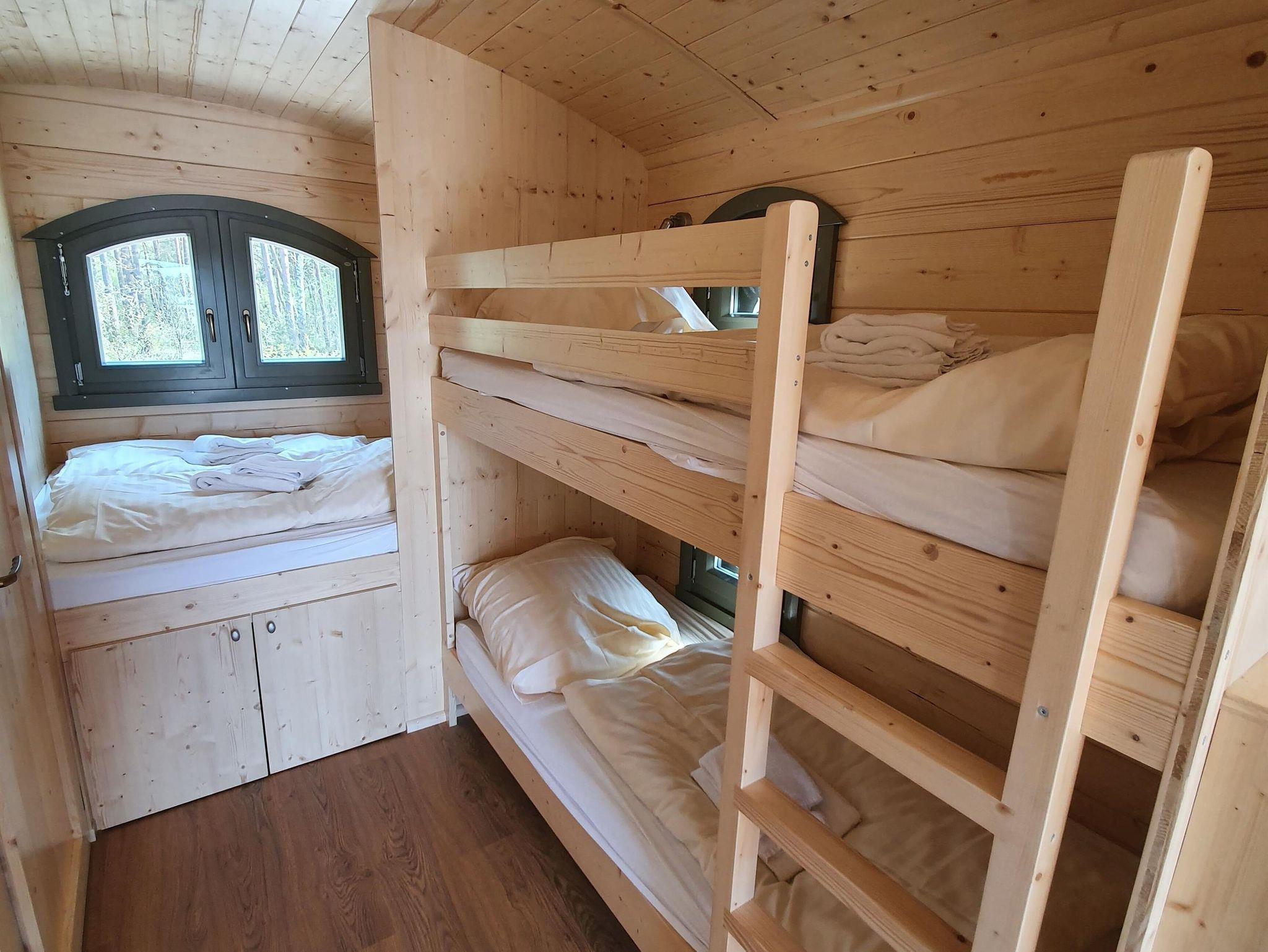 Bis zu 4 Junggebliebene und Abenteurer erleben im Schäferwagen ein einmaliges Urlaubsgefühl. Sie sind 21 m² groß und haben eine 6 m² große überdachte Terrasse. Bettwäsche, Handtücher, Internet, Nebenkosten und Endreinigung sind im Preis enthalten.