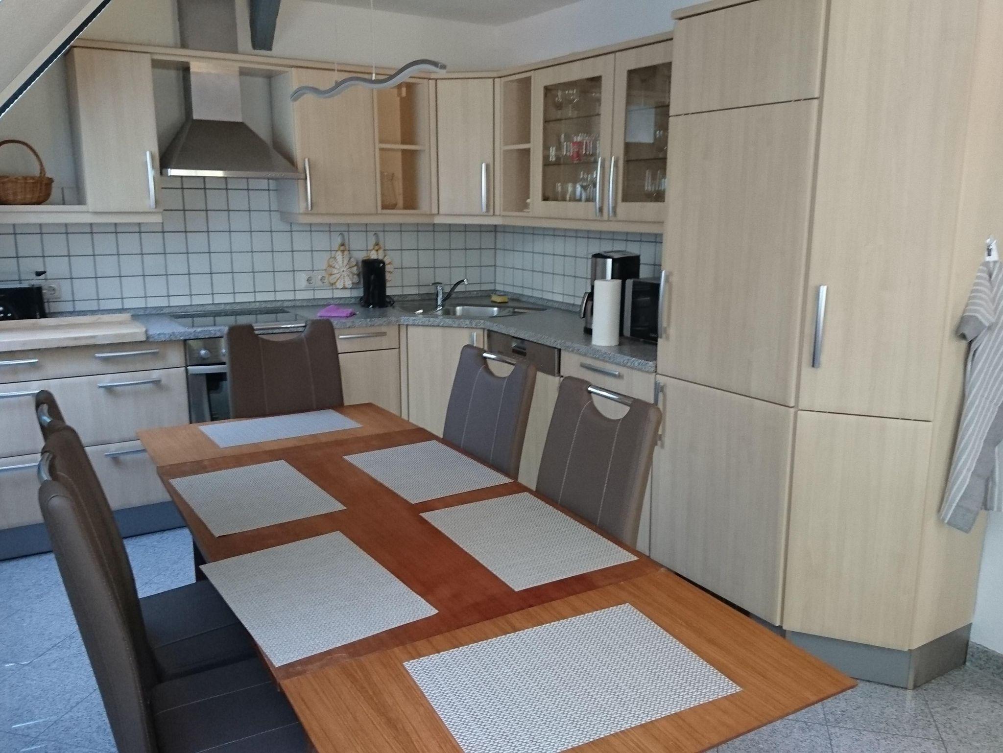 Die Einbauküche ist mit Kühlschrank, Gefrierschrank, 4-Platten-Ceran-Kochfeld, Mikrowelle, Backofen und Geschirrspüler ausgestattet. Es gibt Toaster, Kaffeemaschine, Wasserkocher und ausreichend Geschirr, Besteck, Gläser und Töpfe.