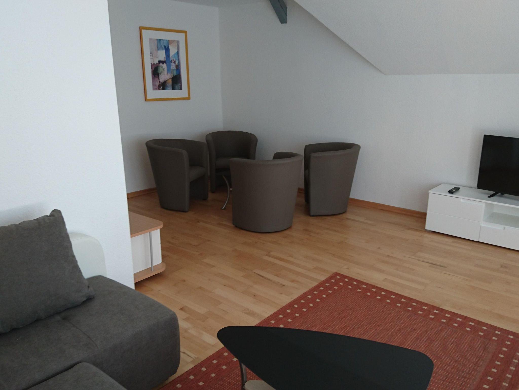 Das Wohnzimmer bietet mit Sofa und Clubsesseln die Möglichkeit zur Entspannung.