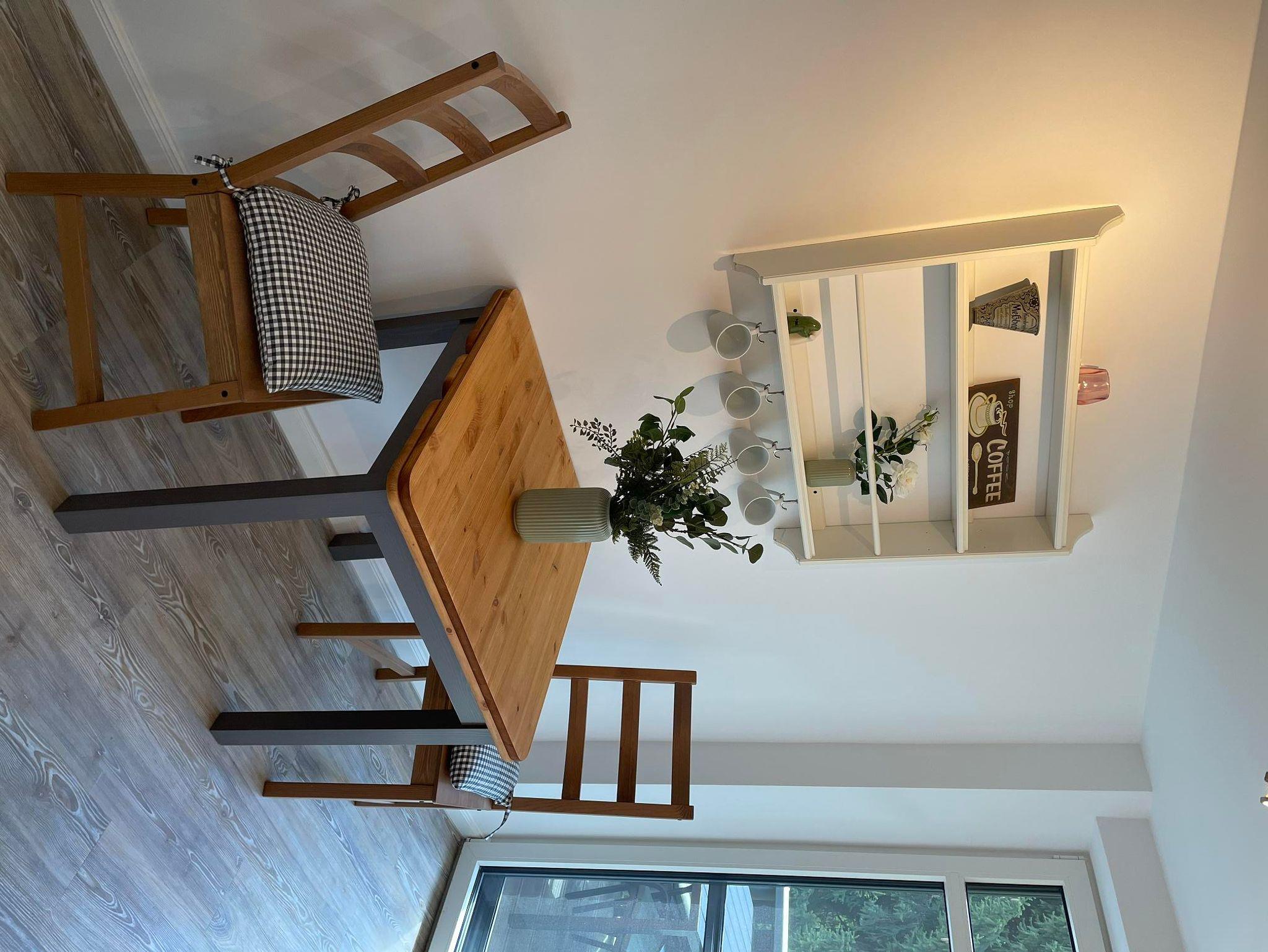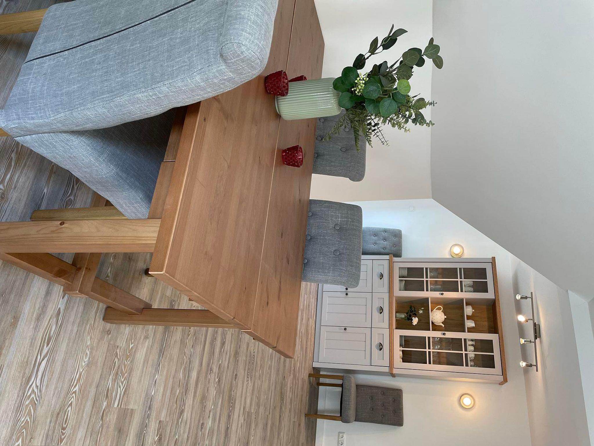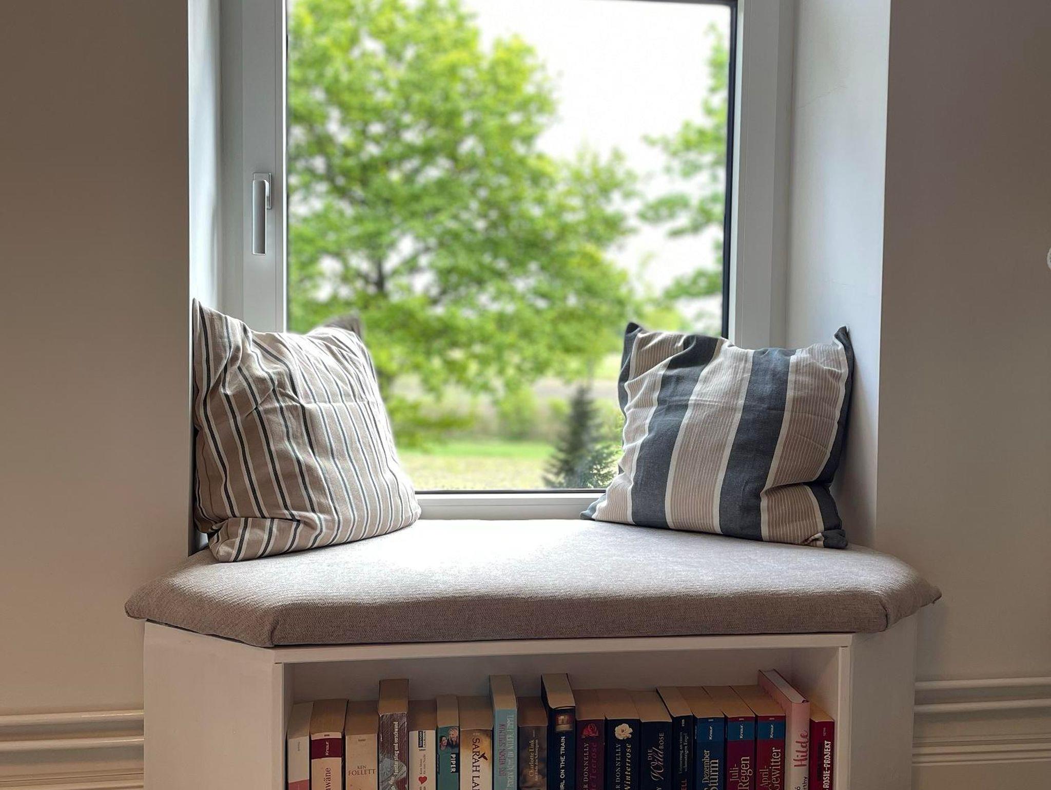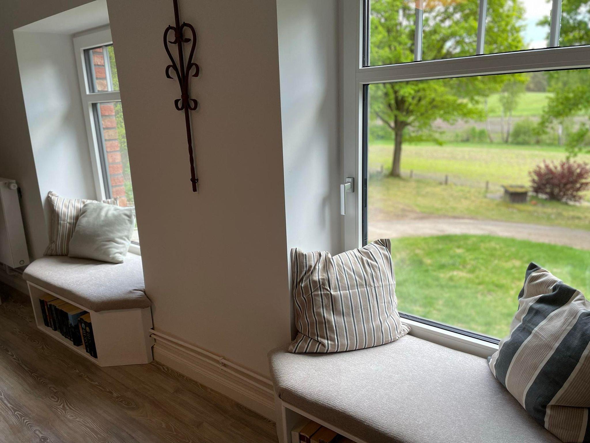Unsere Ferienwohnung Hermine befindet sich im Obergeschoss des Haupthauses und ist eine traumhafte Wohnung für Familien oder gruppen vo 4-6 Personen. Ihr habt einen tollen Balkon ganz für euch allein. Absolutes Highlight der Wohnung sind die beiden Windowseats im Wohnzimmer, die einen wundervollen, weiten Blick über Felder und Wiesen bieten und wunderbar zum Beobachten von Reh, Fuchs und Hase sind, während man es sich mit einem Buch gemütlich gemacht hat. In dem gemütliche Wohn- und Esszimmer hat man bequem Platz sich eine schöne Zeit zu machen. Im großen Schlafzimmer könnt ihr in einem 1,80 m Bett mal richtig schön in Mitten der Natur ausschlafen. Das zweite Schlafzimmer kann nach Wünschen ebenfalls mit einem 1,80 m Doppelbett vorbereitet werden, ist ansonsten aber mit zwei Einzelbetten ausgestattet. Die Schlafzimmer sind mit hochwertigen Dachschrägenfenstern ausgestattet, die voll verdunkelt werden können.