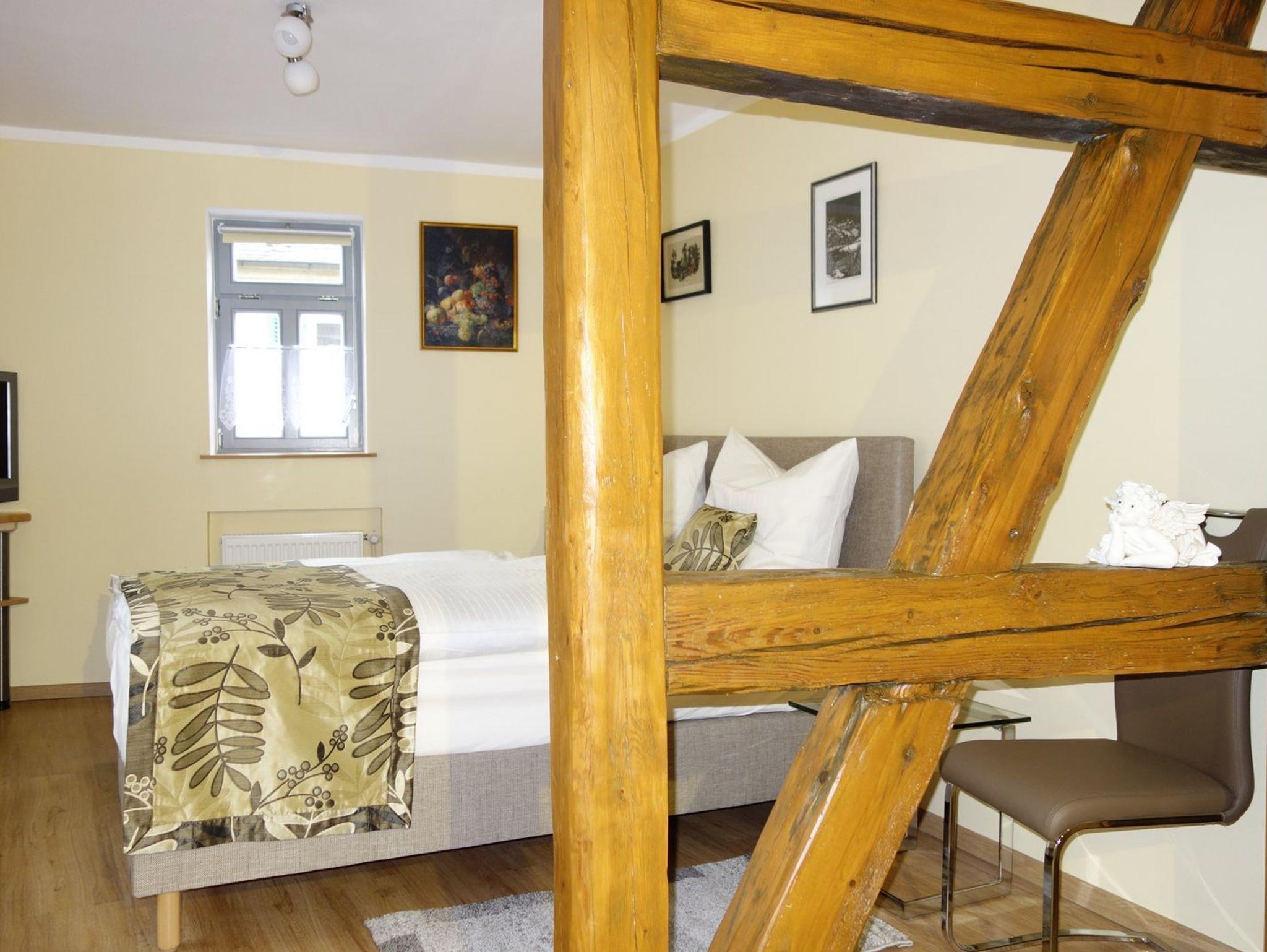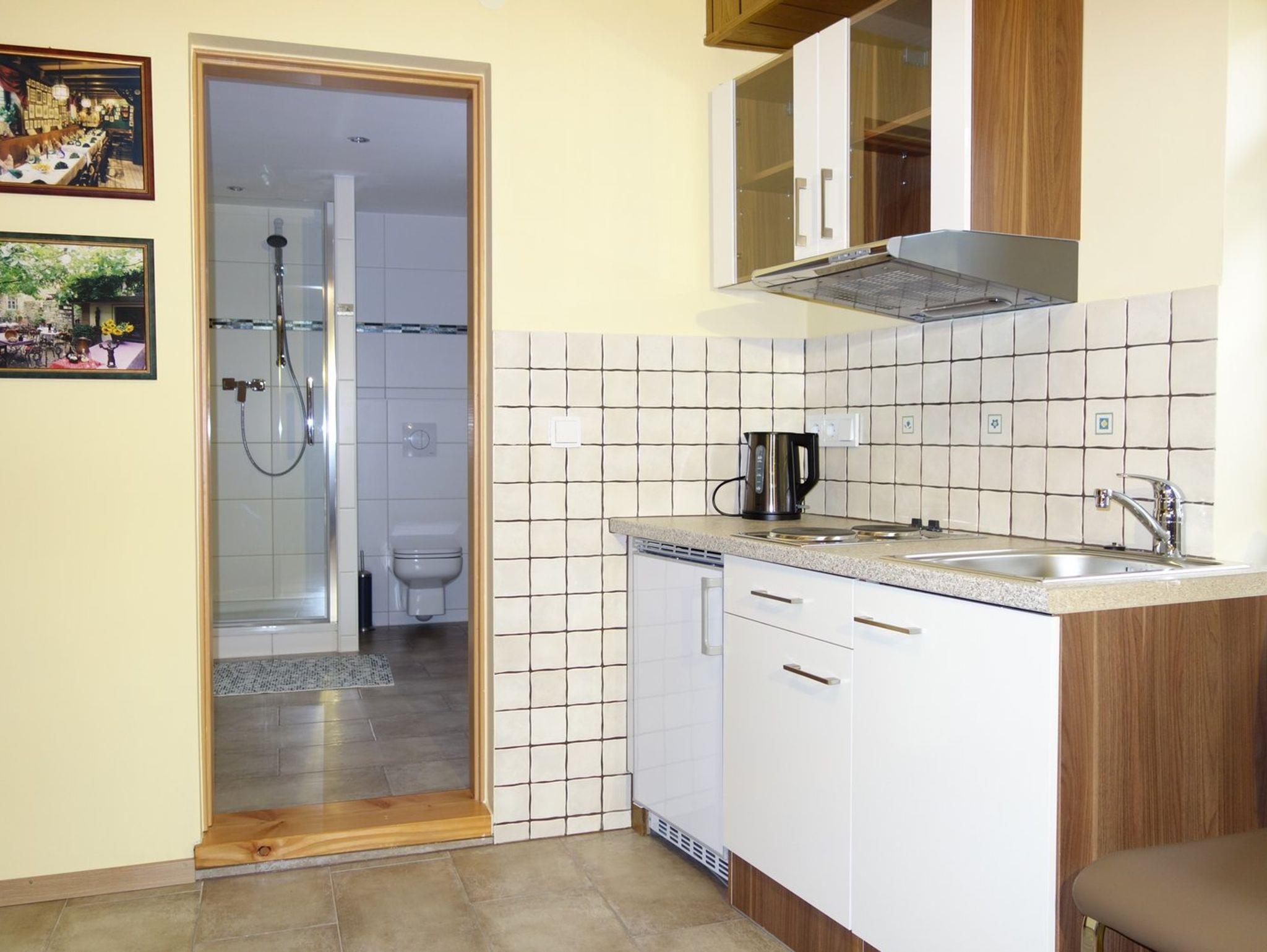 die zweite Ferienwohnung im Obergeschoss für 2 Personen (Schlafzimmer mit Wohnbereich inklusiv kleiner Küchenblock und Badezimmer) und das Doppelzimmer (Schlafzimmer mit kleinem Bad) ebenfalls Platz für 2 Personen.