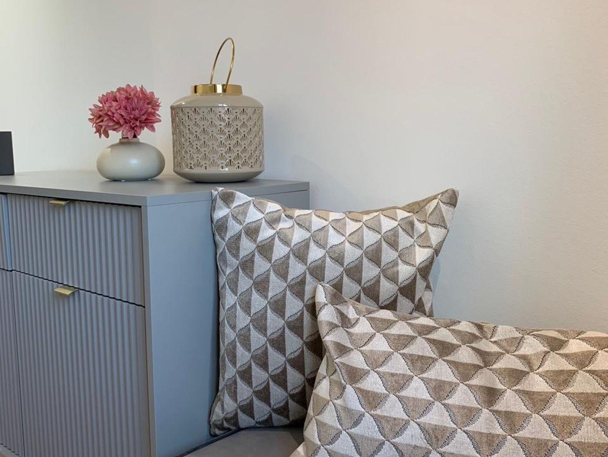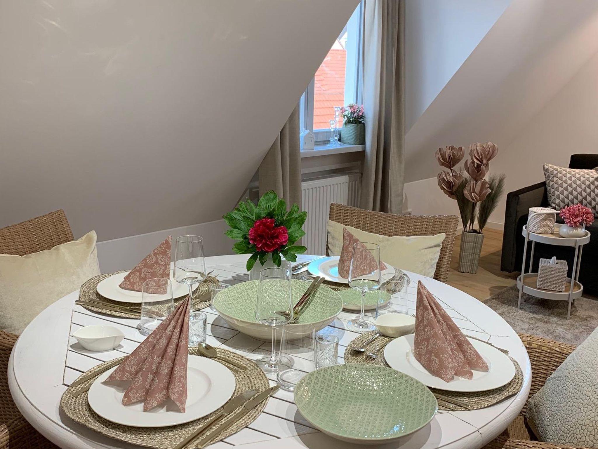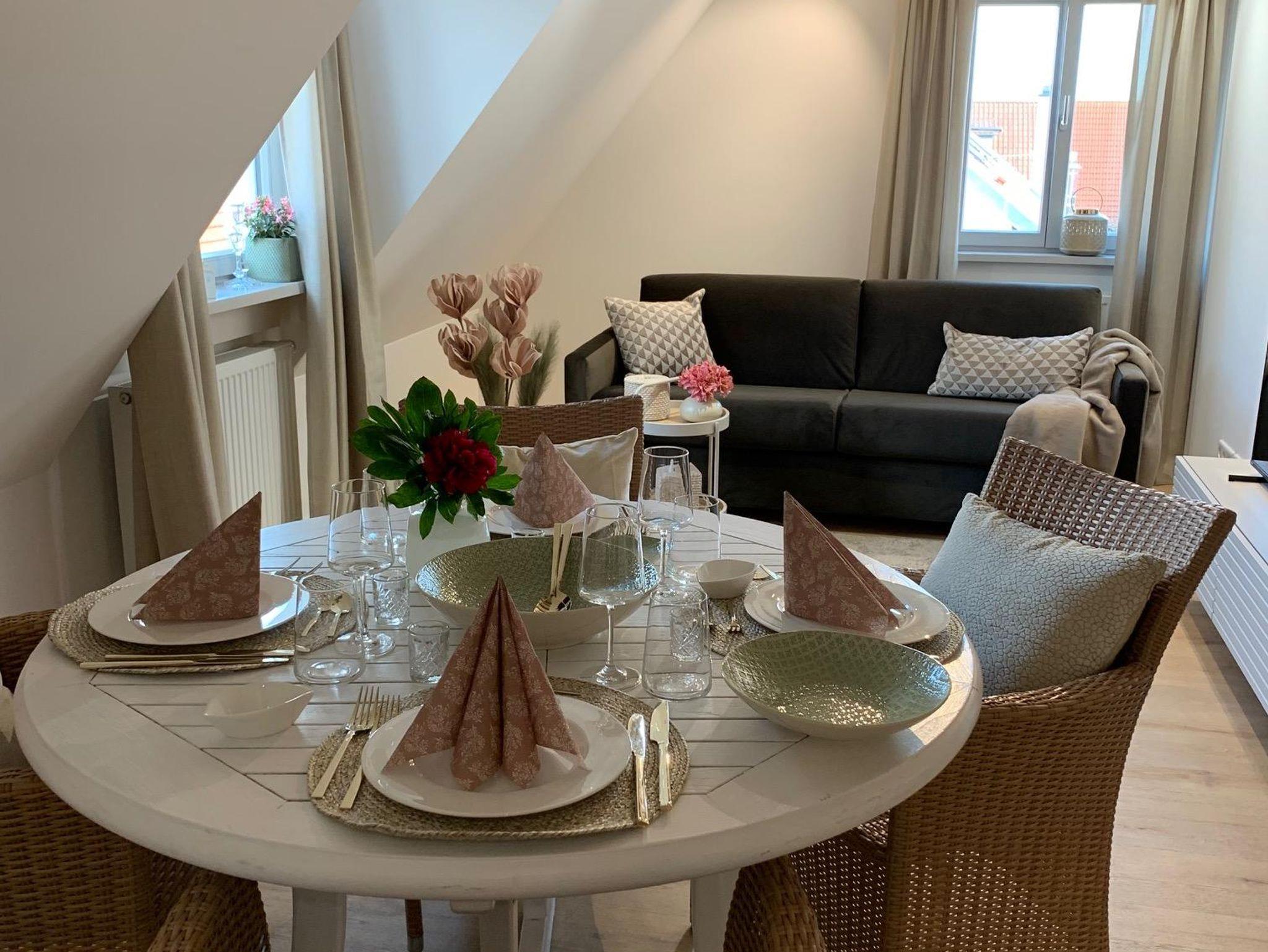 Im offenen Wohn-/Essbereich befindet sich das 1,60 m breite Schlafsofa zum Ausziehen und ein gemütlicher Essplatz für 4 Personen. Das separate Schlafzimmer hat ein 1,80 m breites Boxspringbett mit allergiefreundlicher Bettwäsche.