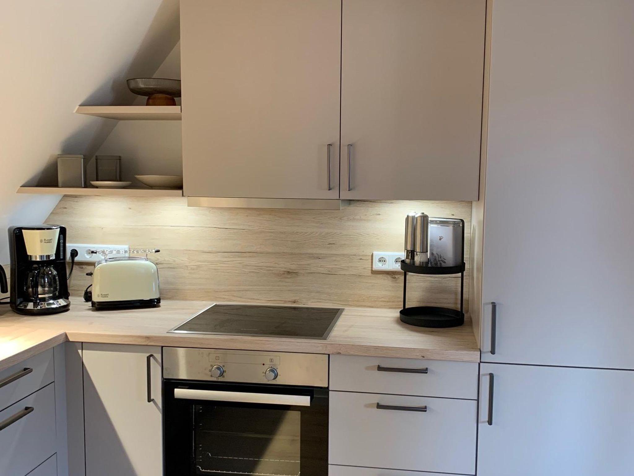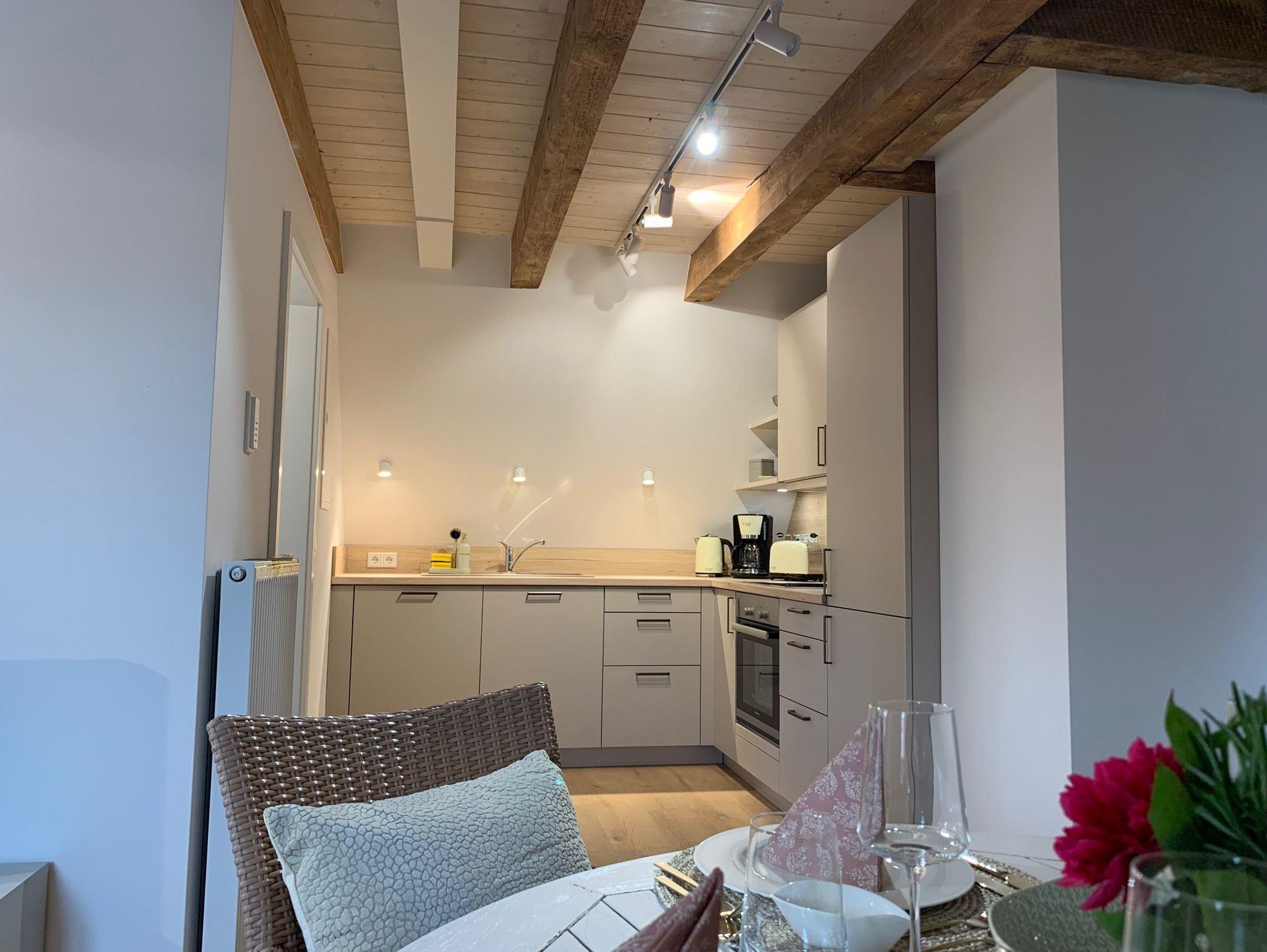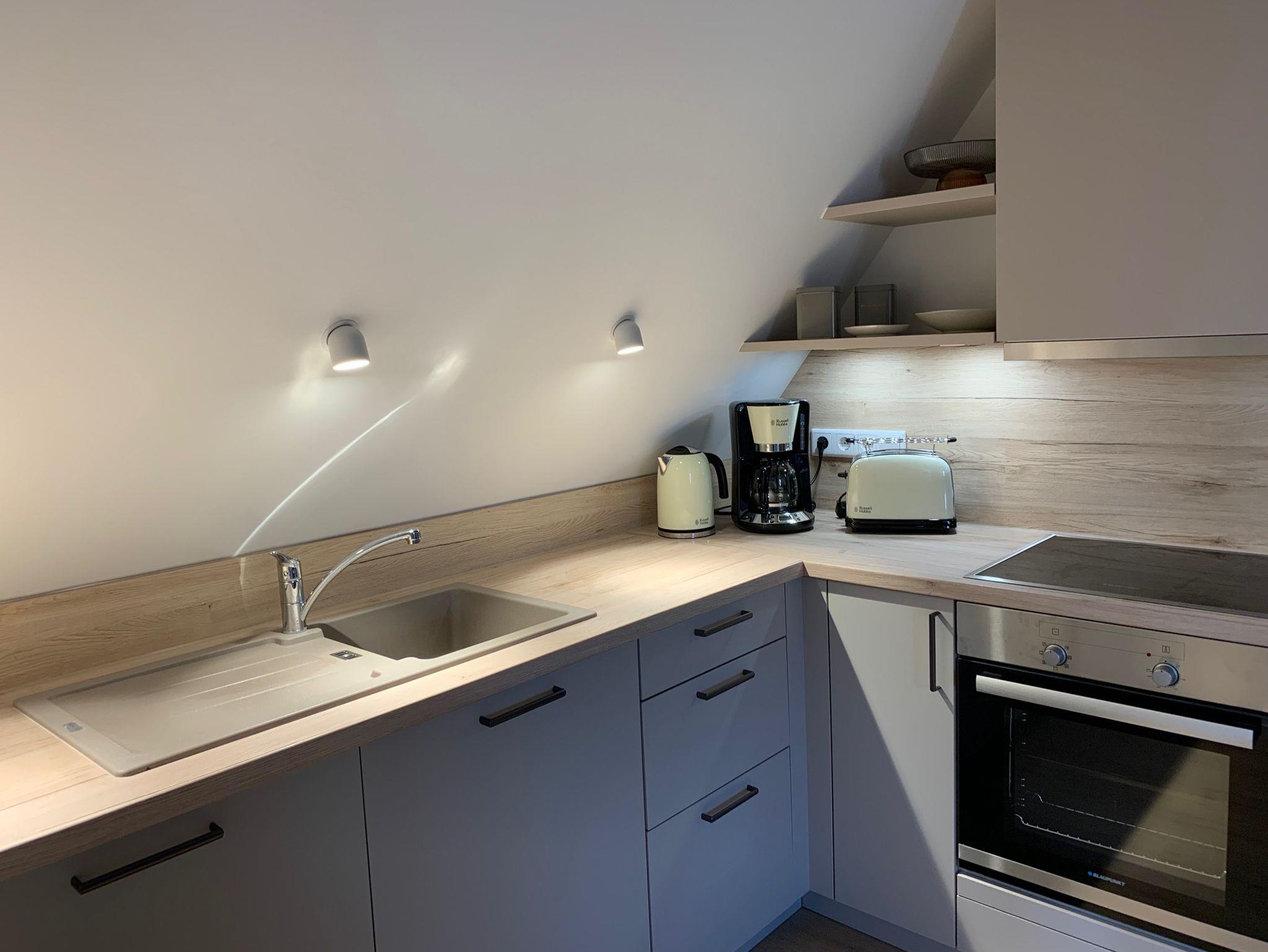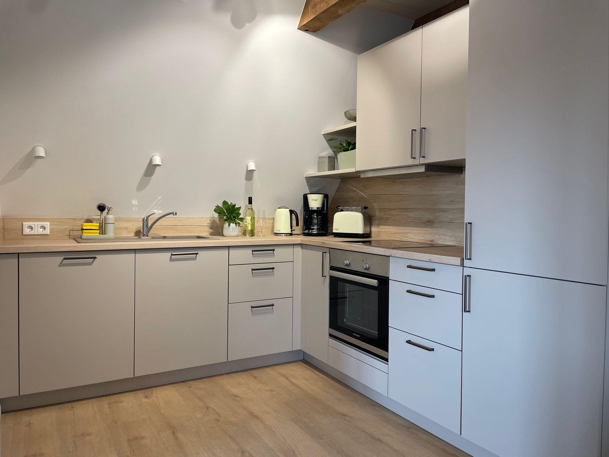 Die neue, hochwertig ausgestattete Einbauküche verfügt über Kühl- und Gefrierschrank, Spülmaschine, Kaffeemaschine, Toaster und Wasserkocher. Parkplätze sind öffentlich und kostenfrei an der Straße zu finden.