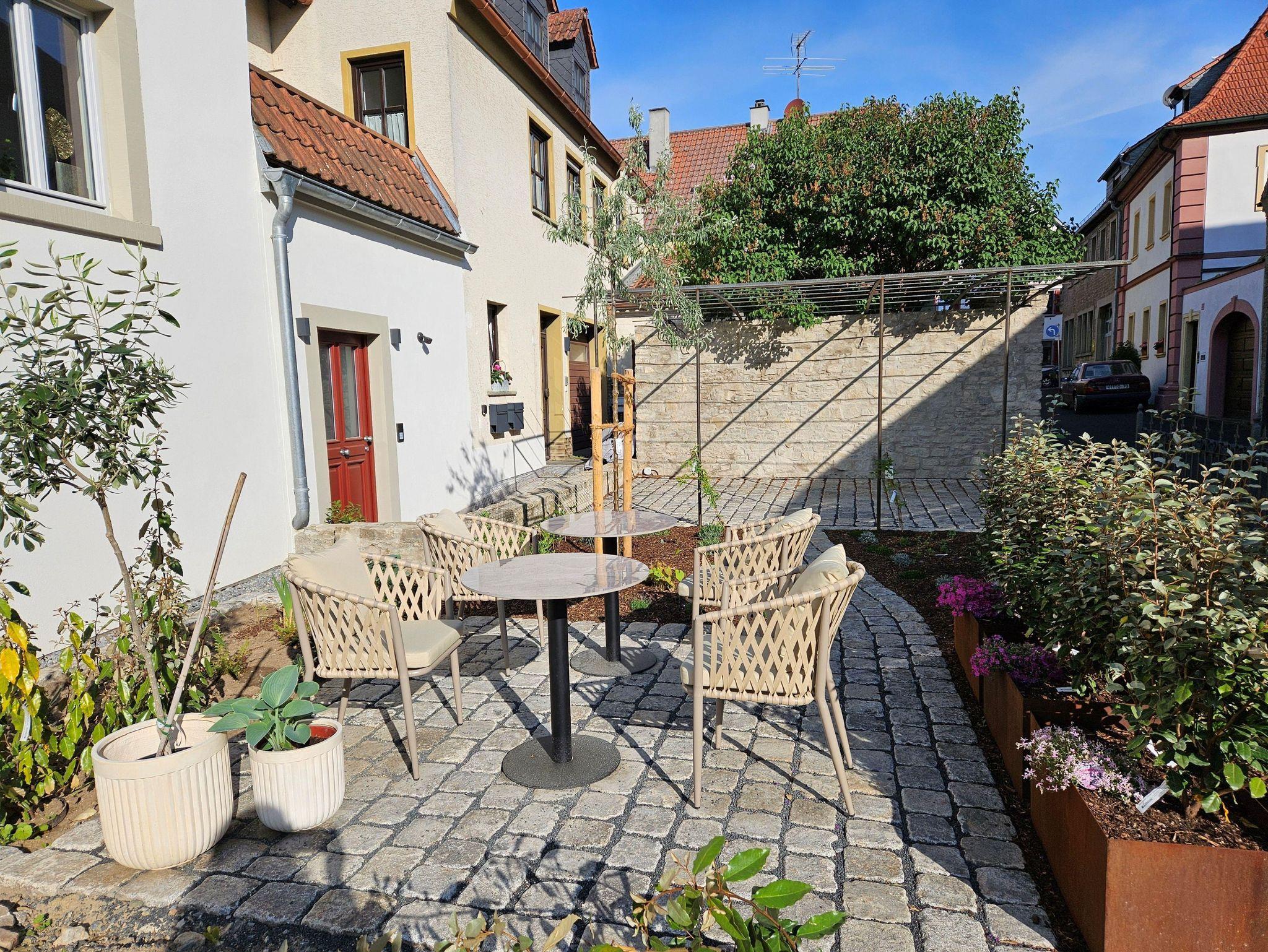 Wir freuen uns, Ihnen jetzt ganz neu auch eine Sitzgelegenheit in unserem kleinen Garten anbieten zu können. Genießen Sie die Zeit bei uns auch im Freien vor der Tür z. B. mit einem Glas Wein.