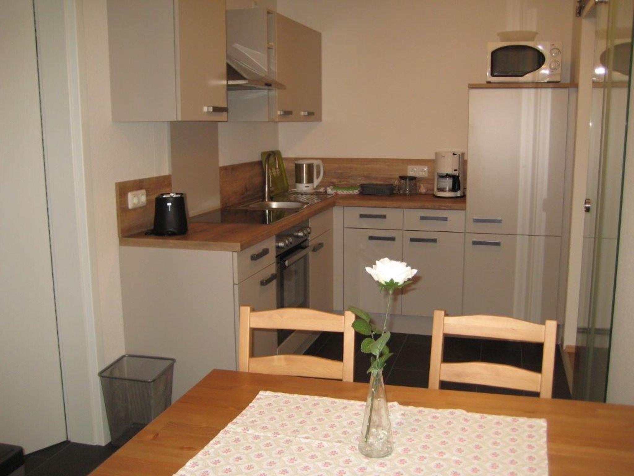- Küche mit Essecke(ausgestattet mit E-Herd, Backofen, Kühlschrank mit kleinem Gefrierfach, Dunstabzugshaube, Mikrowelle, Kaffeemaschine, Wasserkocher, Toaster, Geschirrtücher und Spülmittel)