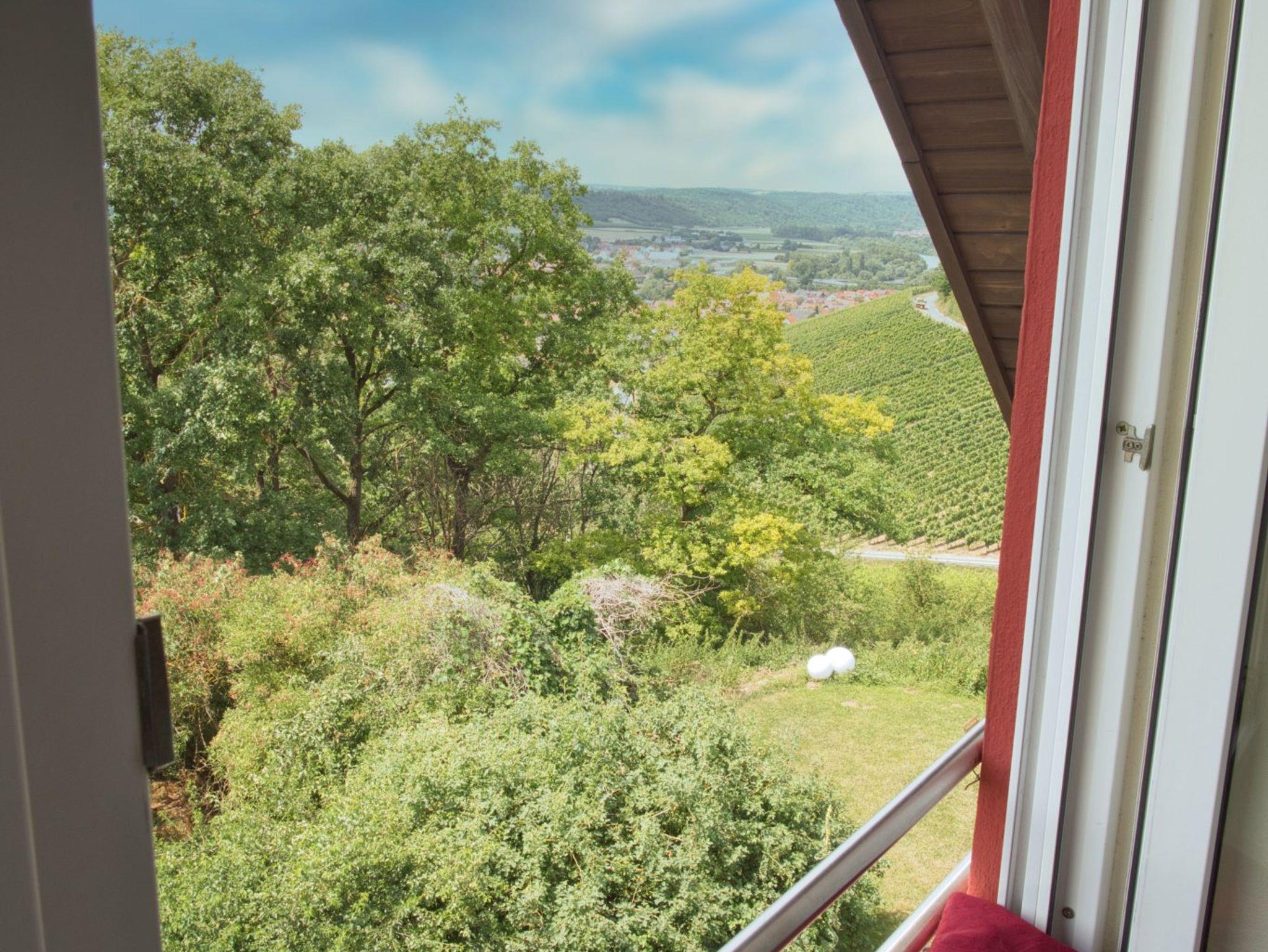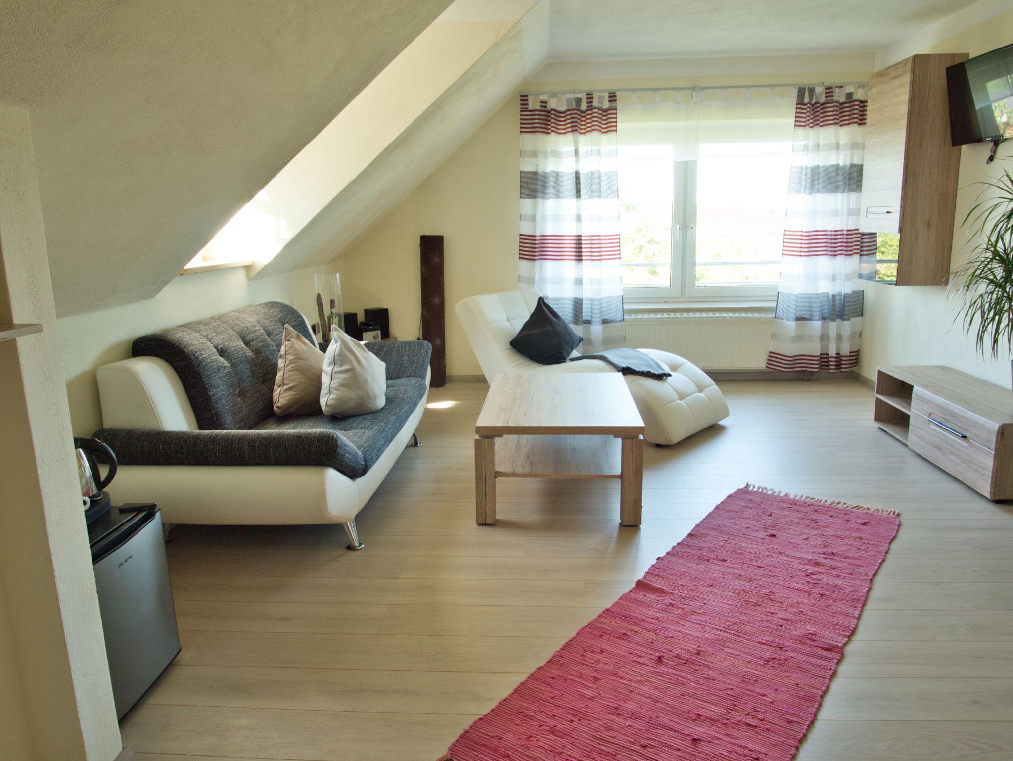 Unsere Junior Suite ist in der ersten Etage. für max. 2 Personen, mit einer Wohnfläche von ca. 45 m²: Folgende Ausstattung finden Sie hier vor: Wohnraum, Schlafraum, Bad mit Dusche, TV, Sitzgelegenheit, Föhn, Handtücher, kleiner Kühlschrank, Wasserkocher, Safe, im OG mit Panoramablick ins Maintal.
