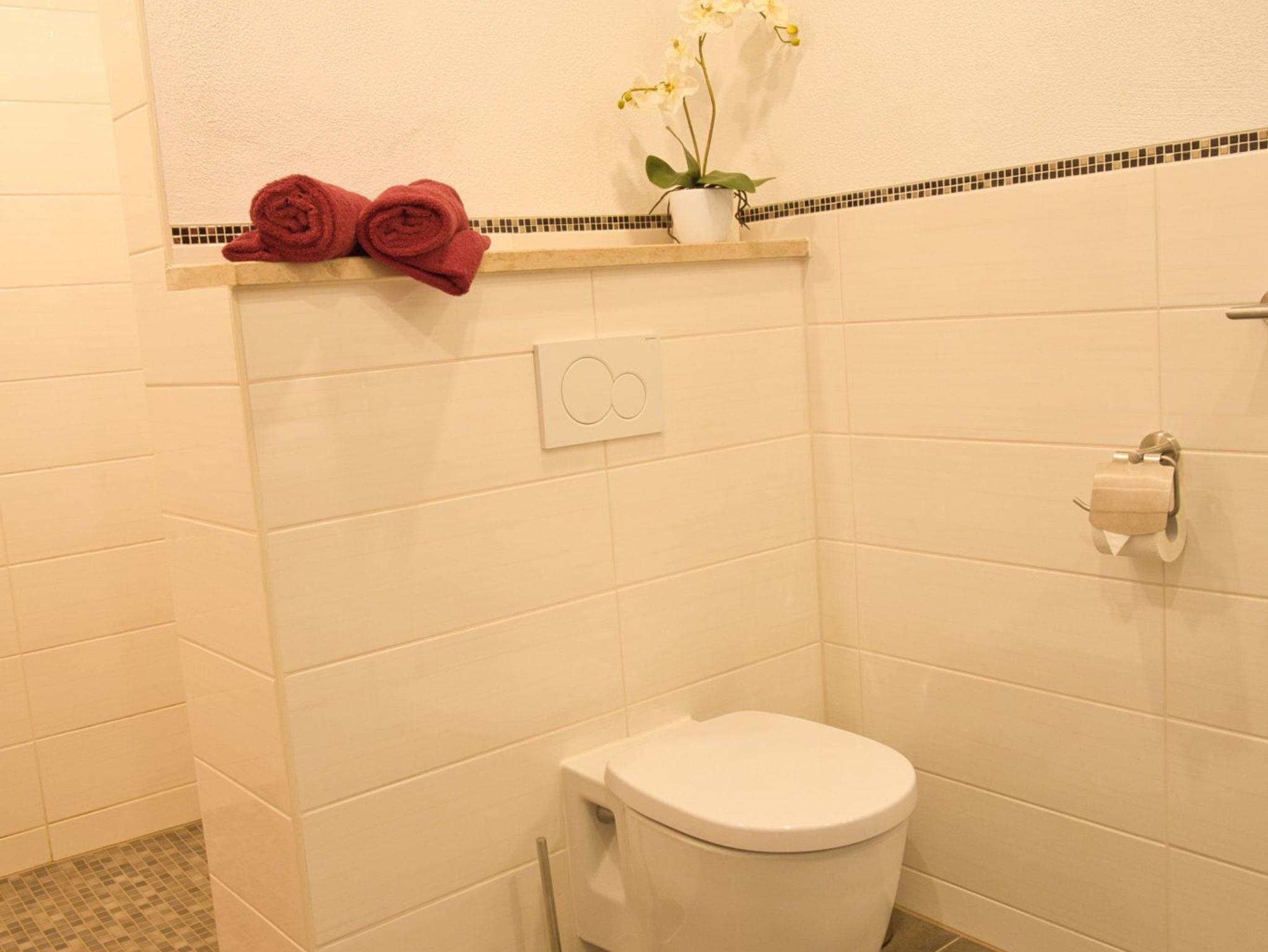 Bad mit ebenerdiger Dusche, Flachbildfernseher, kleiner Kühlschrank, Sitzgelegenheit. Eingang direkt zum Garten.