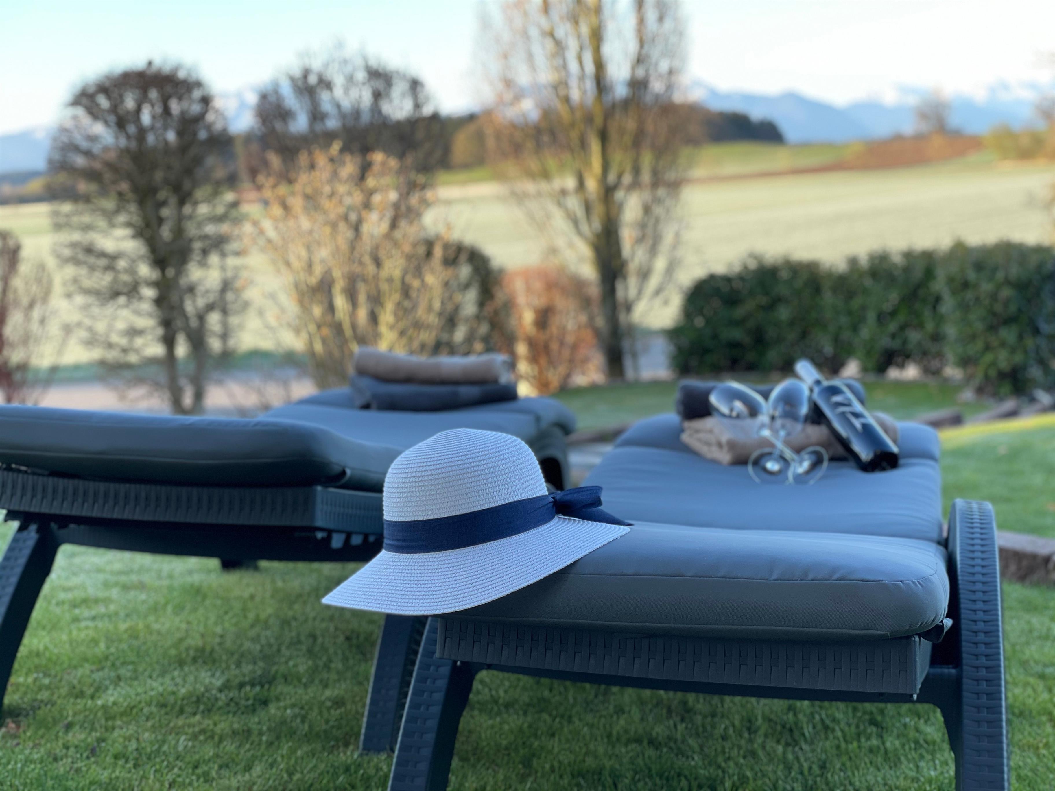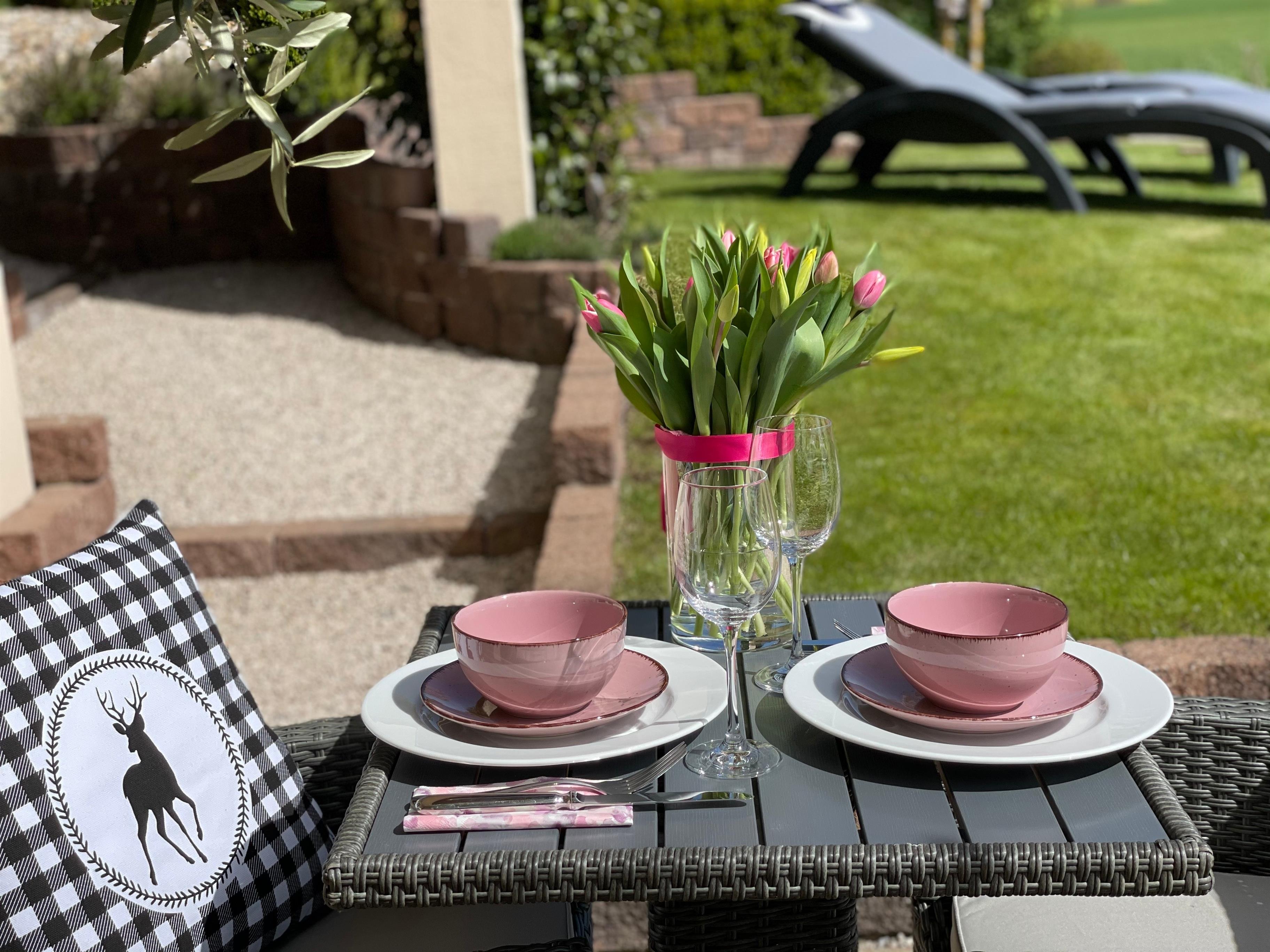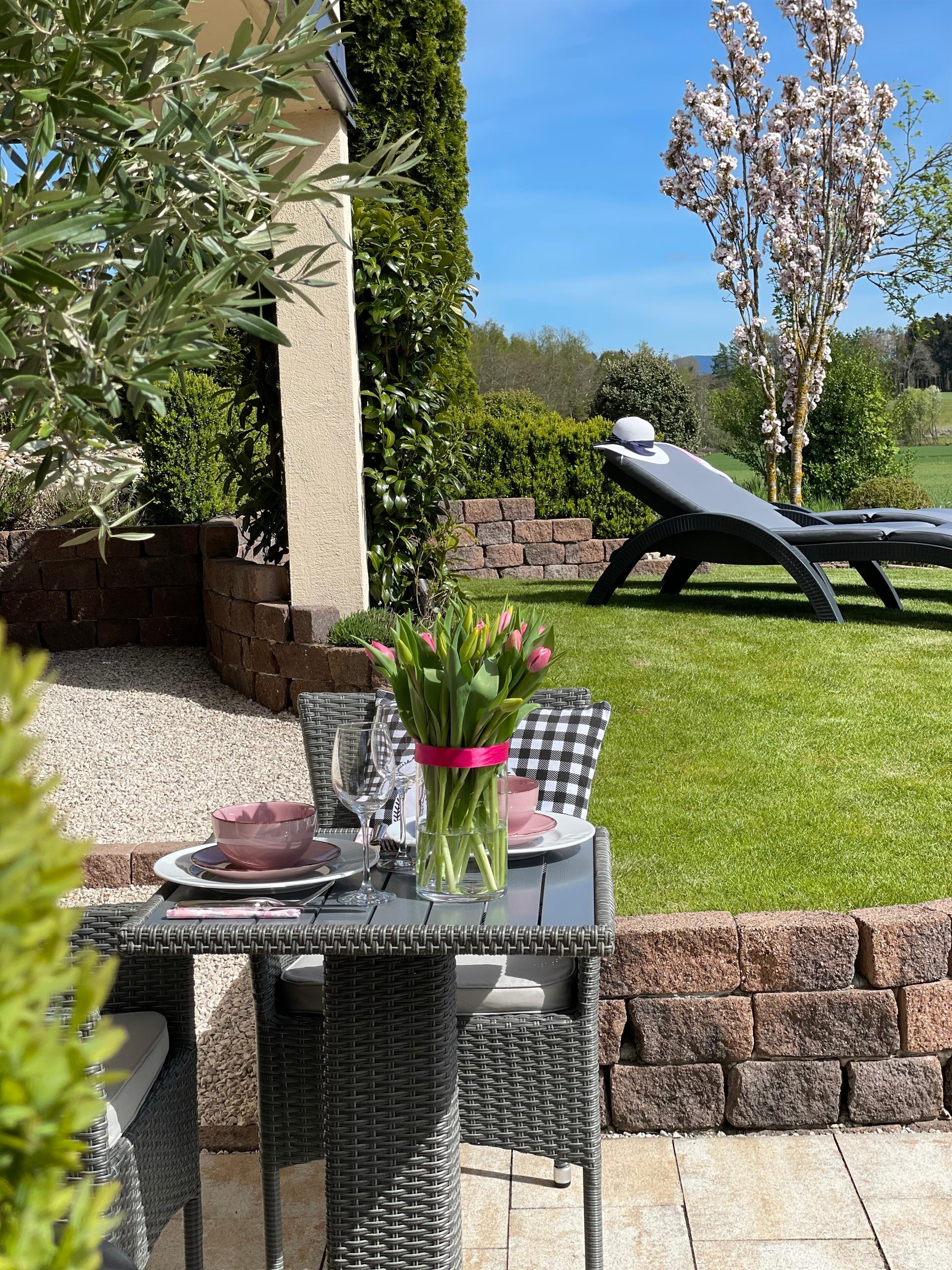 Auf dem eigenen Terrassenanteil mit angrenzendem Garten läßt sich wunderbar mit einem sonnigen Frühstück in einen erholsamen Urlaubstag starten. Selbstverständlich gehören auch Gartenmöbel & Ruheliegen dazu.