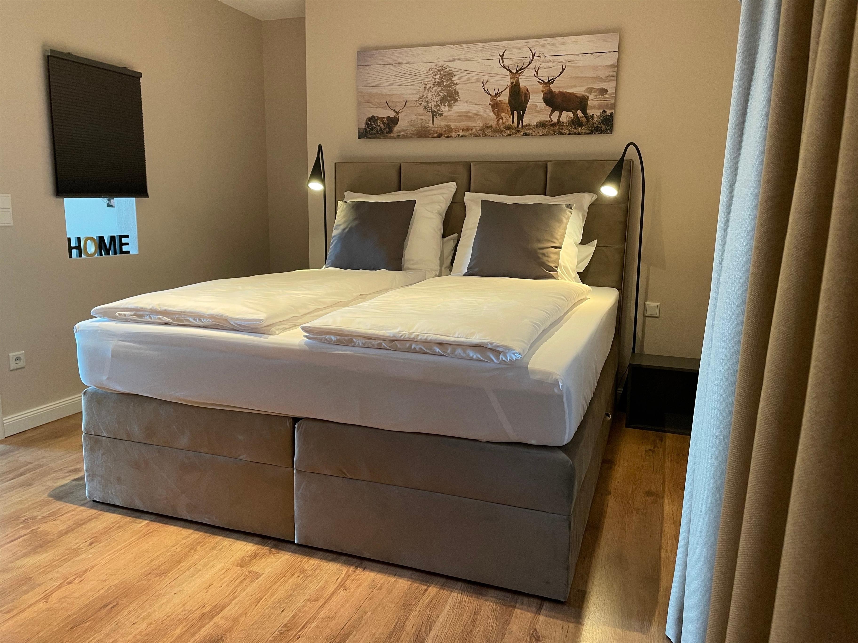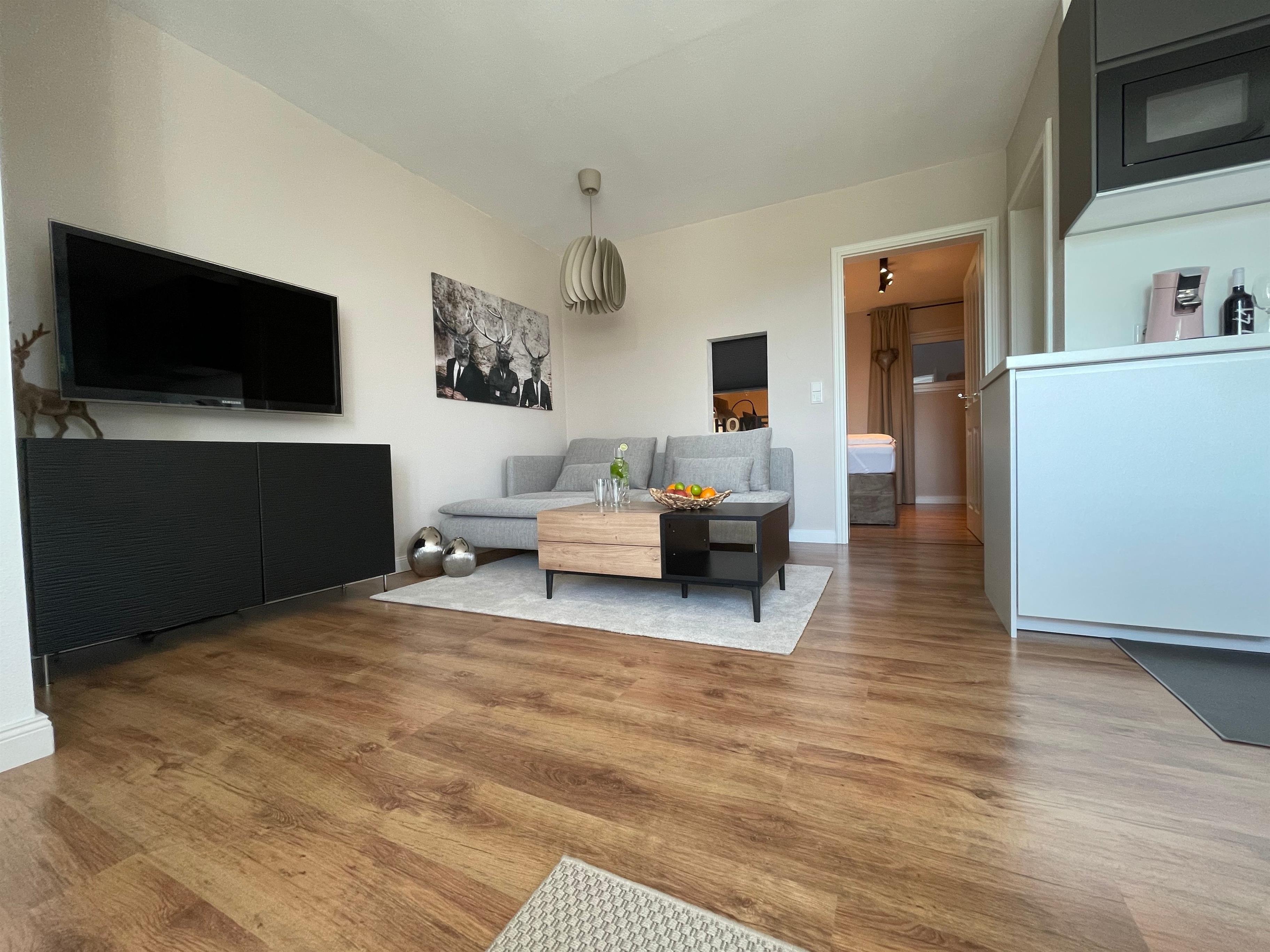 Ein großzügiger und heller Wohnbereich mit Couch, Flach-TV, Küchenzeile (inkl. Geschirrspüler, Cerankochfeld, Dunstabzug, Mikrowelle) und Esstisch. Ein separates Schlafzimmer mit Boxspring-Doppelbett (1,80 x 2,00m) bietet einen erholsamen Schlaf. Im Badezimmer befindet sich eine Dusche, WC, Fön und Spiegelschrank.