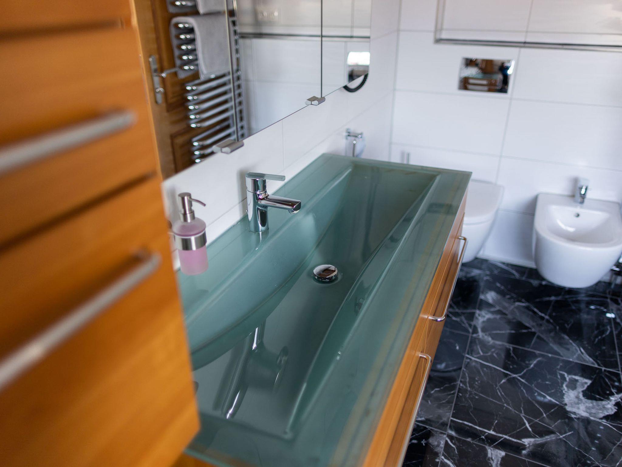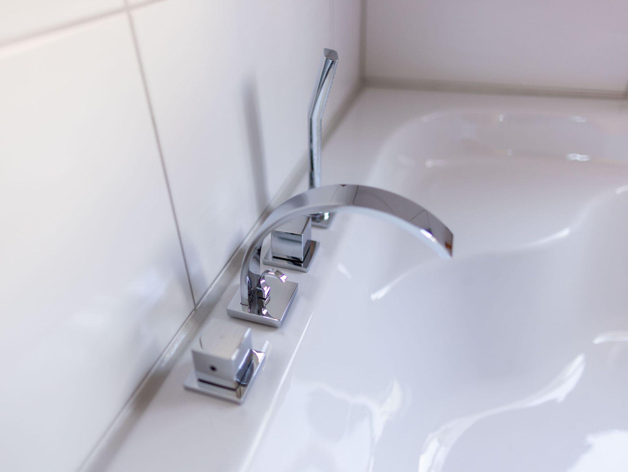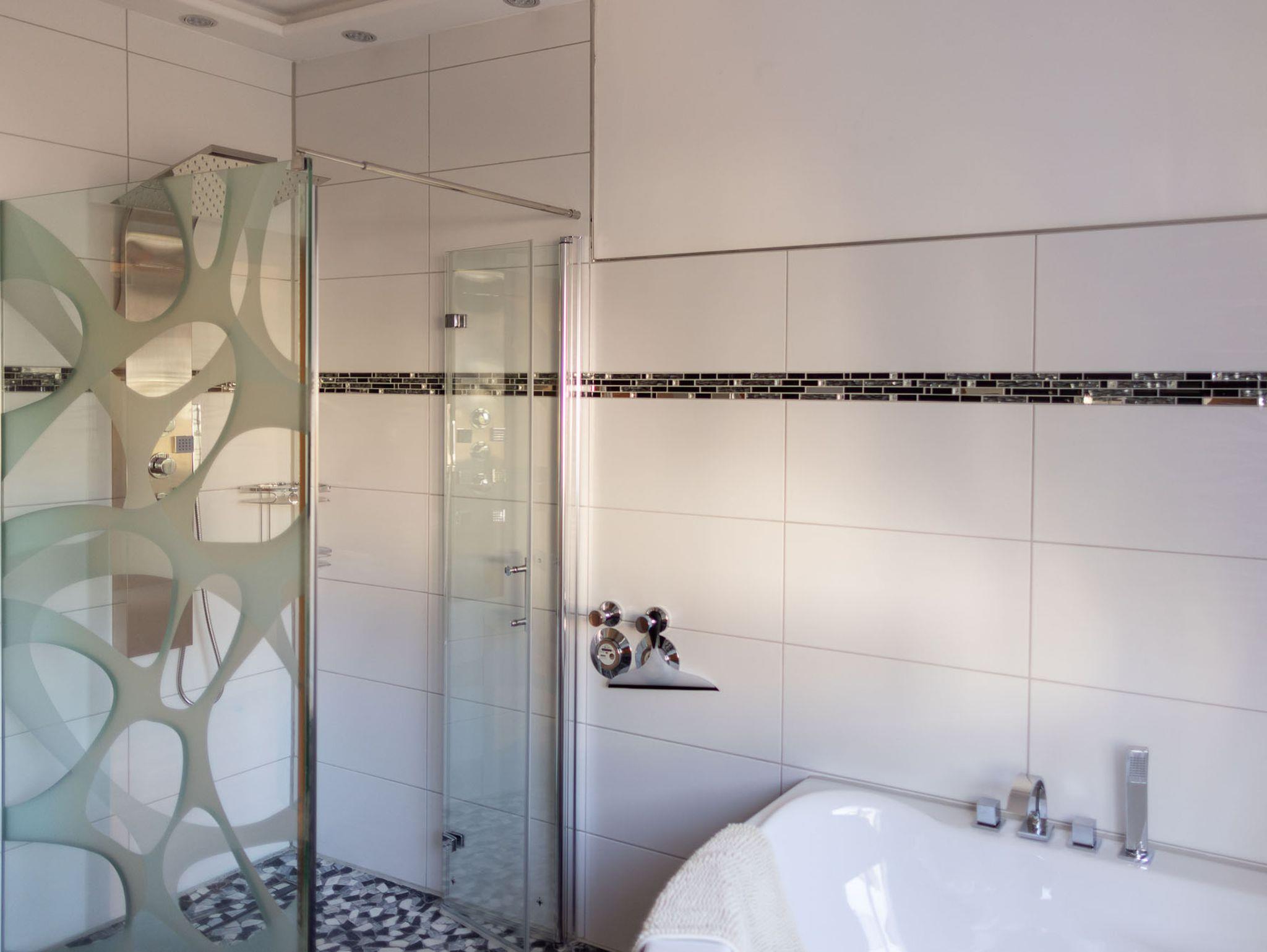 Das große geräumige helle Tageslicht Badezimmer mit großem Waschtisch, Handtuchwärmer, WC und Bidet einer Eckbadewanne und barrierefreier Regendusche lädt zum relaxen ein.