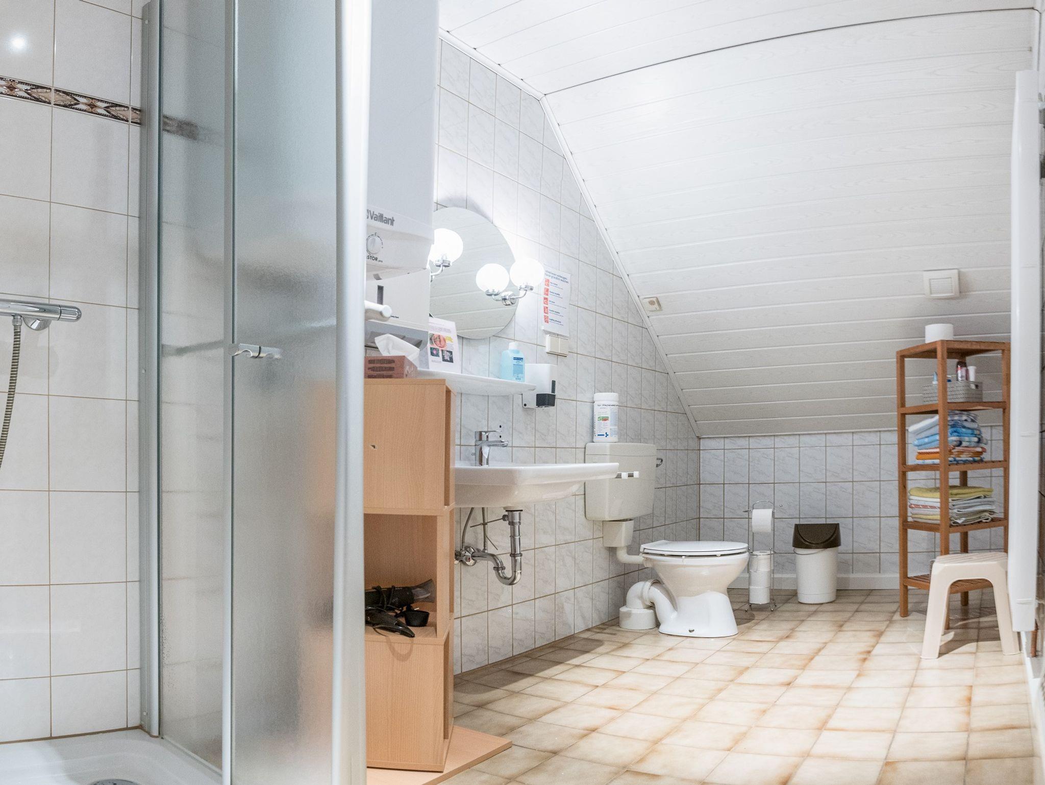 Unser liebevoll eingerichtetes Doppelzimmer ist ausgestattet mit Waschgelegenheit sowie Telefon, Wlan und Flachbild-Sat-TV, Tisch und vier Stühlen, Schrank, zwei Nachtschränken, Beinem Doppelbett mit zwei verstellbaren Lattenrosten und Leselampen sowie einer Ausziehcouch, einem Sitzhocker und einem Bücherregal. Zwei Bäder mit Dusche/WC befinden sich auf der Etage, ebenso eine Kaffee- und Teestation sowie eine Leseecke mit verschiedener Lektüre.